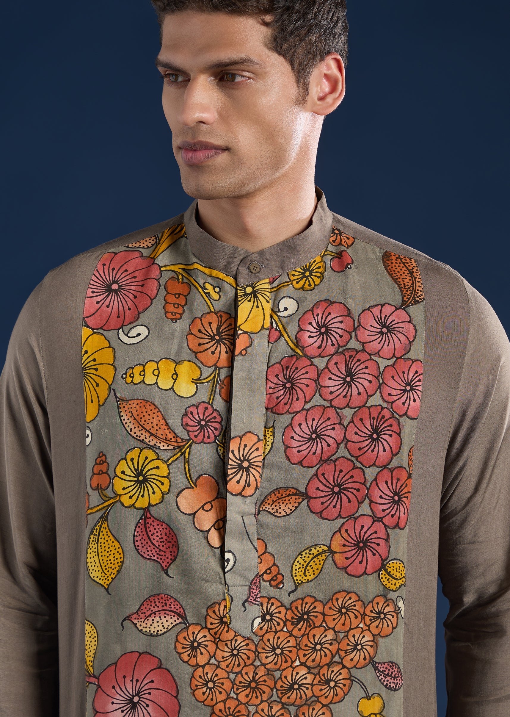 Artisanal and refined, this grey kurta set features handpainted Kalamkari detailing on a silk–linen blend base. Designed with a mandarin collar, full sleeves, and side slits, it blends traditional craft... More Product Details