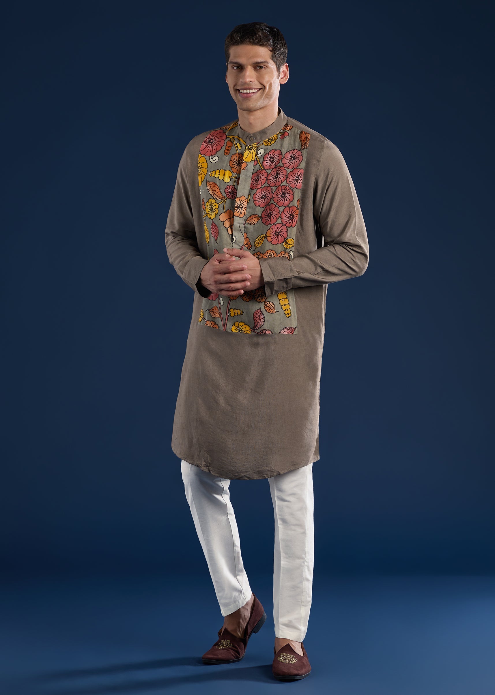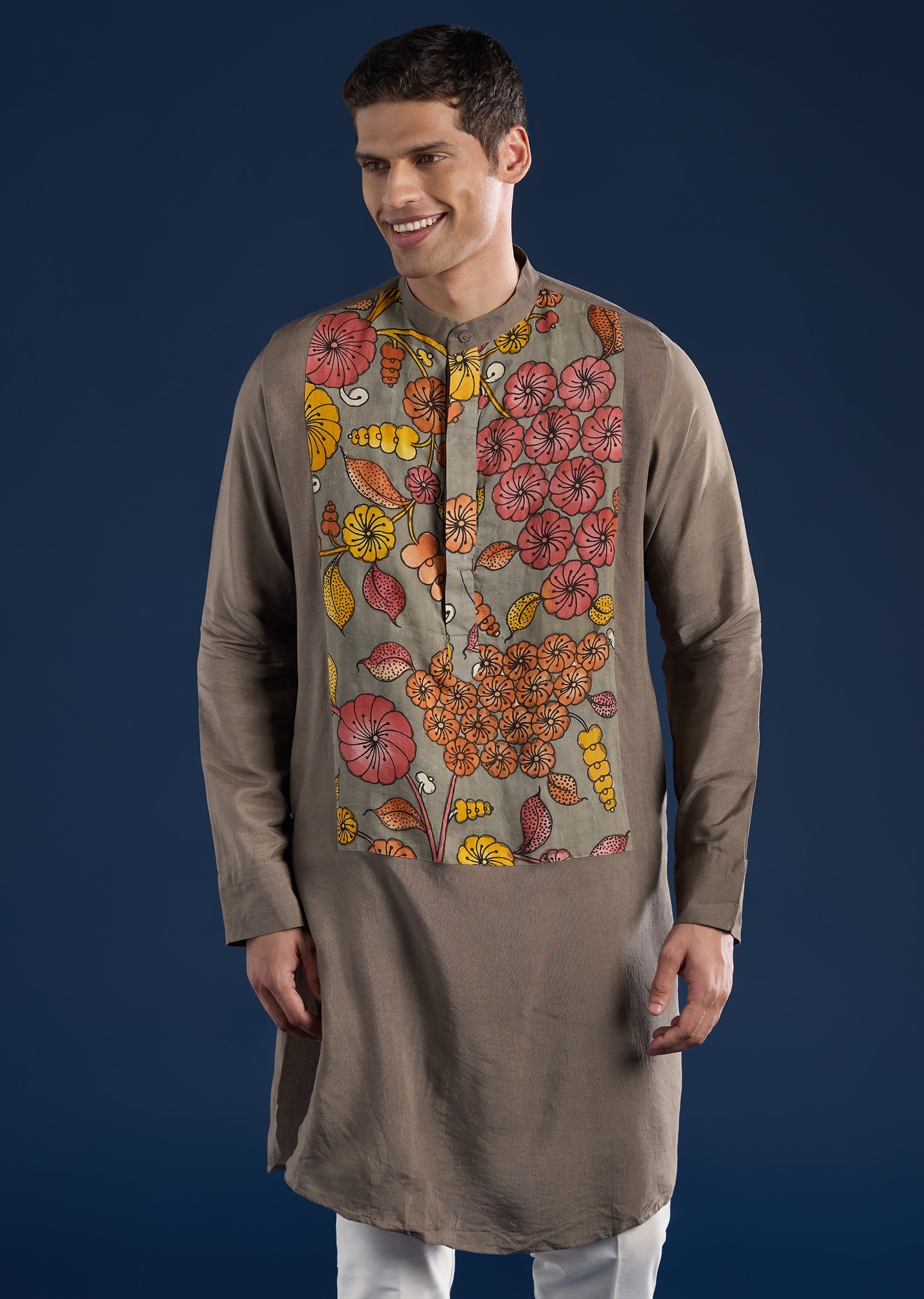 Artisanal and refined, this grey kurta set features handpainted Kalamkari detailing on a silk–linen blend base. Designed with a mandarin collar, full sleeves, and side slits, it blends traditional craft with everyday elegance. Paired with straight-fit trousers, it is ideal for festive occasions. Awarded as the Most Trusted Brand, we're delivering styles you love, just as promised.