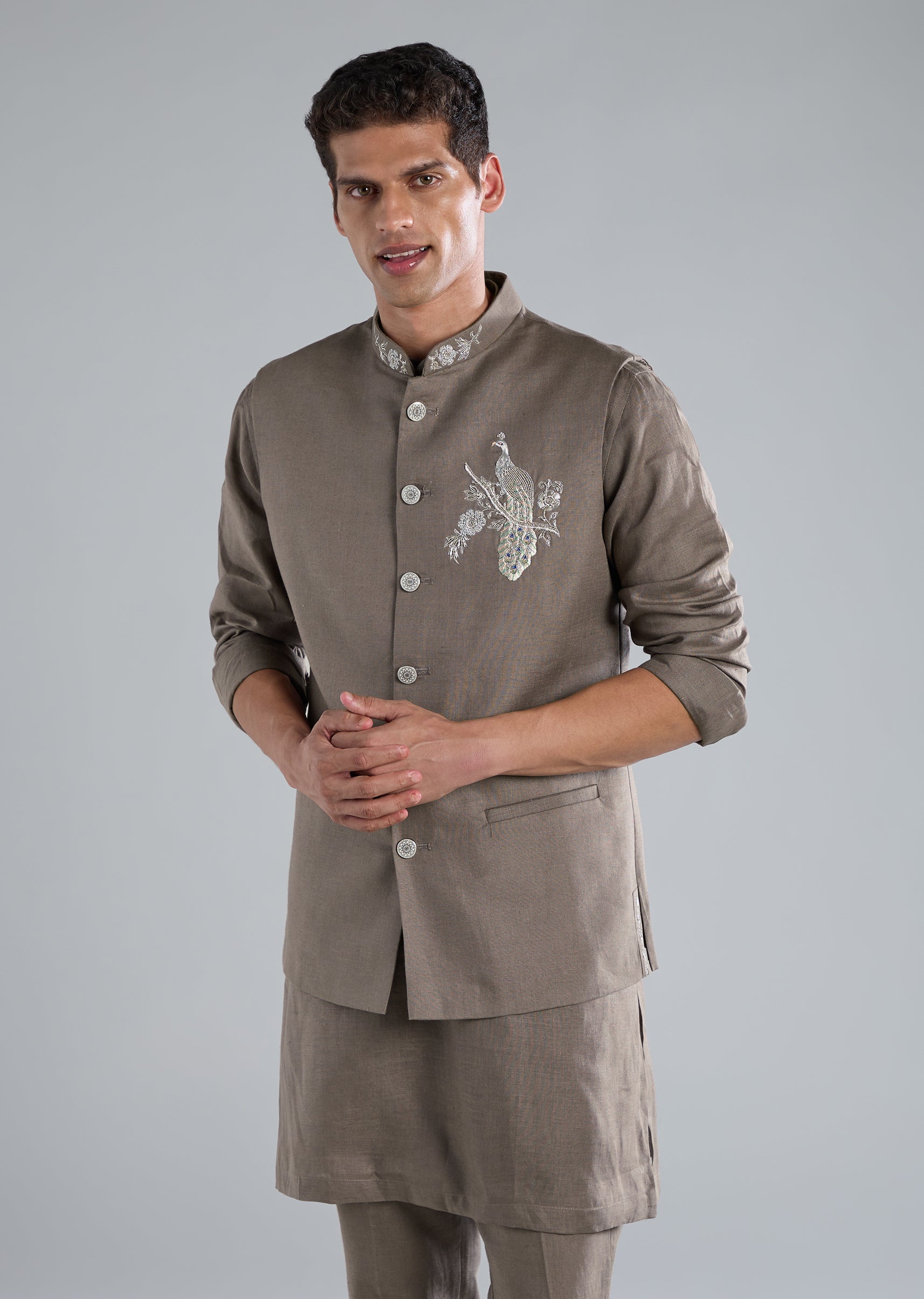Soft and refined, this grey kurta jacket set is crafted in pure linen and highlighted with intricate zardosi hand work perfect for pastel festive themes. The full sleeve silhouette and... More Product Details