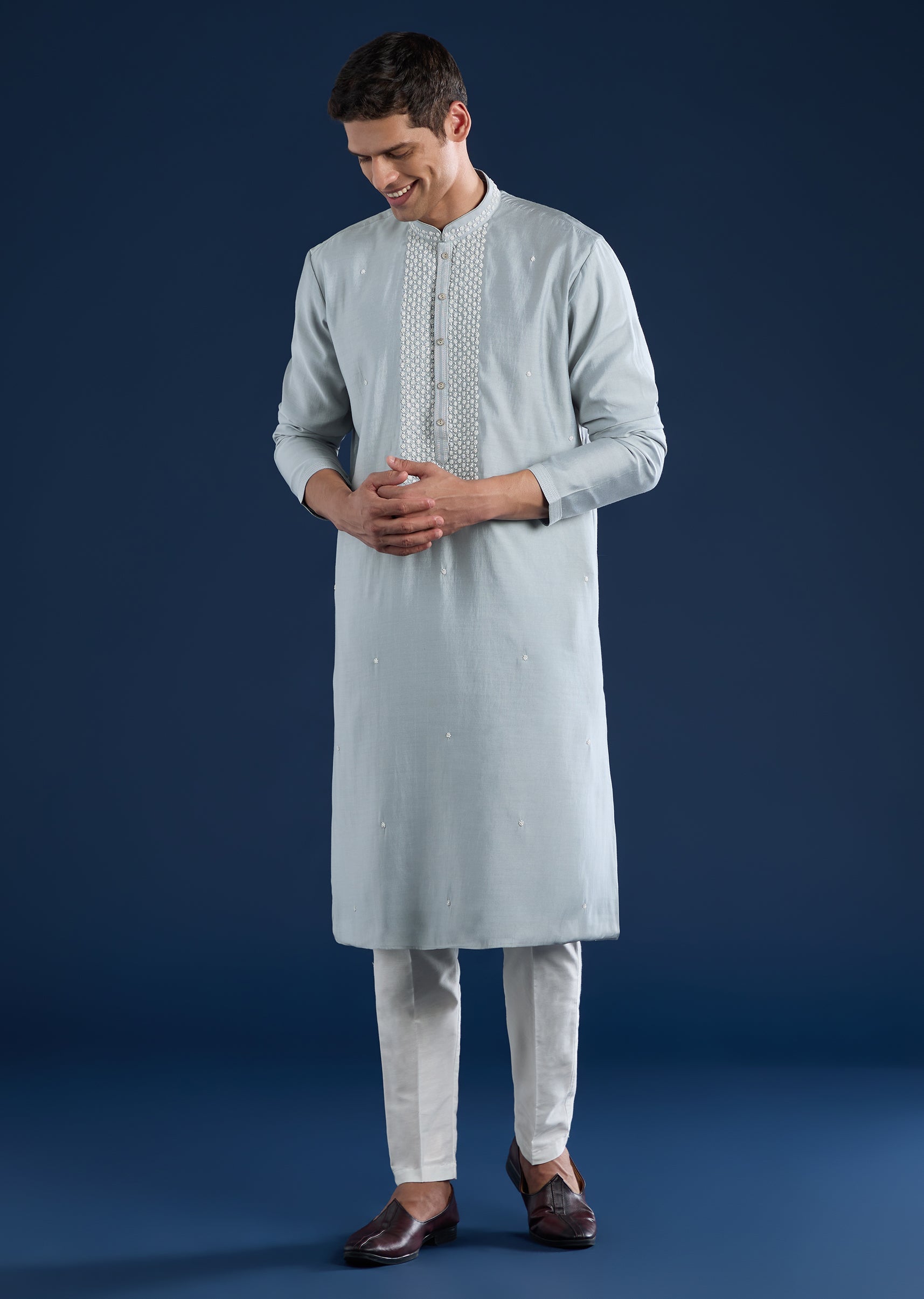 This grey kurta set is crafted in art silk with refined resham detailing for a minimal, elevated finish. Designed with a mandarin collar, full sleeves, and side slits, it pairs... More Product Details