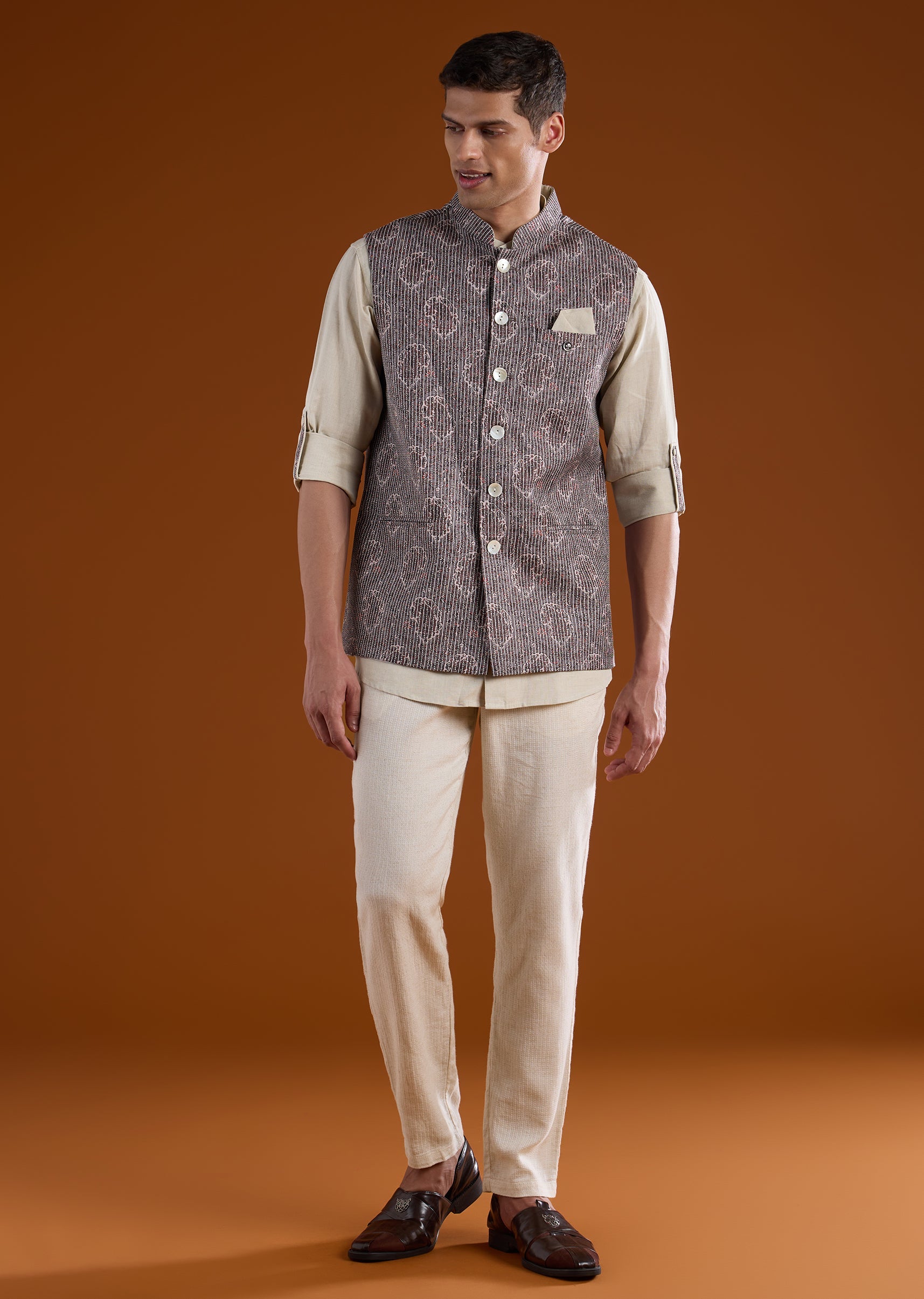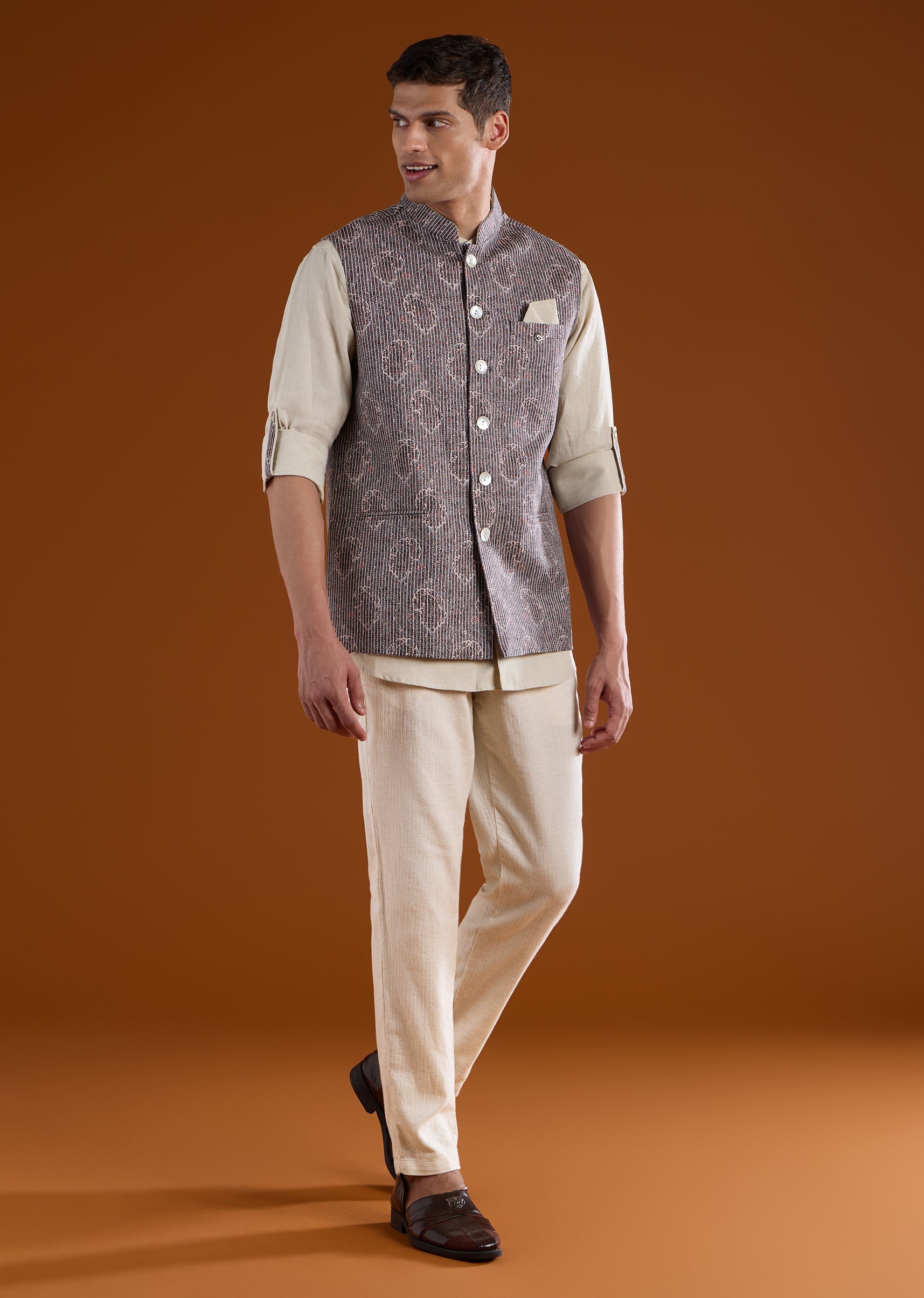 Effortlessly festive with understated elegance, this grey kurta jacket set is crafted in breathable linen blends for comfort and style. The kurta features a mandarin collar and full sleeves, paired with a printed jacket that adds a refined statement. Finished with straight-fit trousers and a partially elasticated waist, this set is ideal for wedding functions, festive gatherings, and celebratory occasions. Awarded as the Most Trusted Brand, we're delivering styles you love, just as promised.