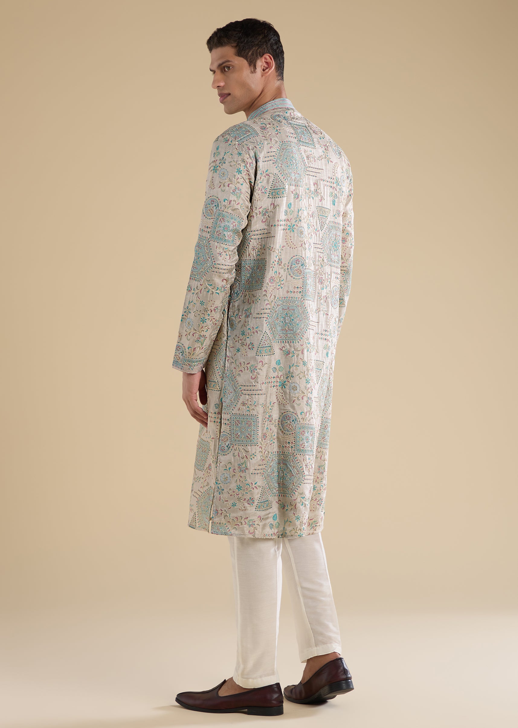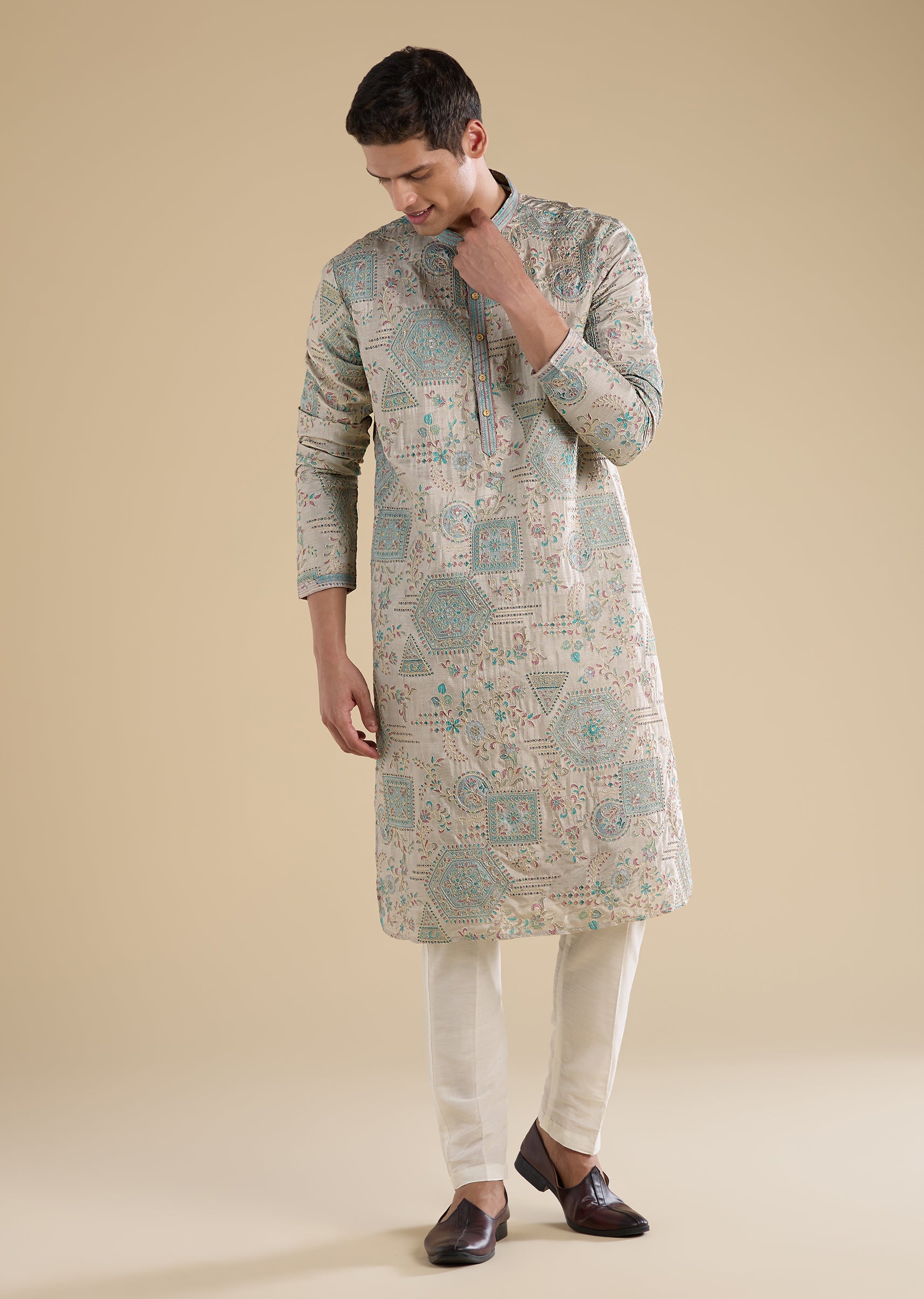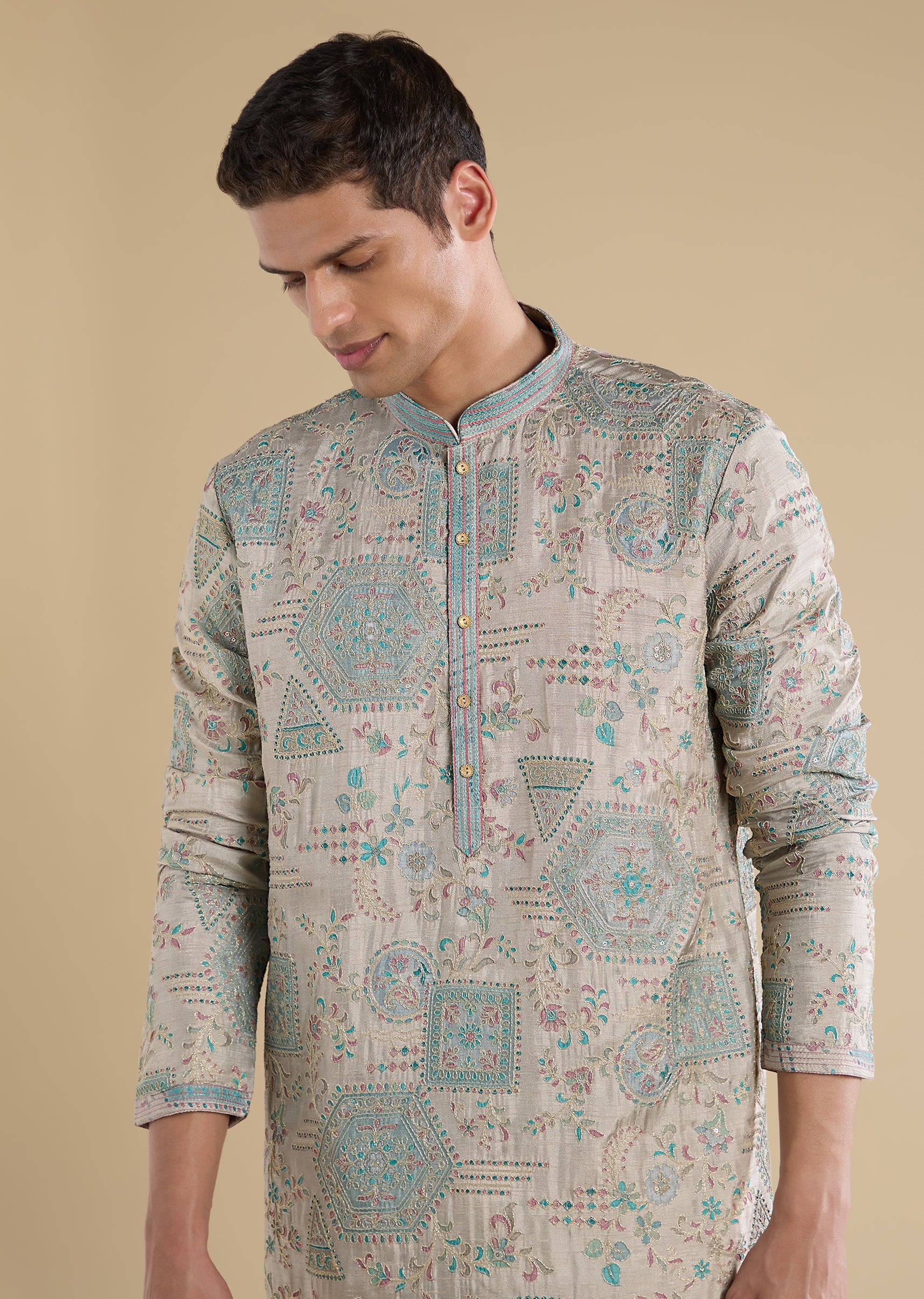 Clean and contemporary, this grey kurta set is designed for refined festive dressing. Crafted in smooth art silk, it features a mandarin collar, full sleeves, and minimal resham thread detailing... More Product Details