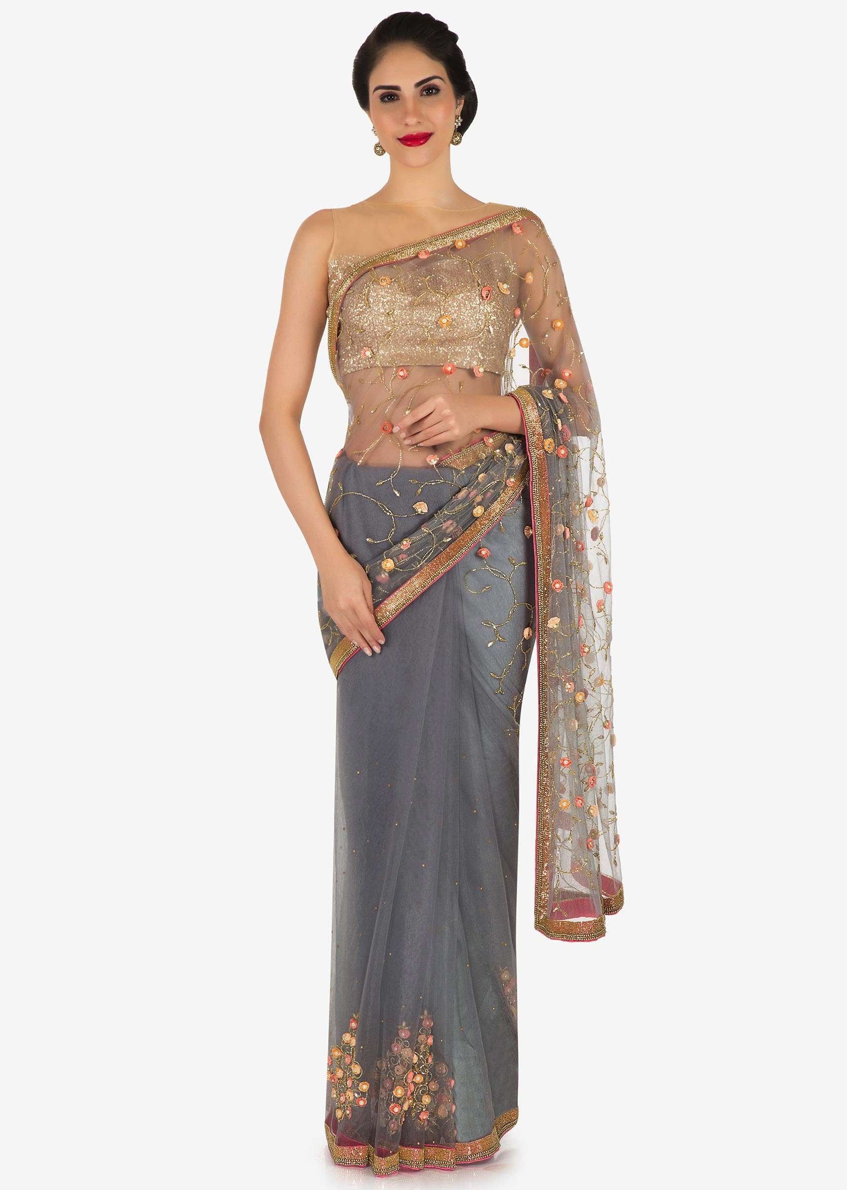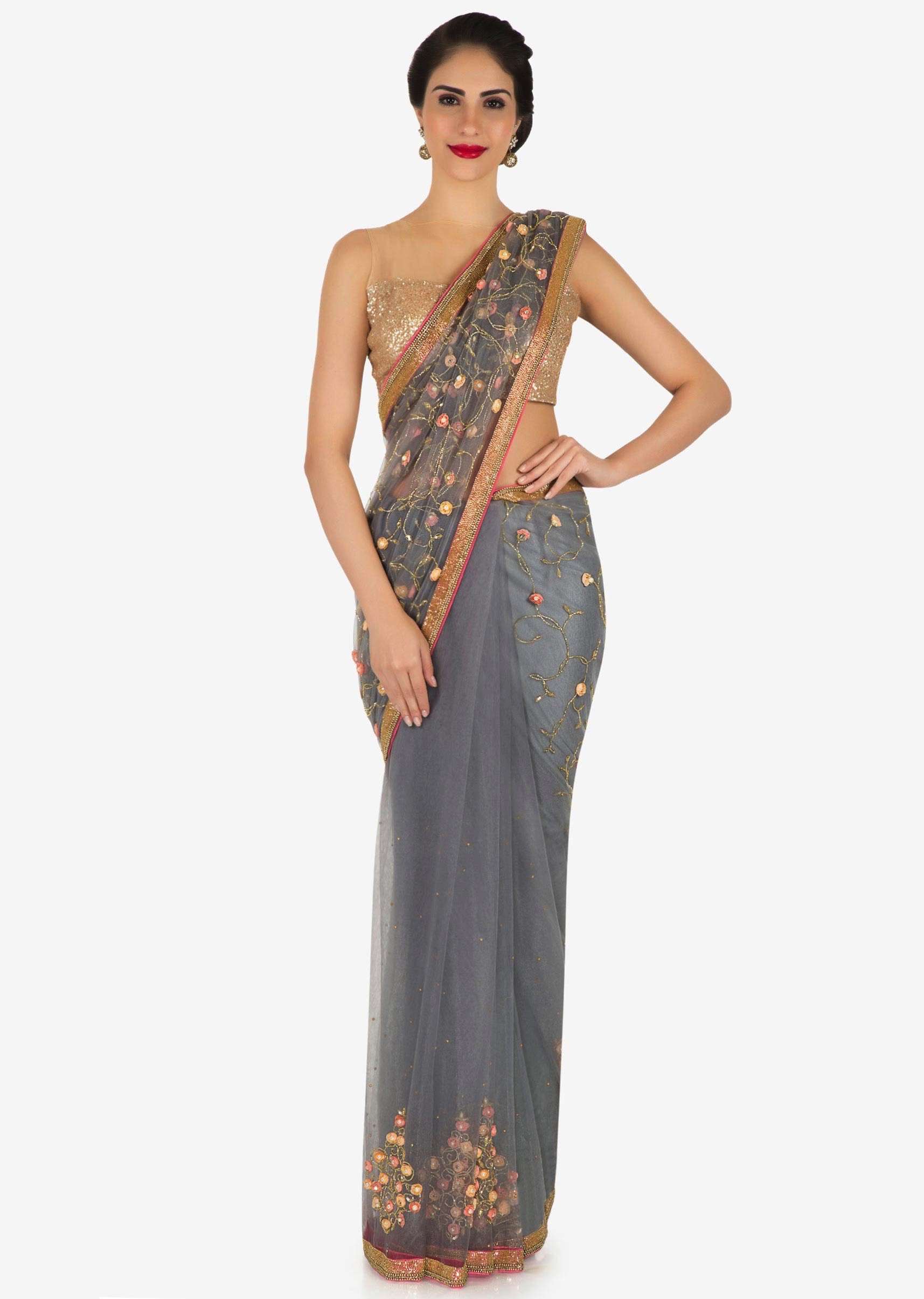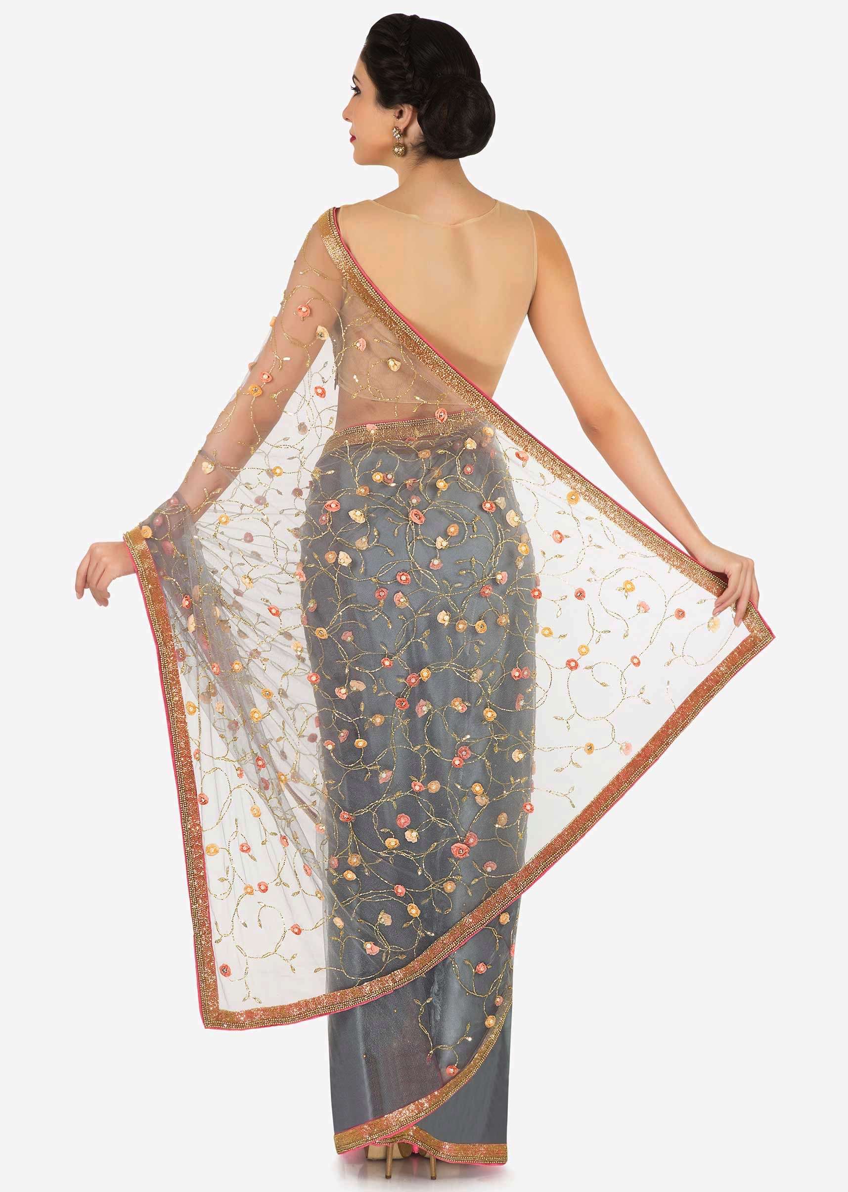 Grey saree in net adorn in 3D flower embroidery along with cut dana work only on Kalki