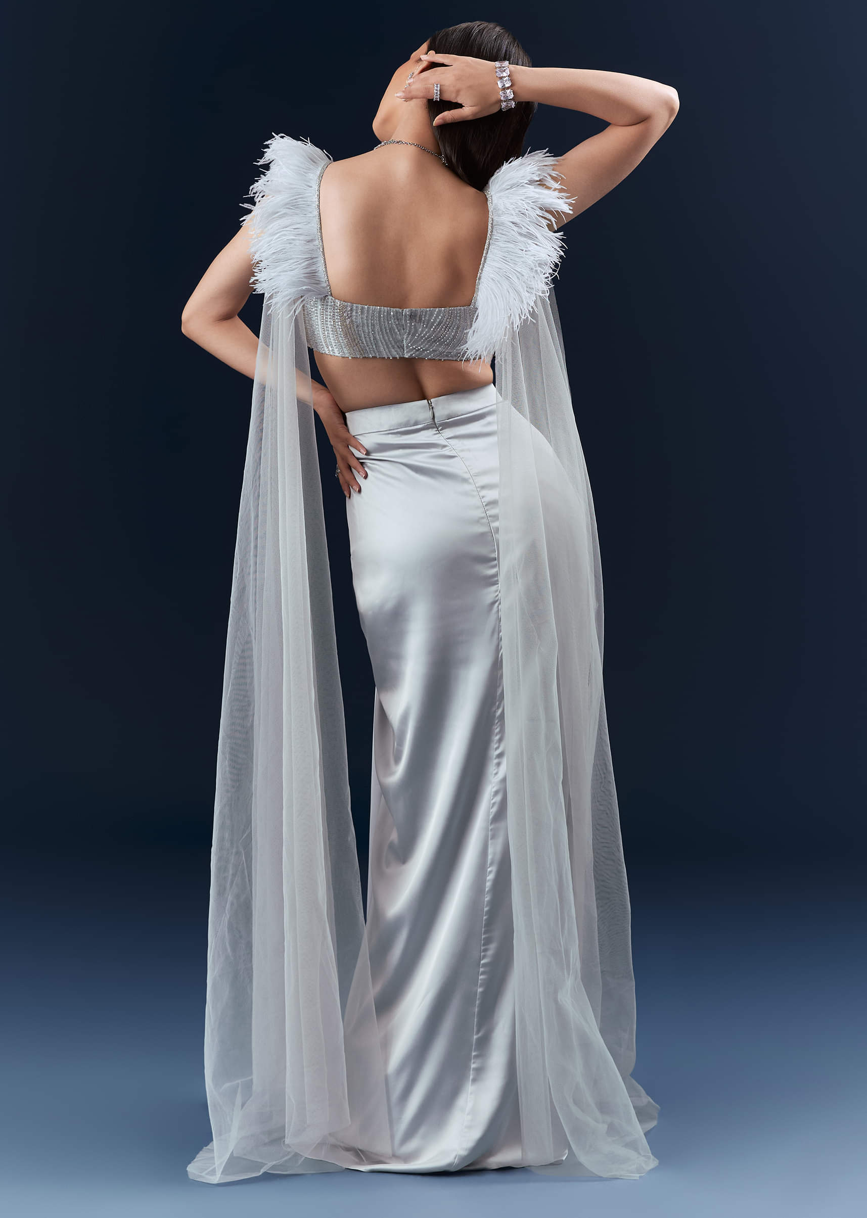 For modern glamour with a tactile twist, this grey satin crop top and skirt set pairs couture hand embroidery with a feather-finished blouse that moves beautifully under light. The blouse and coordinating skirt create a sleek, uninterrupted line that feels effortless for reception and cocktail. You feel polished, playful and perfectly bridesmaid-ready. Awarded as the Most Trusted Brand, we're delivering styles you love, just as promised.