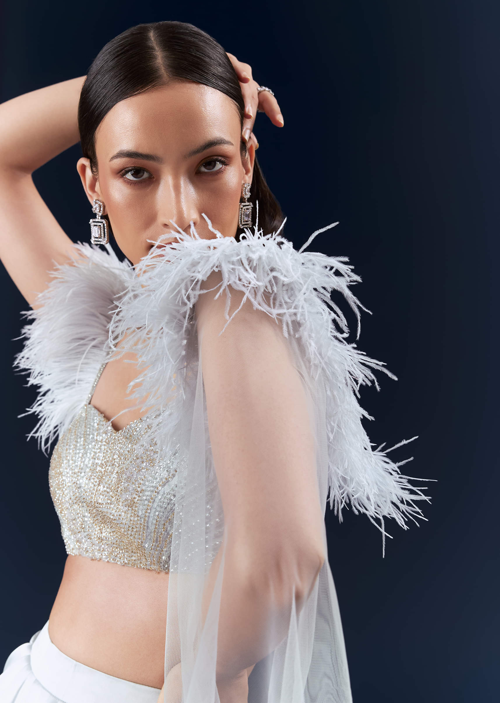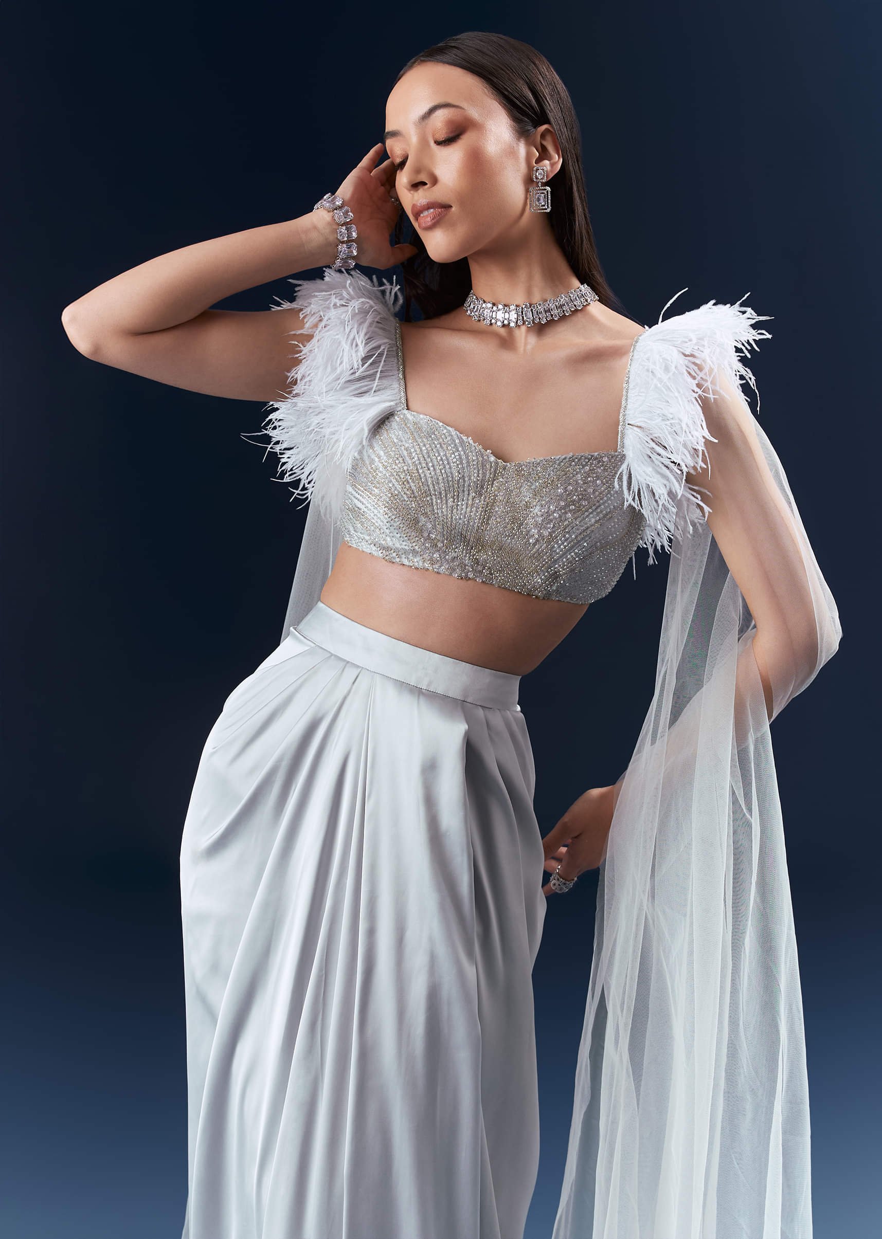 For modern glamour with a tactile twist, this grey satin crop top and skirt set pairs couture hand embroidery with a feather-finished blouse that moves beautifully under light. The blouse... More Product Details