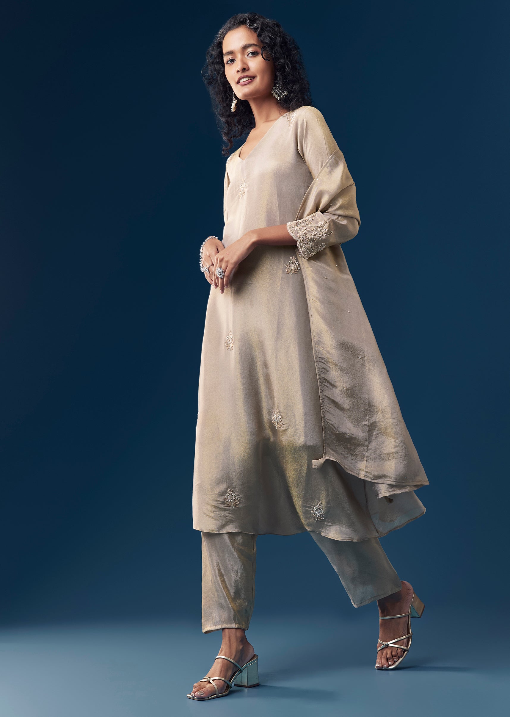 Pair with minimal jewellery and soft, glowing makeup to let the intricate butti work shine.
