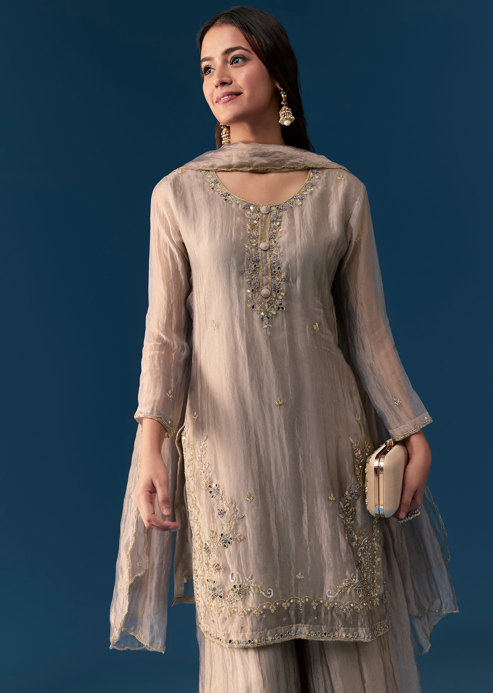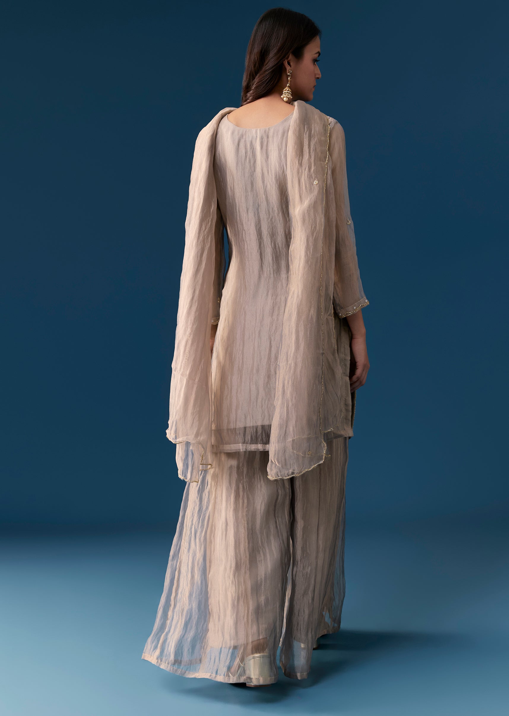 Exude understated charm with this pastel grey palazzo set in a straight Pakistani style silhouette. Crafted from soft tissue fabric, the kurta is adorned with delicate cut dana and sequins... More Product Details