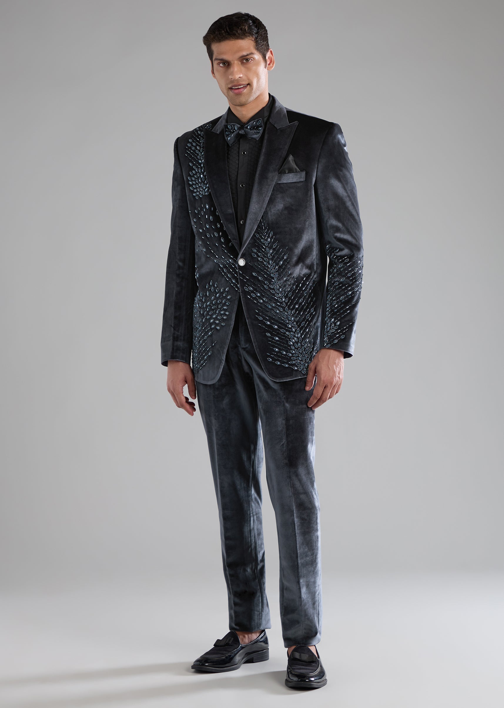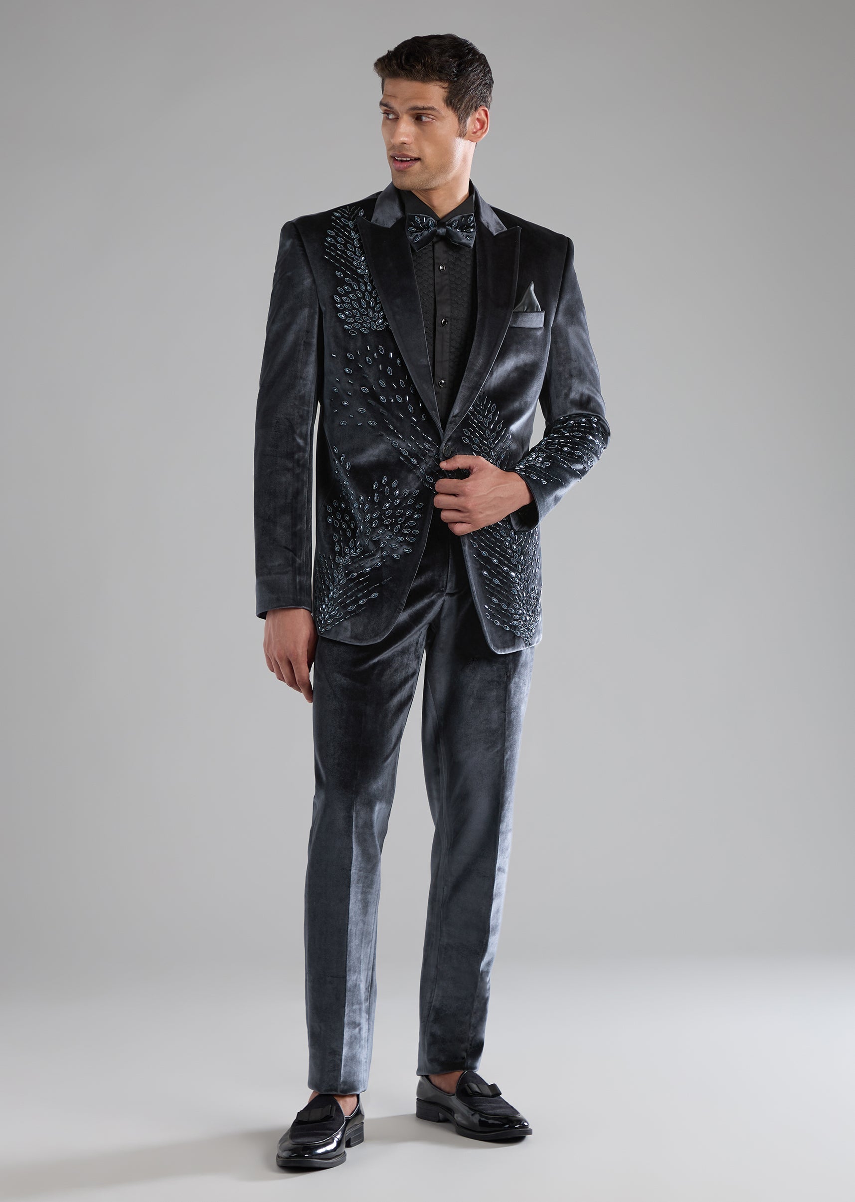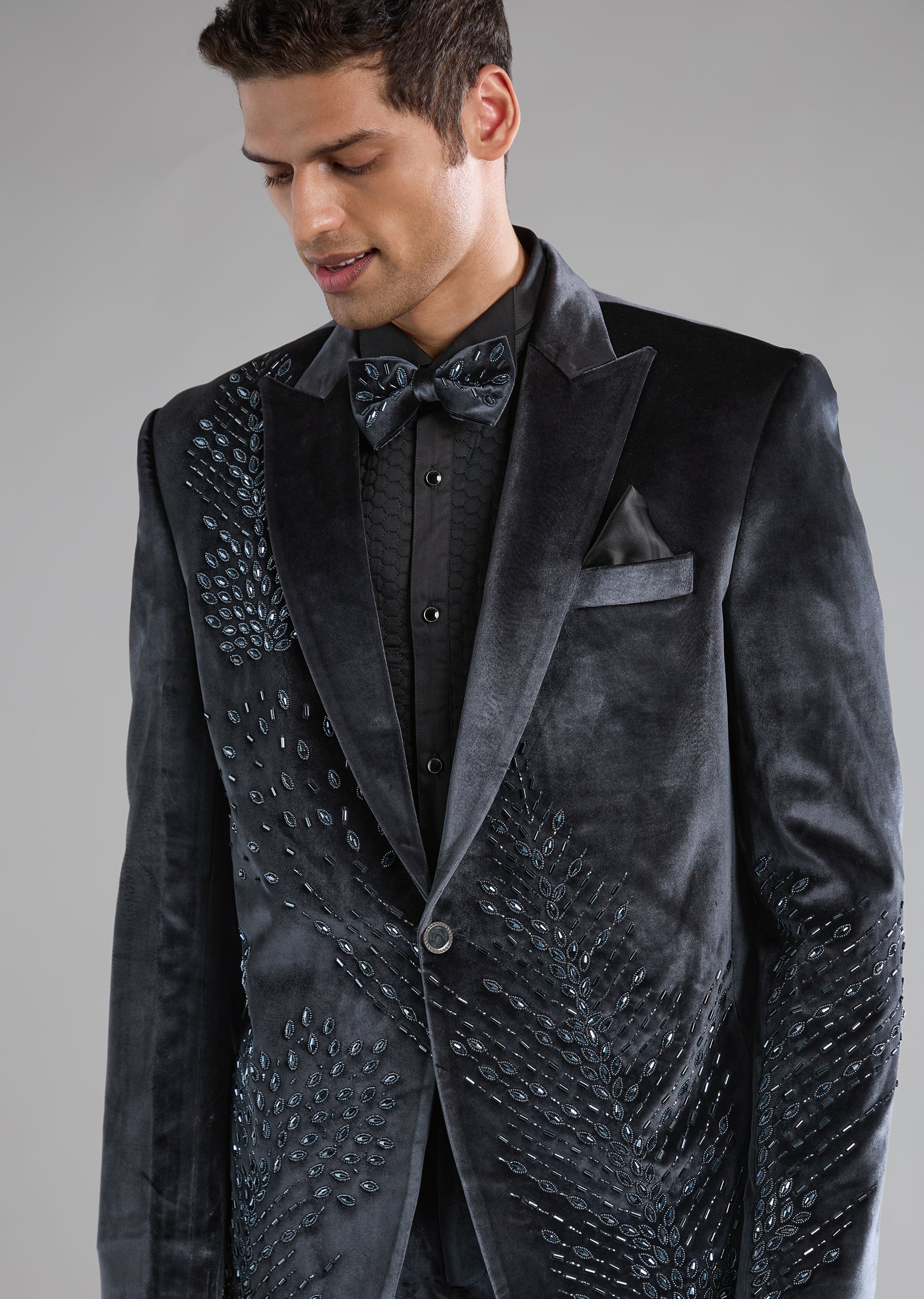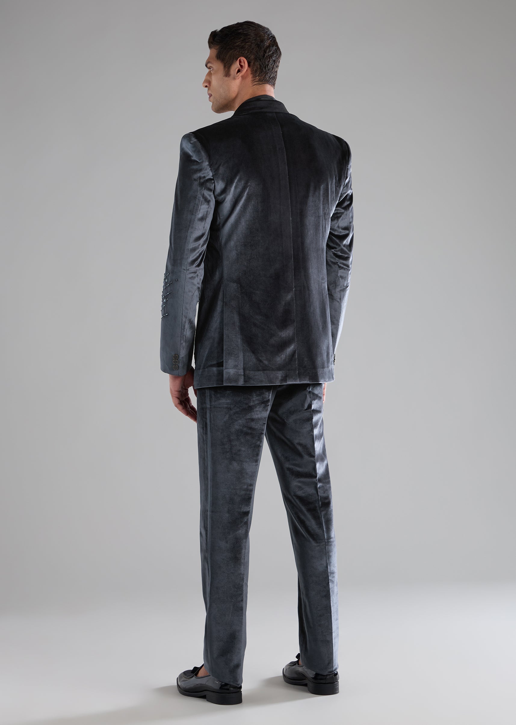 Grey Velvet Tuxedo with Cutdana Work