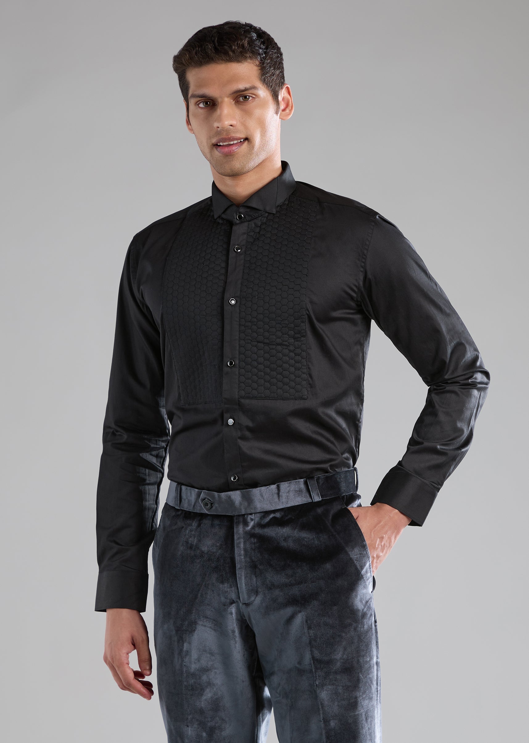 Designed to stand out at celebratory occasions, this velvet tuxedo brings together rich texture and refined embellishment. Accented with cut dana and bead detailing, the plush velvet fabric adds depth... More Product Details