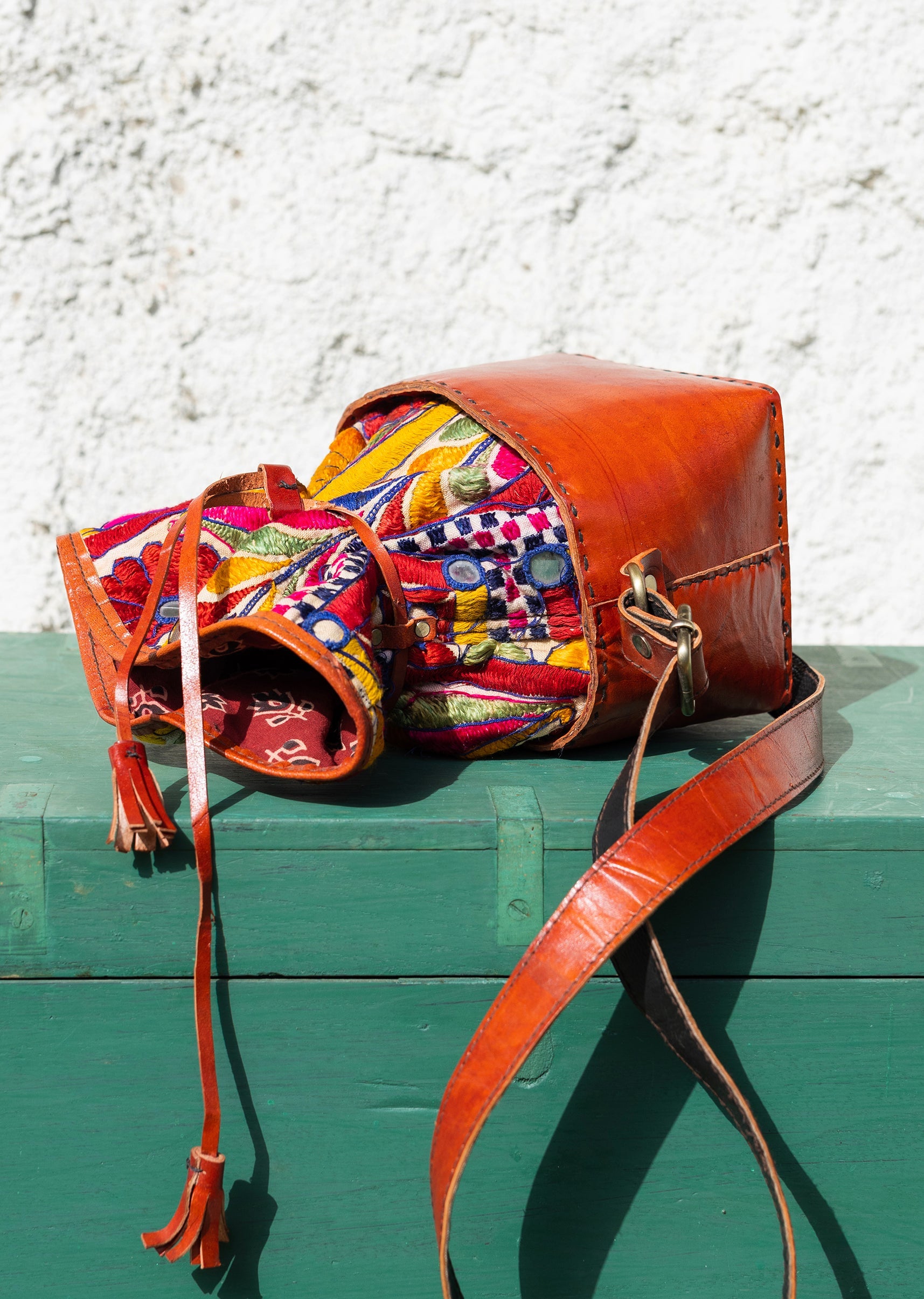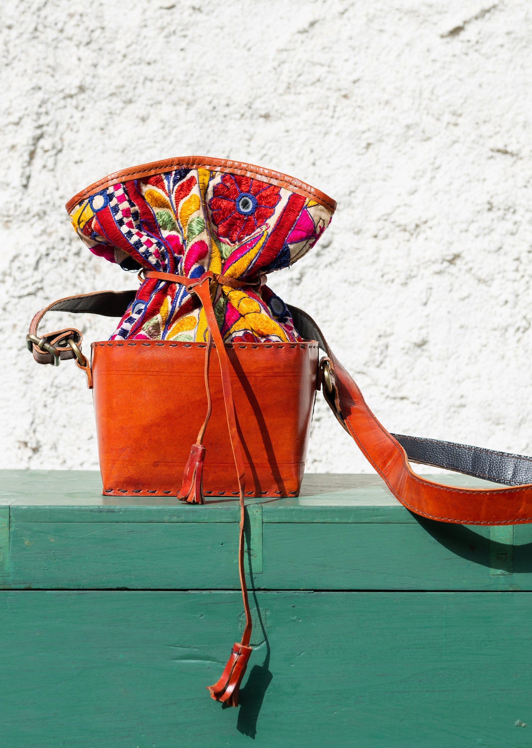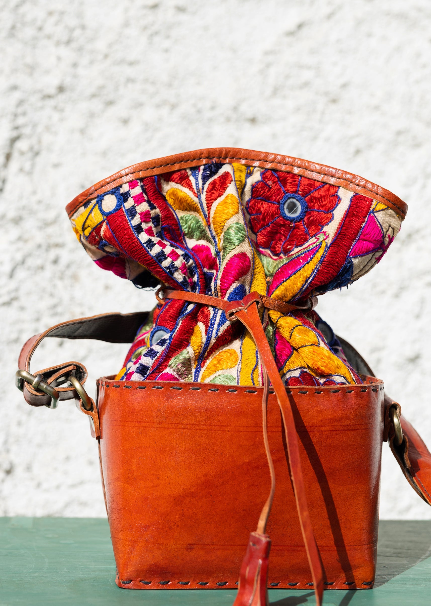 Hand-embroidered and handcrafted leather bags that are completely unique and designed for everyone. Created in a potli/pouch-inspired shape, each piece features colourful Kutchi traditional embroidery on the top — with every bag showcasing its own distinct pattern and palette. Lightweight, easy to carry, and finished with an adjustable sling for everyday comfort.