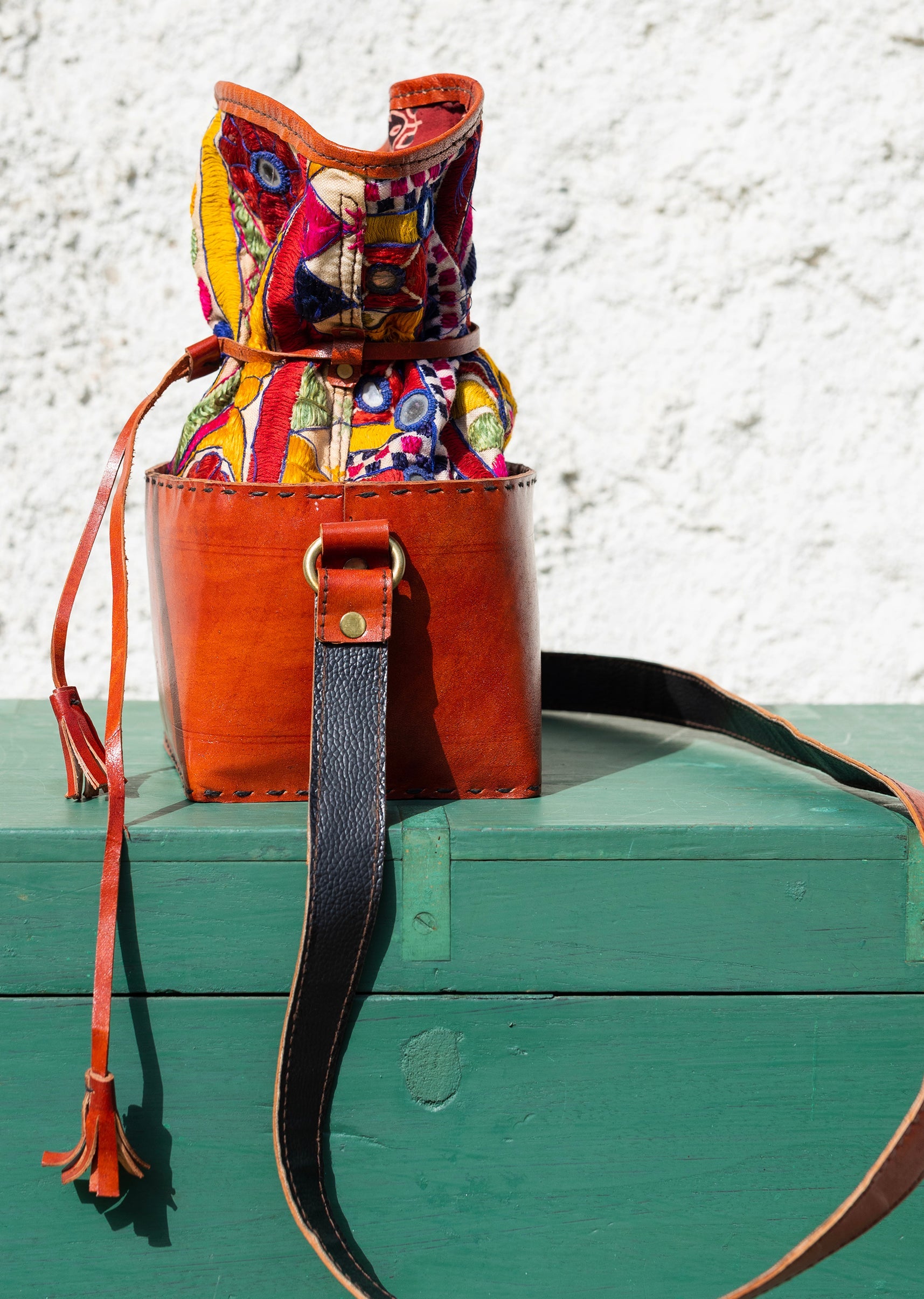 Hand-embroidered and handcrafted leather bags that are completely unique and designed for everyone. Created in a potli/pouch-inspired shape, each piece features colourful Kutchi traditional embroidery on the top — with... More Product Details