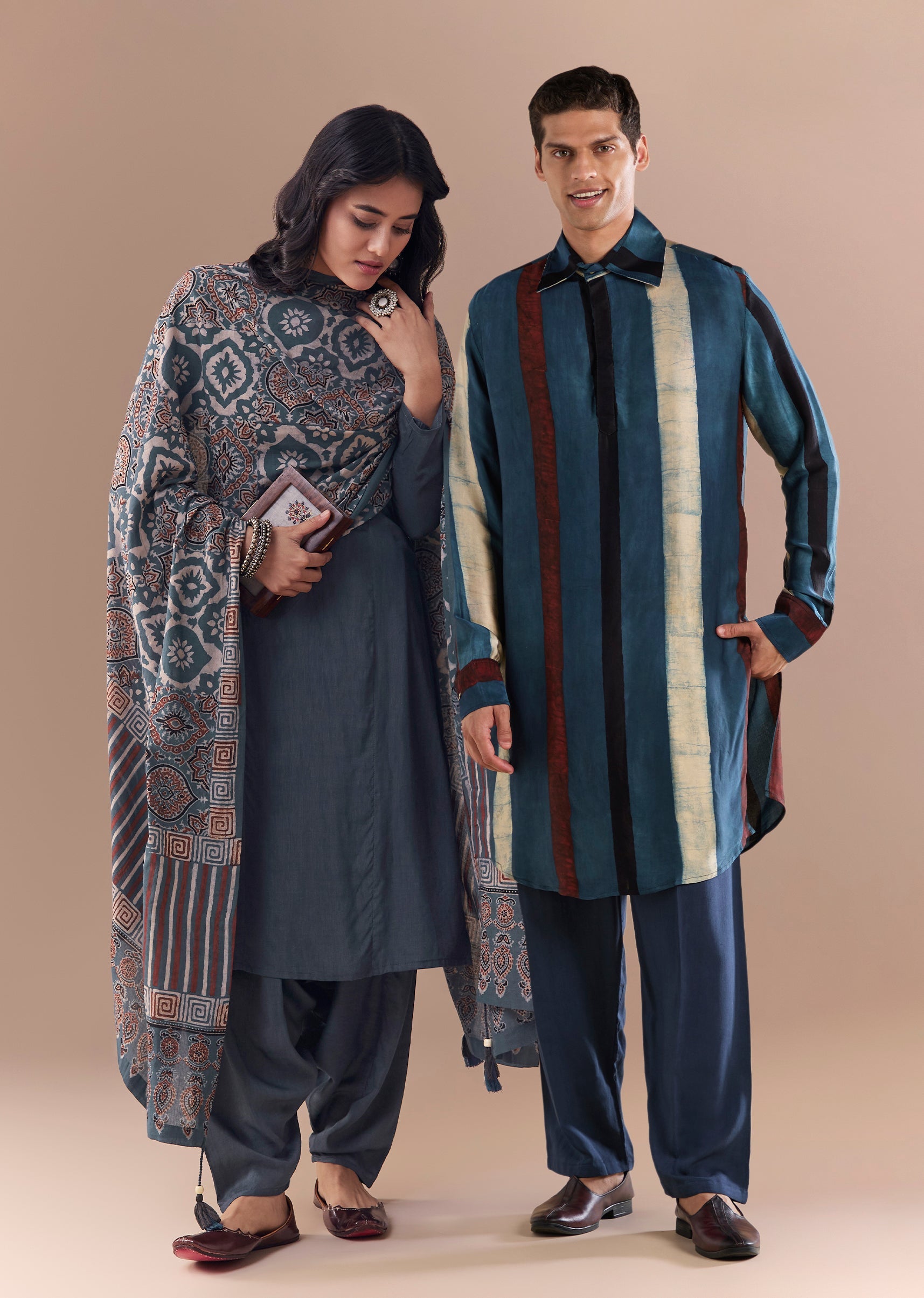 Heritage Couple Set – Indigo Kurta Set With Ajrakh Dupatta For Her And Stripe Indigo Kurta Set For Him