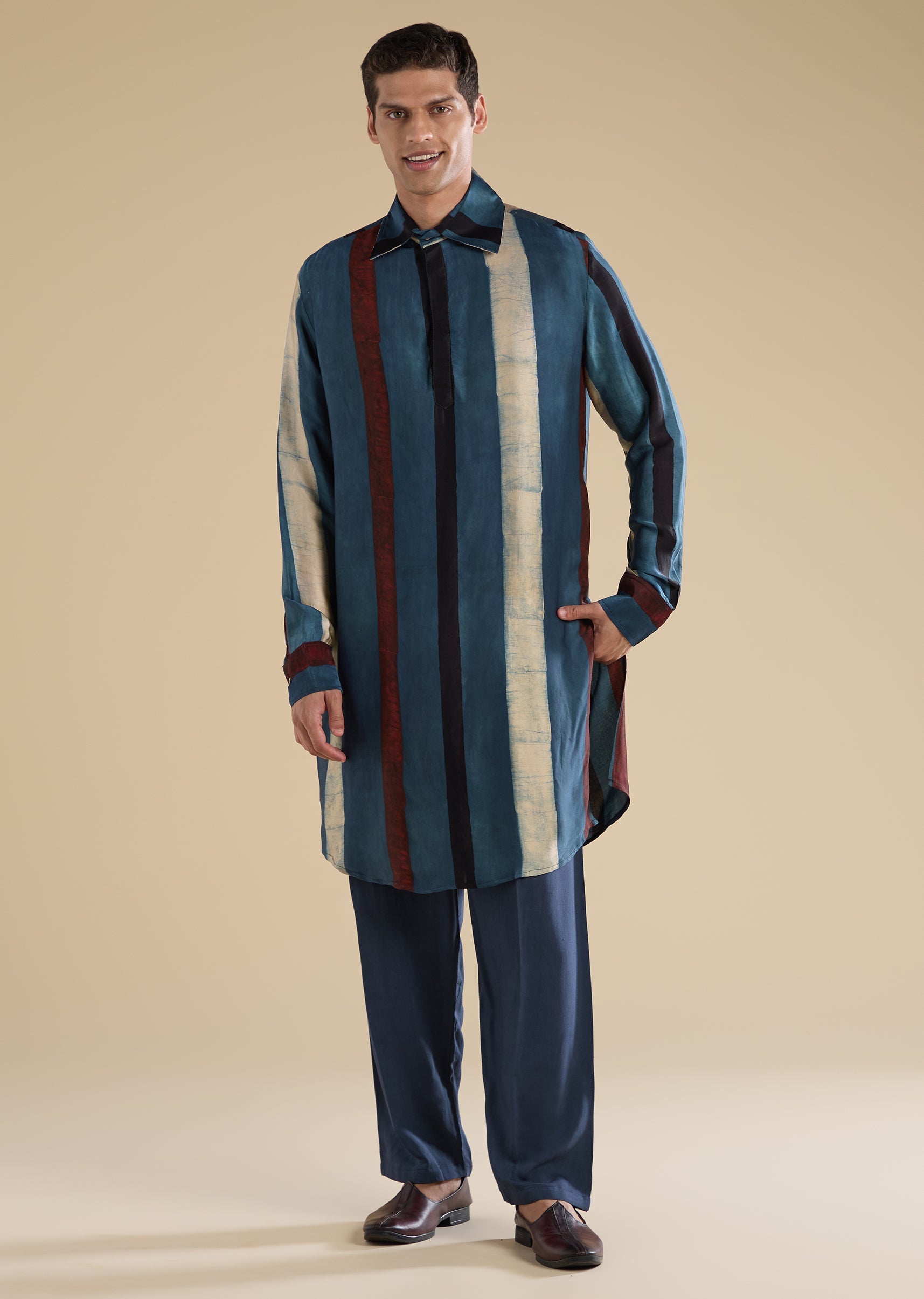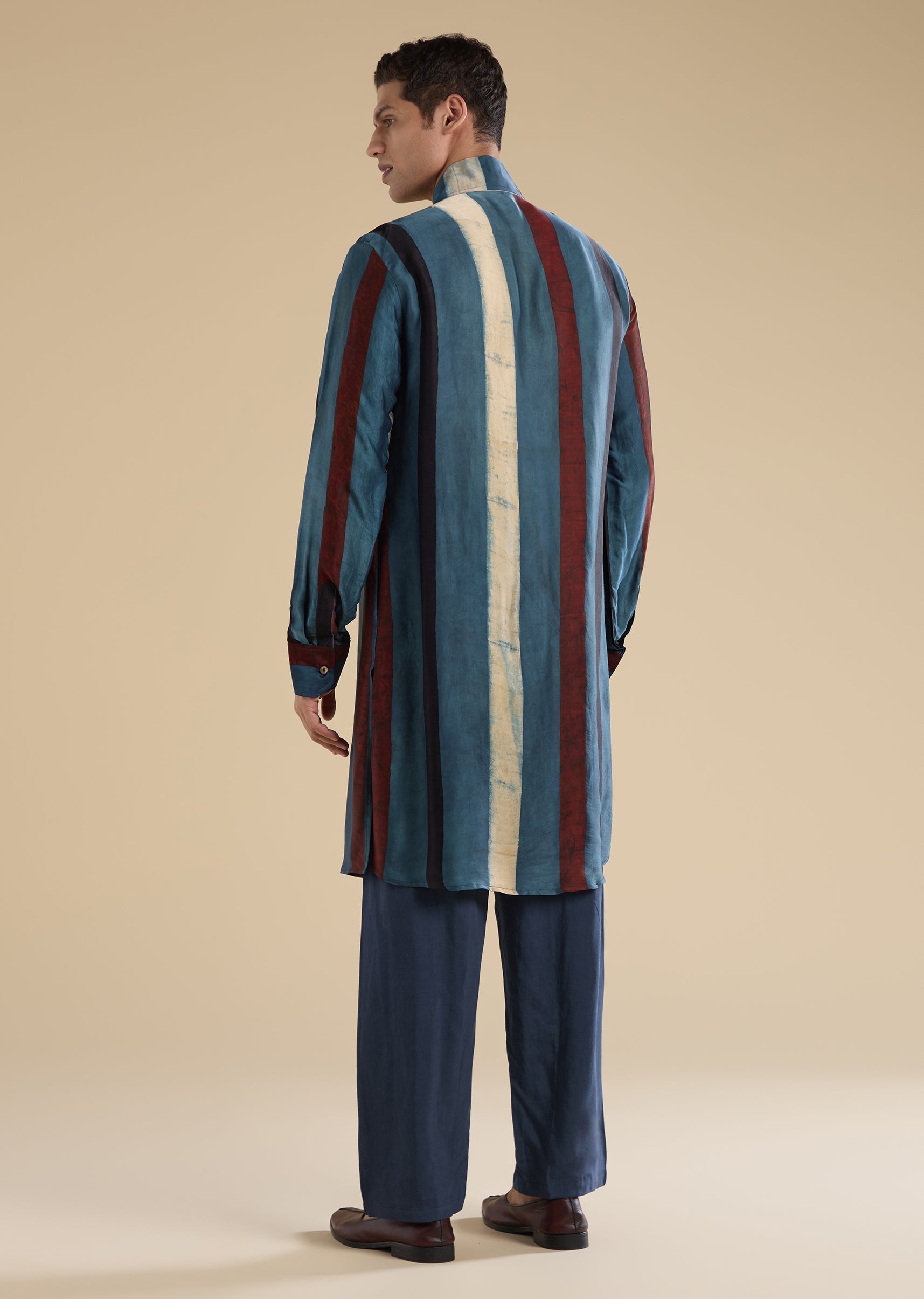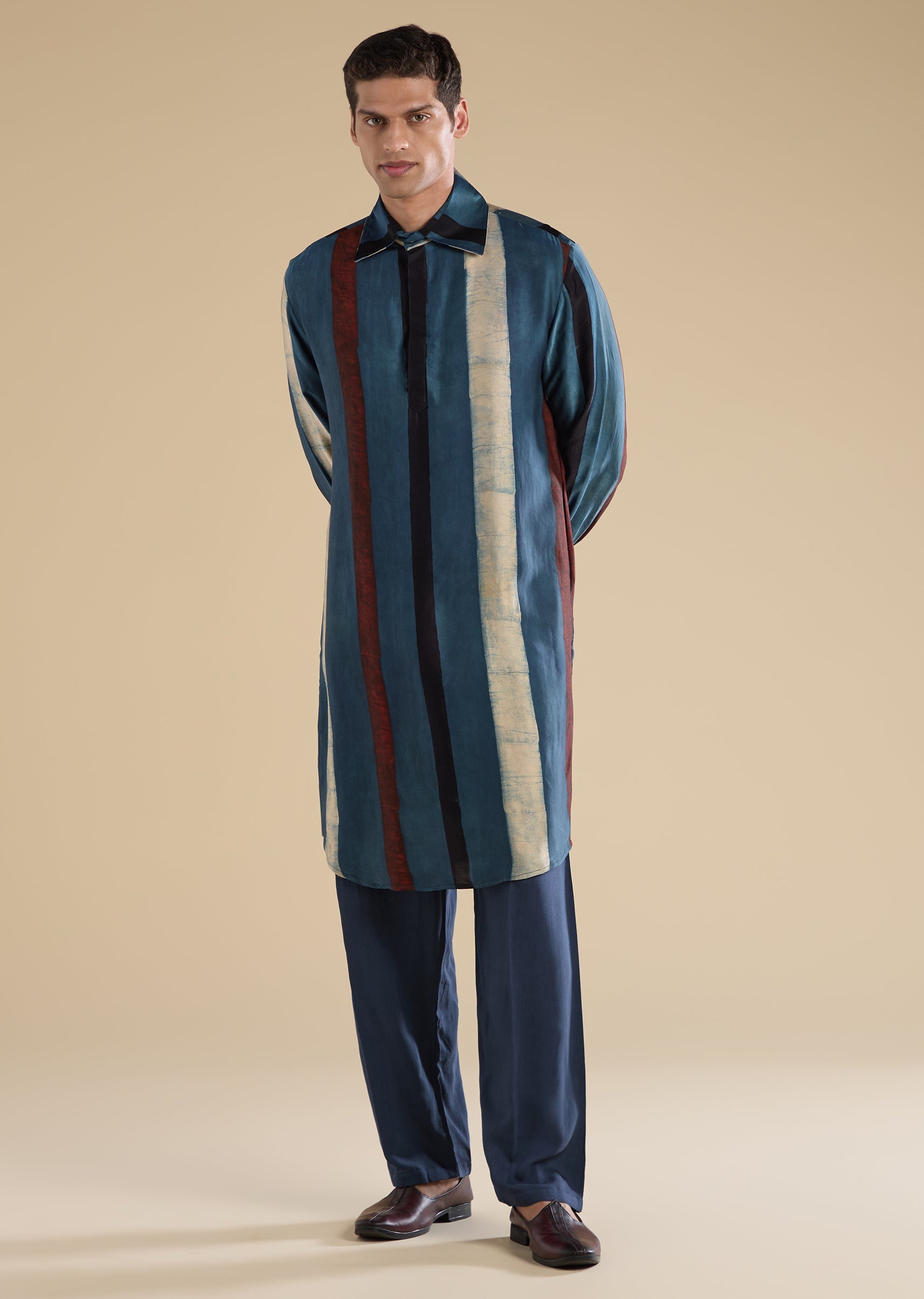 Classic and understated, this striped indigo kurta set complements the handcrafted aesthetic. Ideal for coordinated ethnic styling at cultural events.