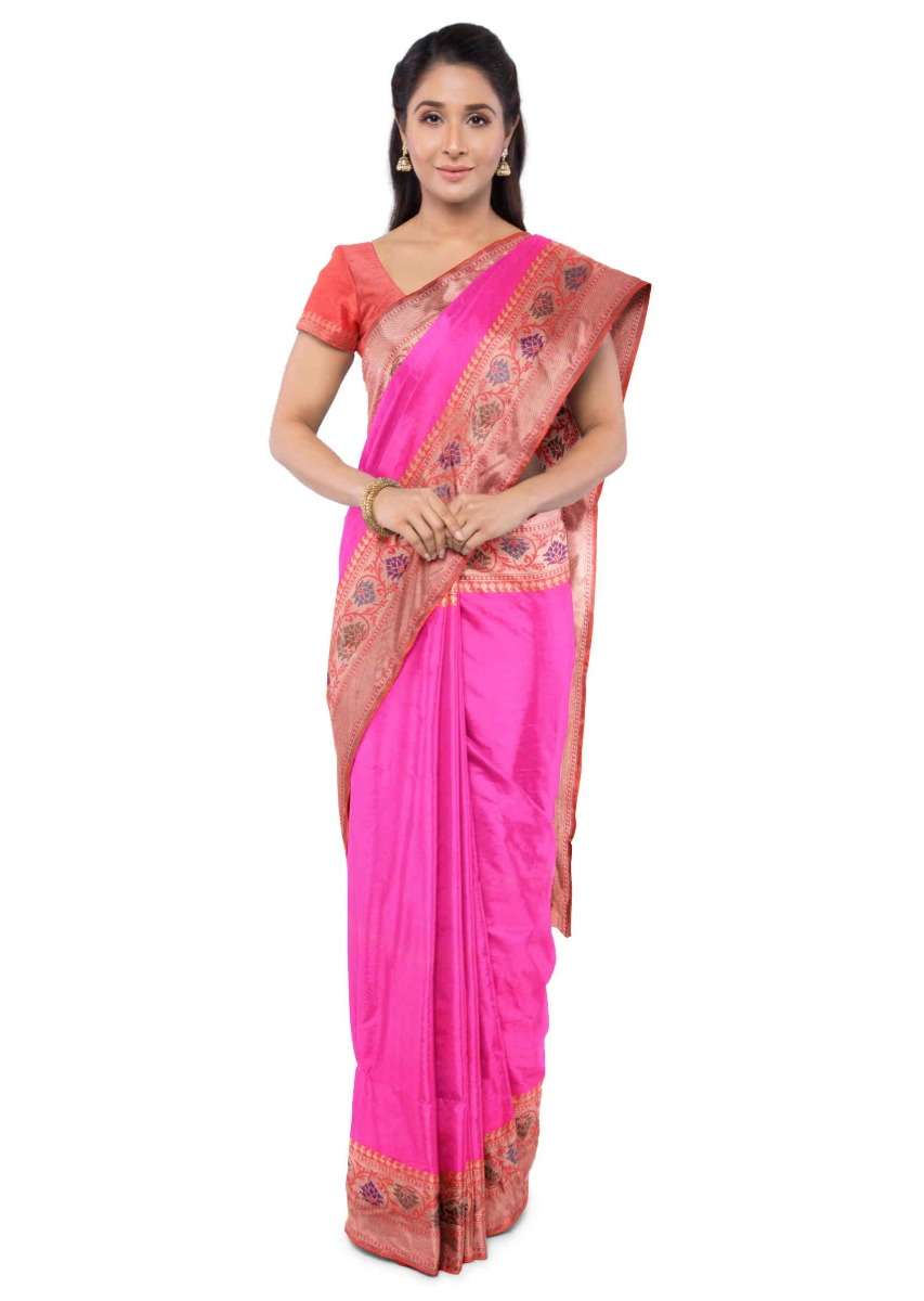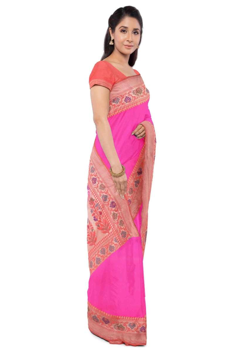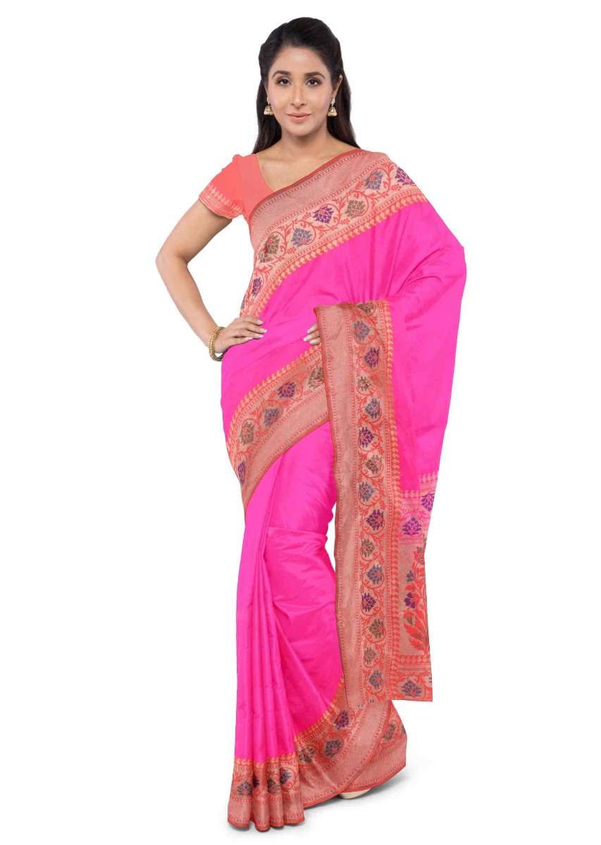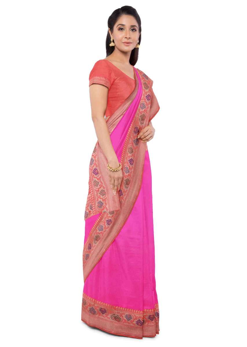 Hot Pink Banarasi Saree With Two Toned Orange Blouse Piece Online - Kalki Fashion