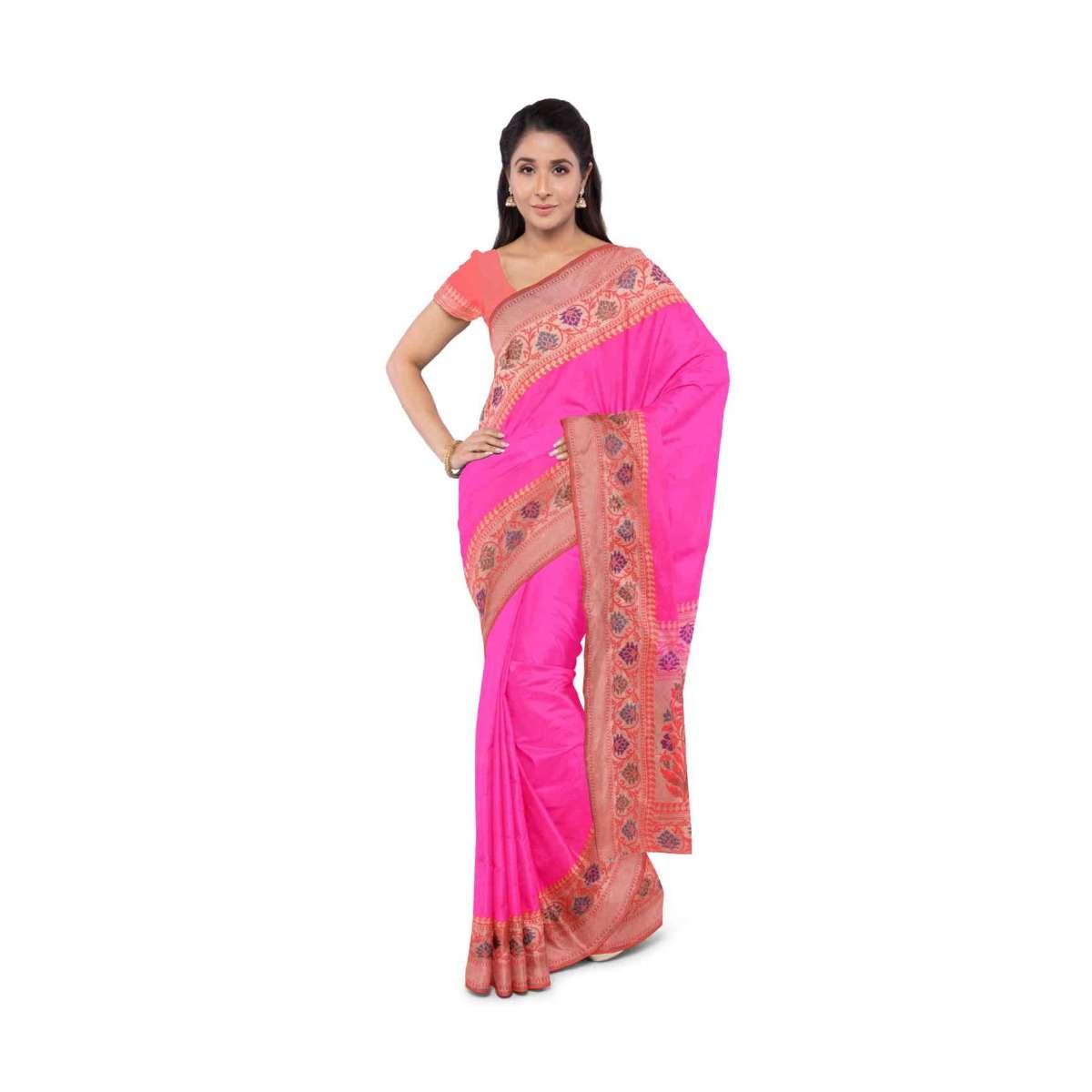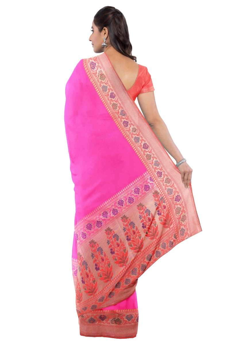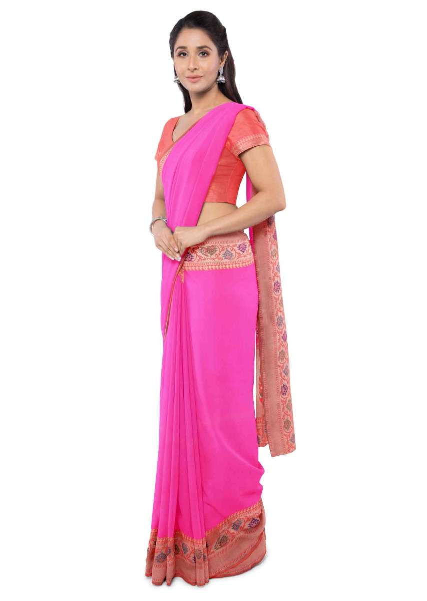 Hot Pink Banarasi Saree With Two Toned Orange Blouse Piece Online - Kalki Fashion