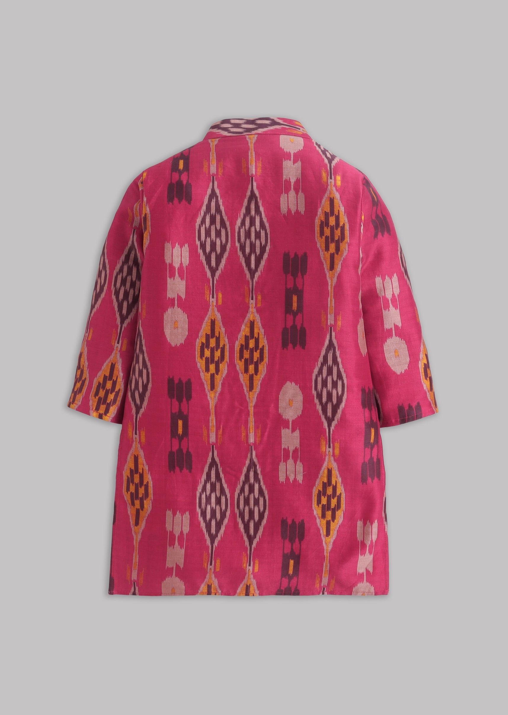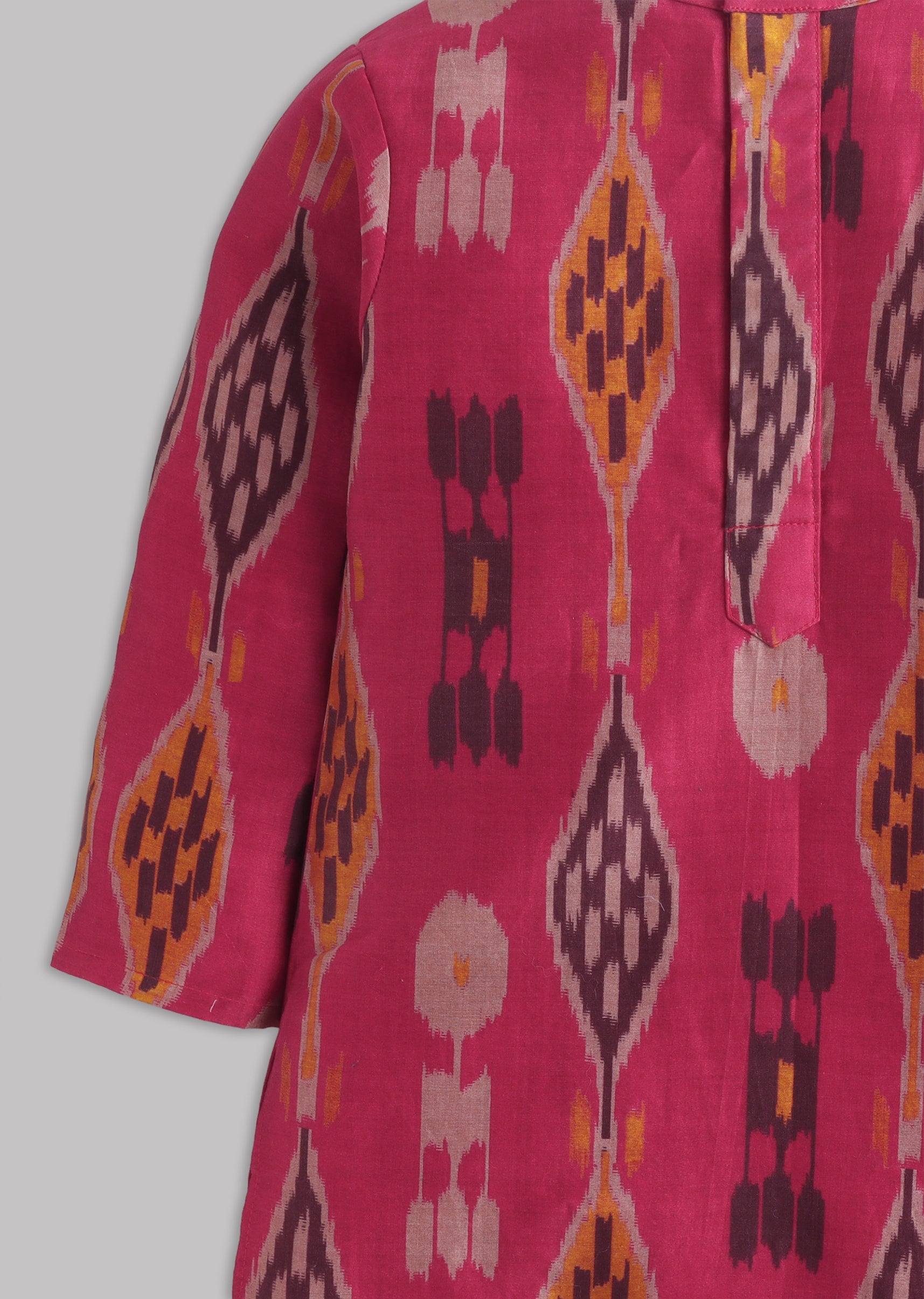 A festive ikat printed Chanderi kurta paired with a beige salwar for a traditional yet playful look. Designed with full sleeves and a mandarin collar—great for functions where you want... More Product Details