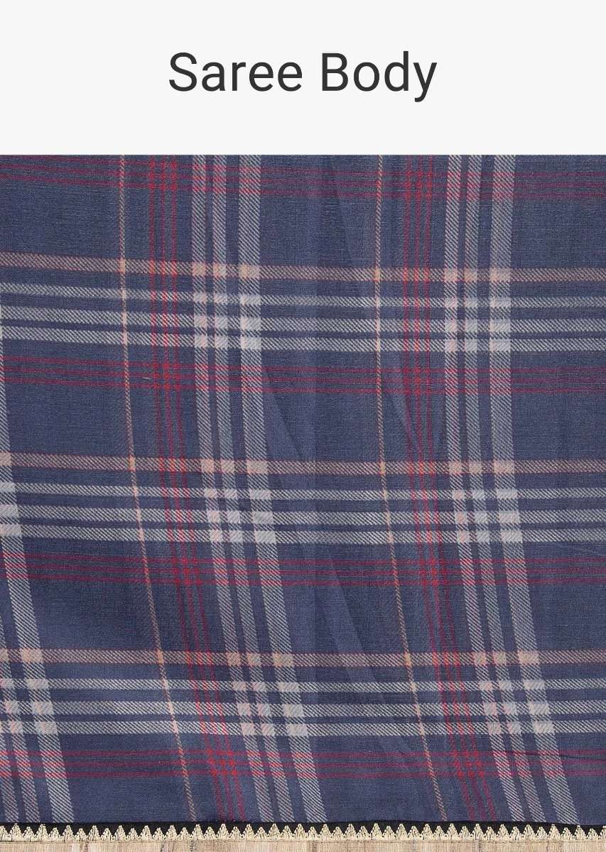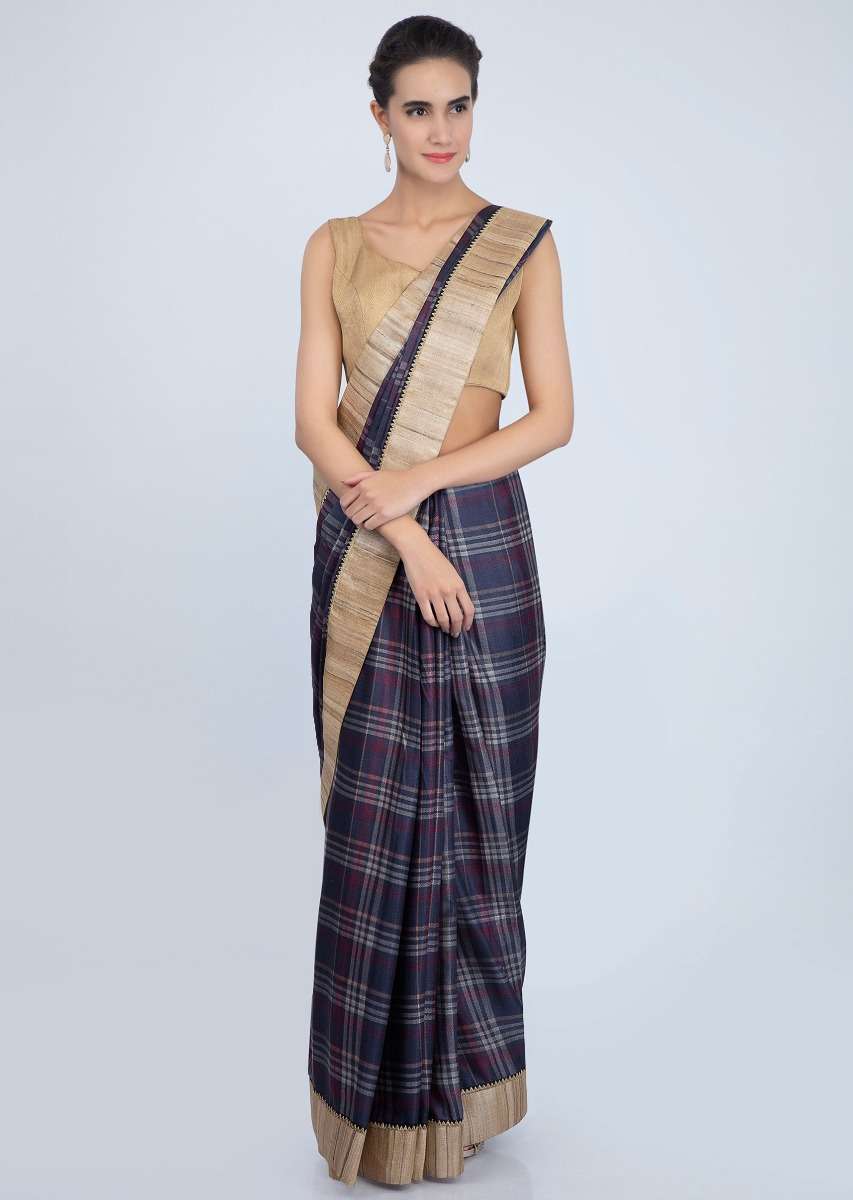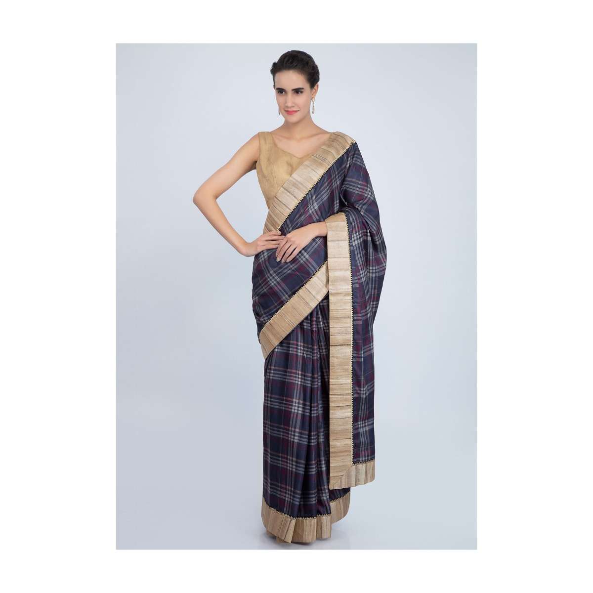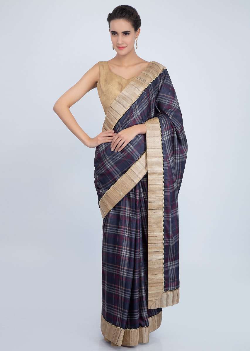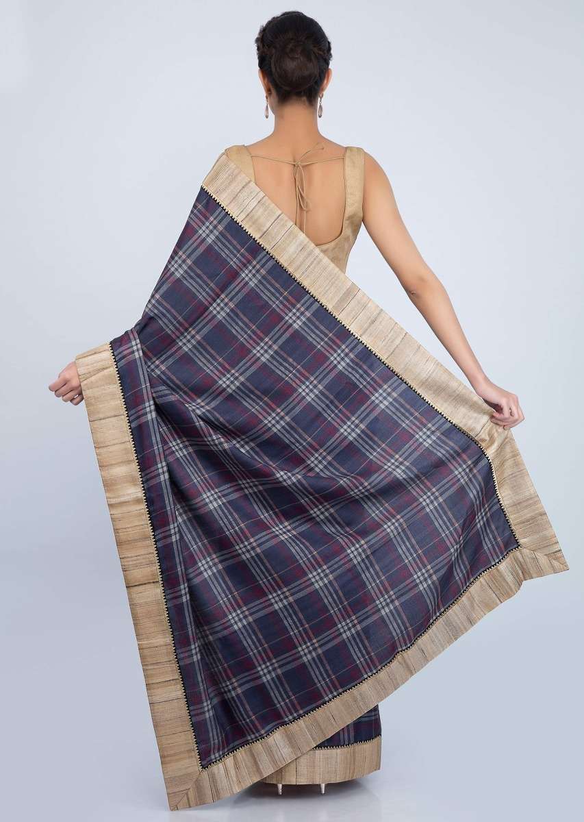 Indigo Blue Checks Saree In Cotton With Beige Tussar Silk Border Online - Kalki Fashion
