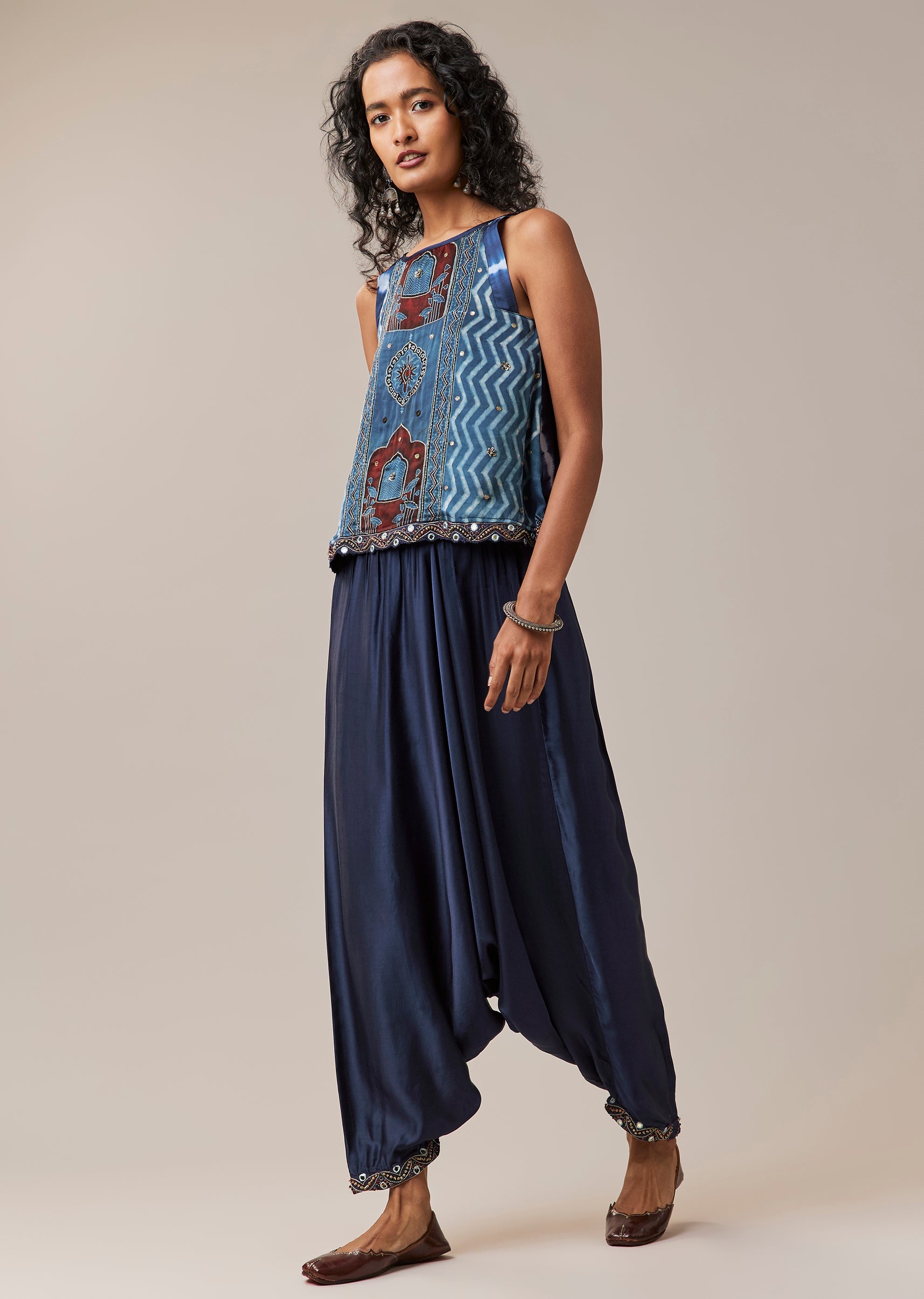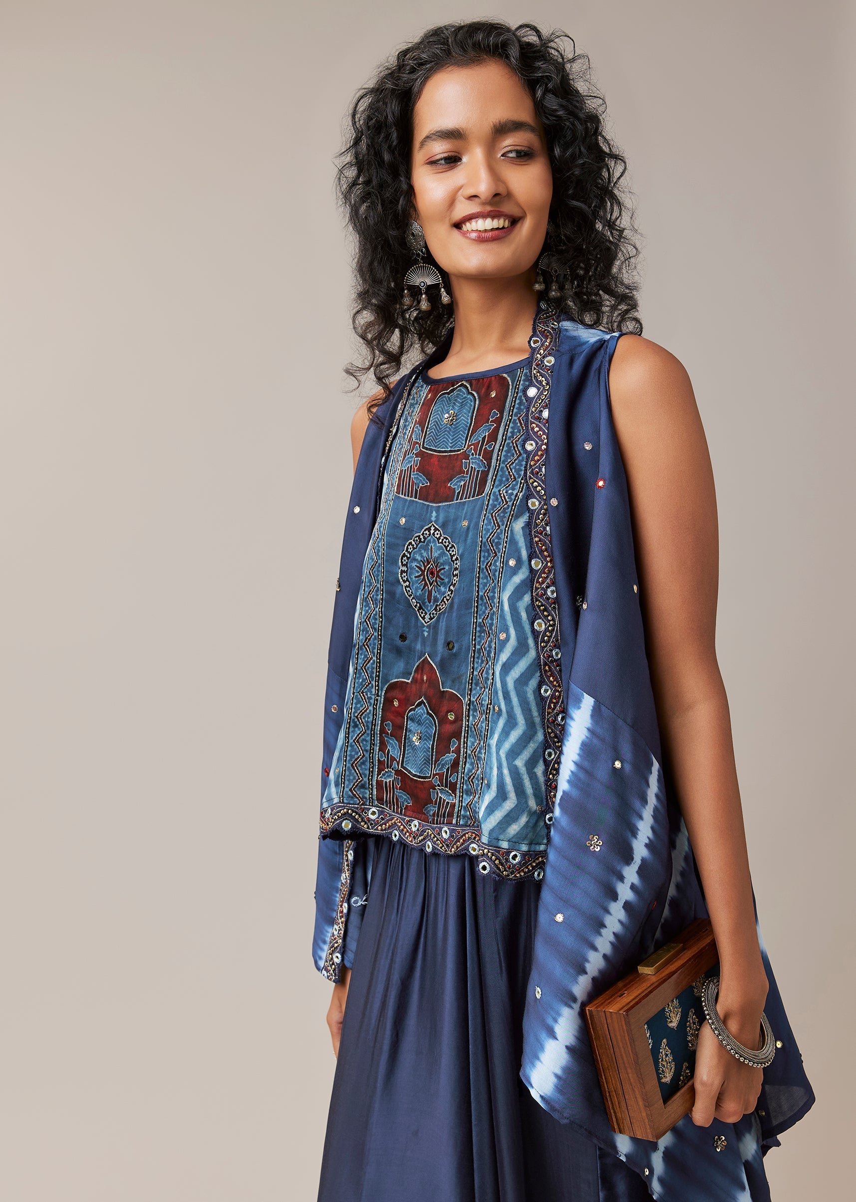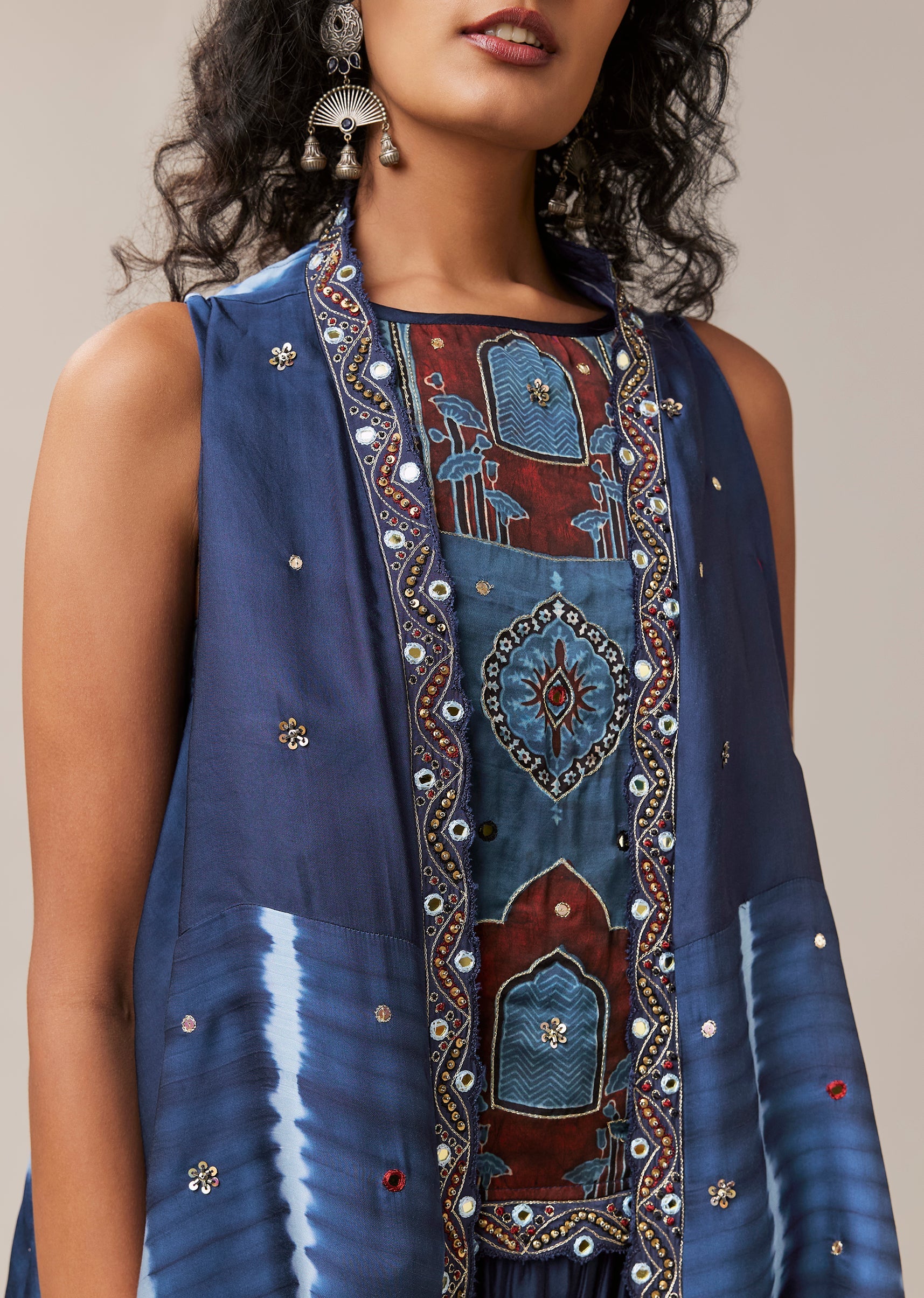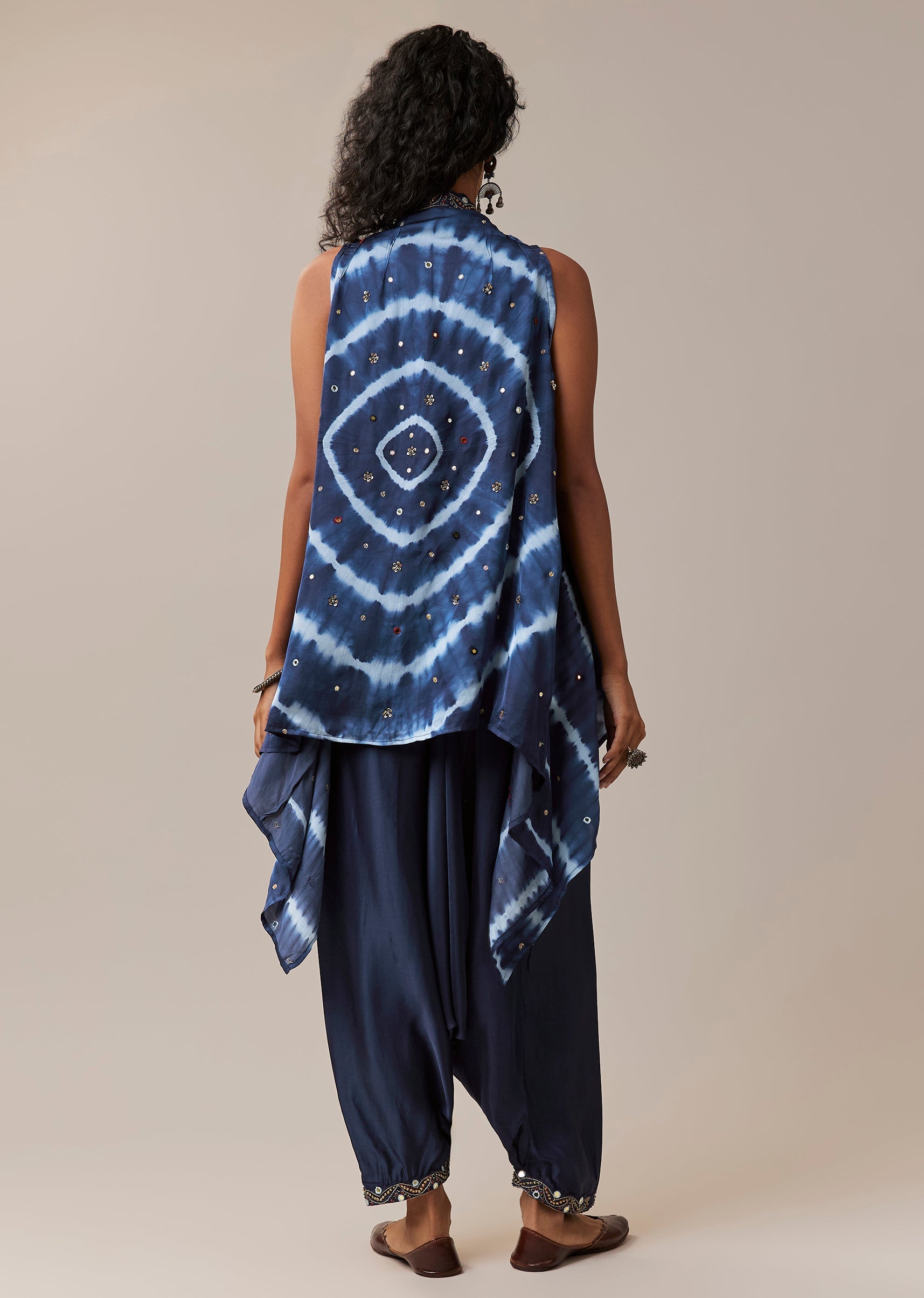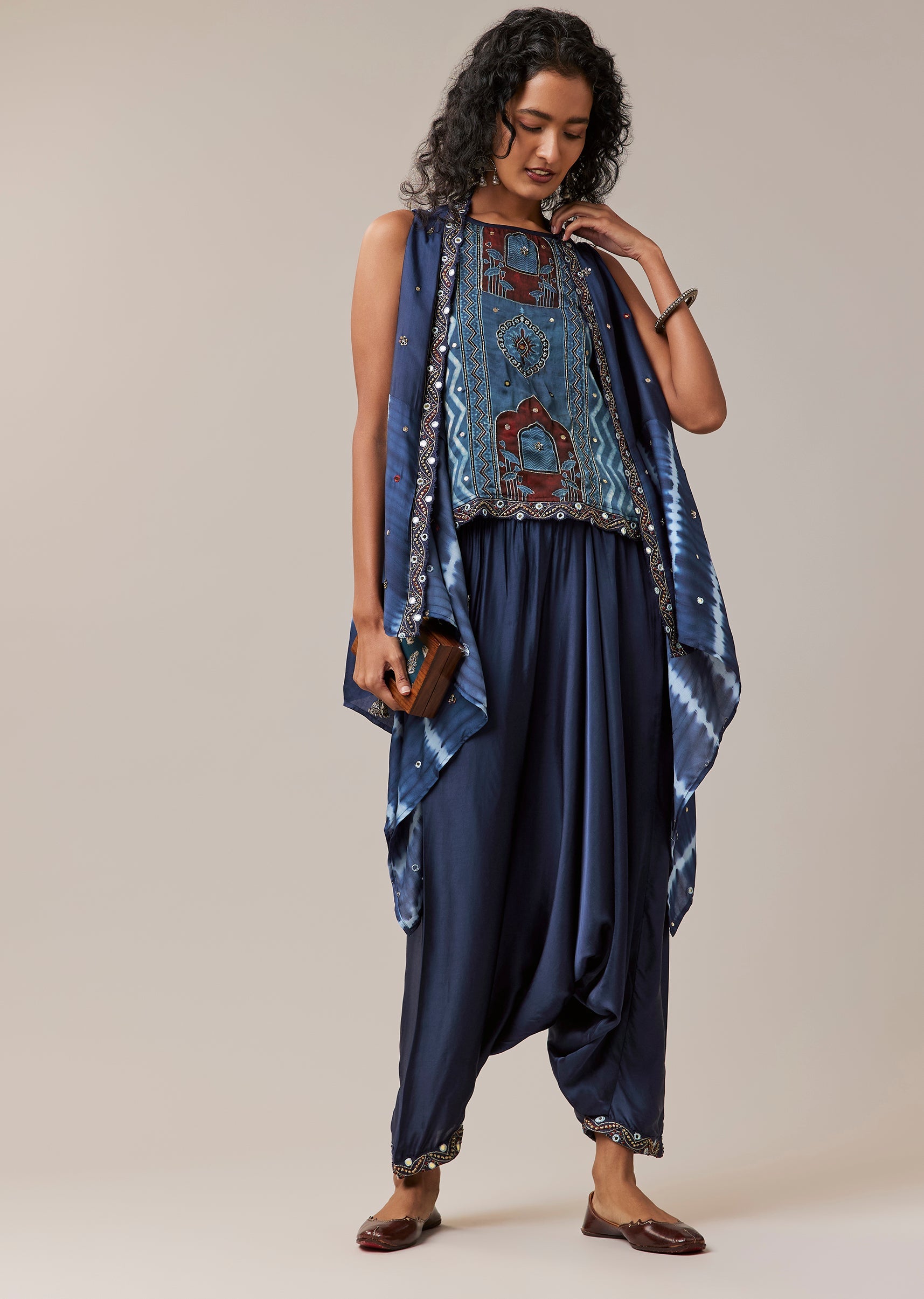 Celebrating artisanal craft and vibrant heritage, this hand dyed ensemble brings together leheriya, chevron, and ajrakh patterns in a beautifully coordinated silhouette. The sleeveless jacket is elevated with intricate handwork featuring mirror accents, sequins, and zari embroidery, adding texture and festive charm. Crafted in soft modal, the set includes a top, statement jacket, and relaxed cowl pants, creating a look that feels both contemporary and rooted in tradition. Perfect for festive gatherings, cultural events, and art inspired celebrations. Awarded as the Most Trusted Brand, we're delivering styles you love, just as promised.