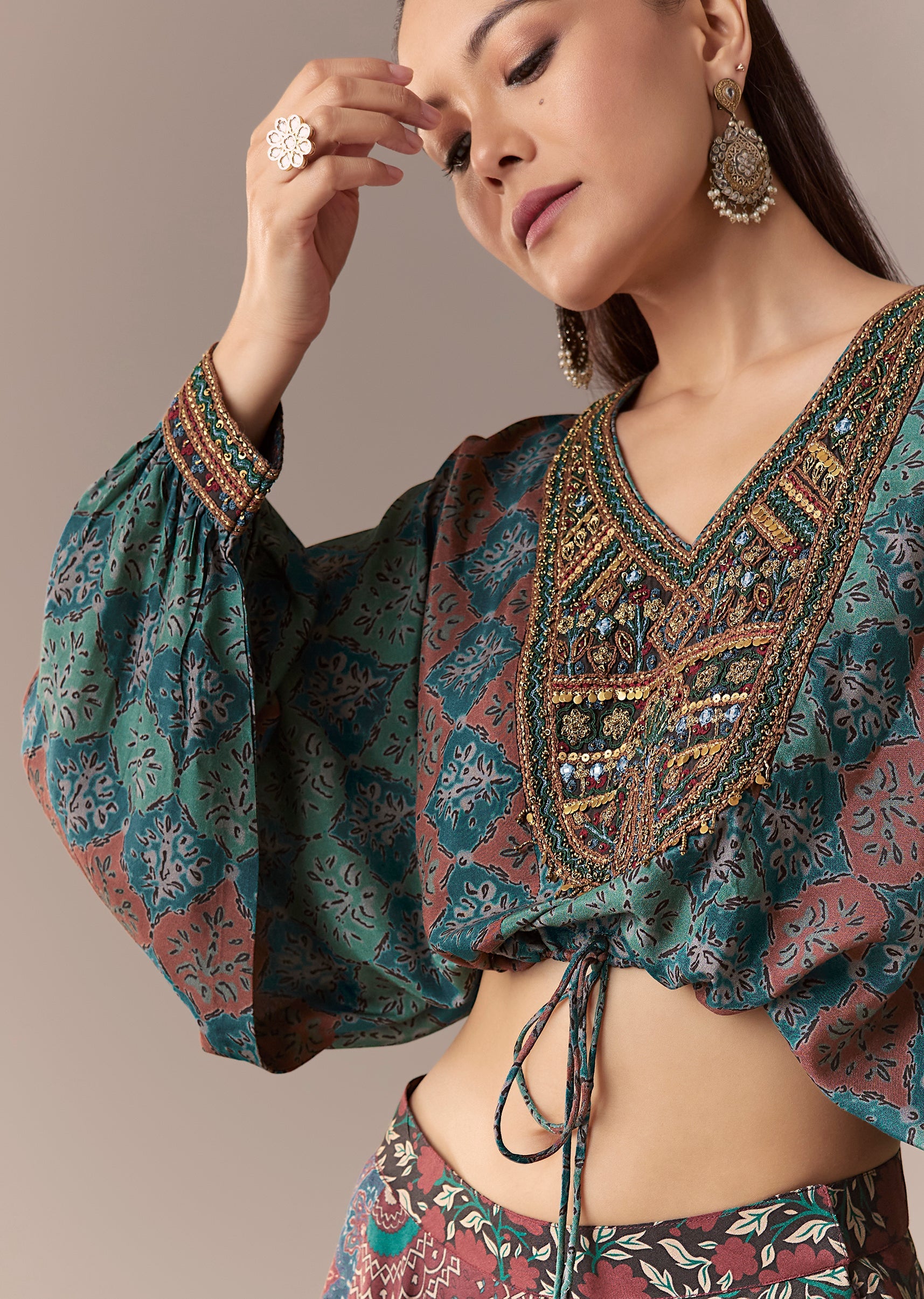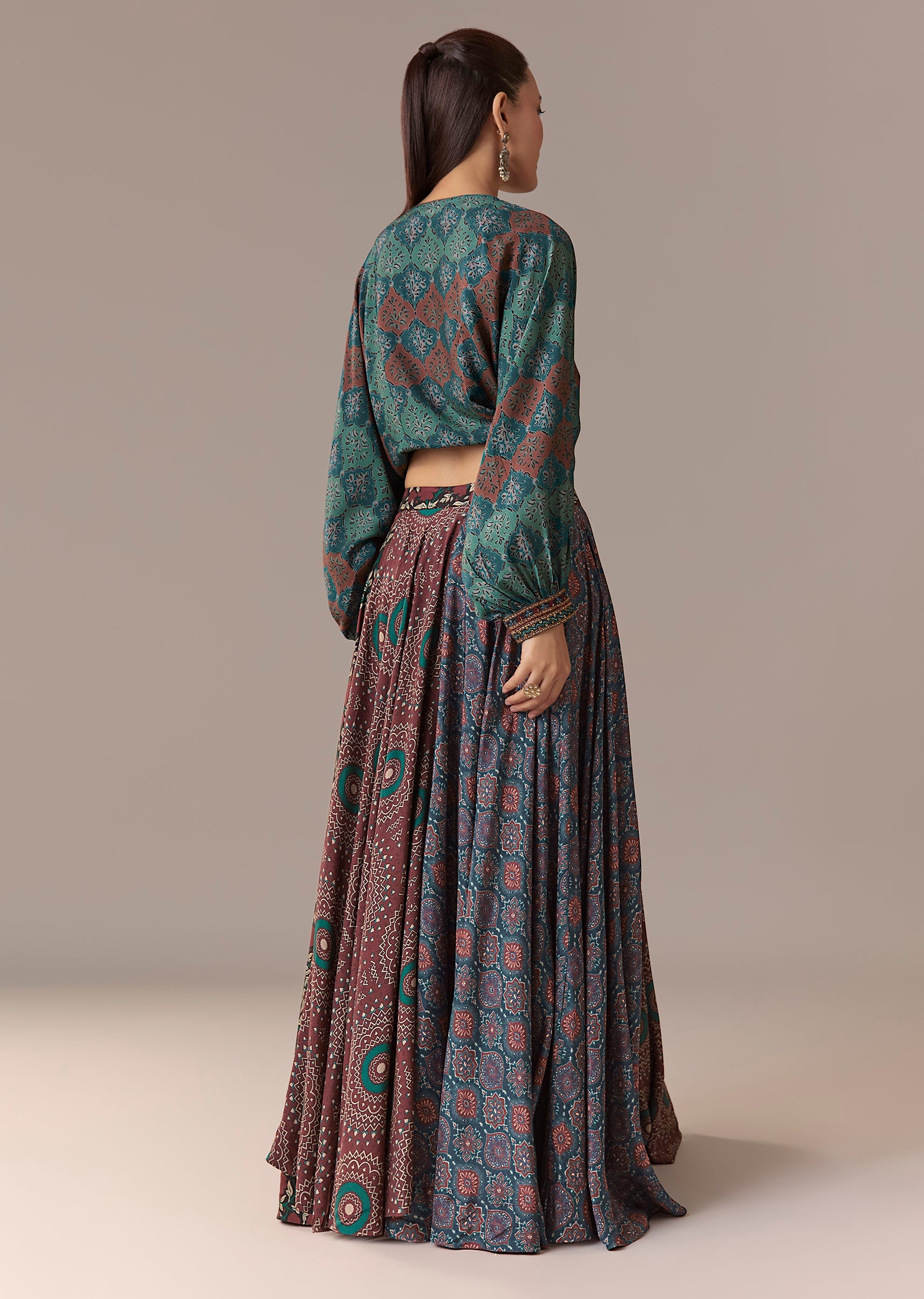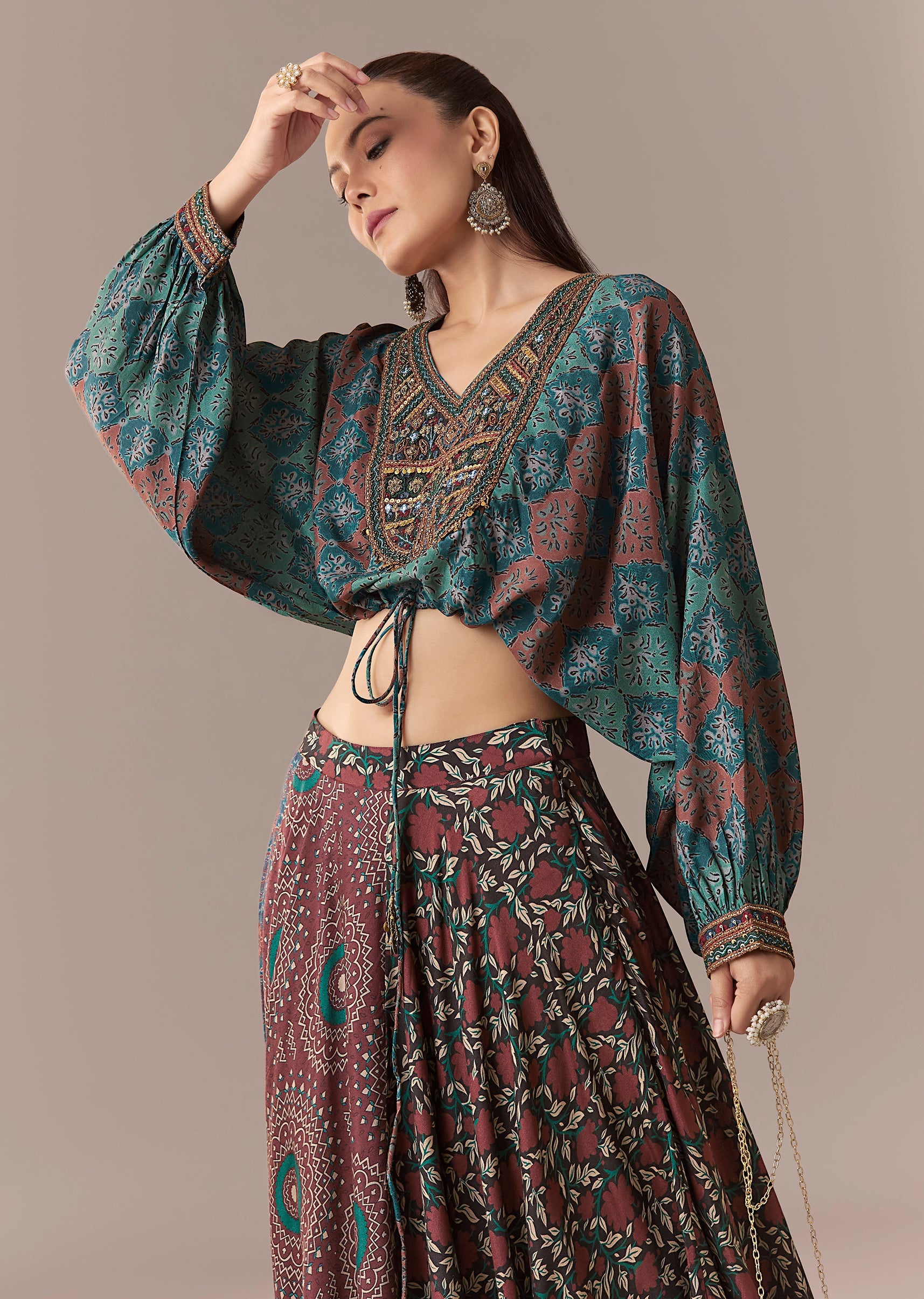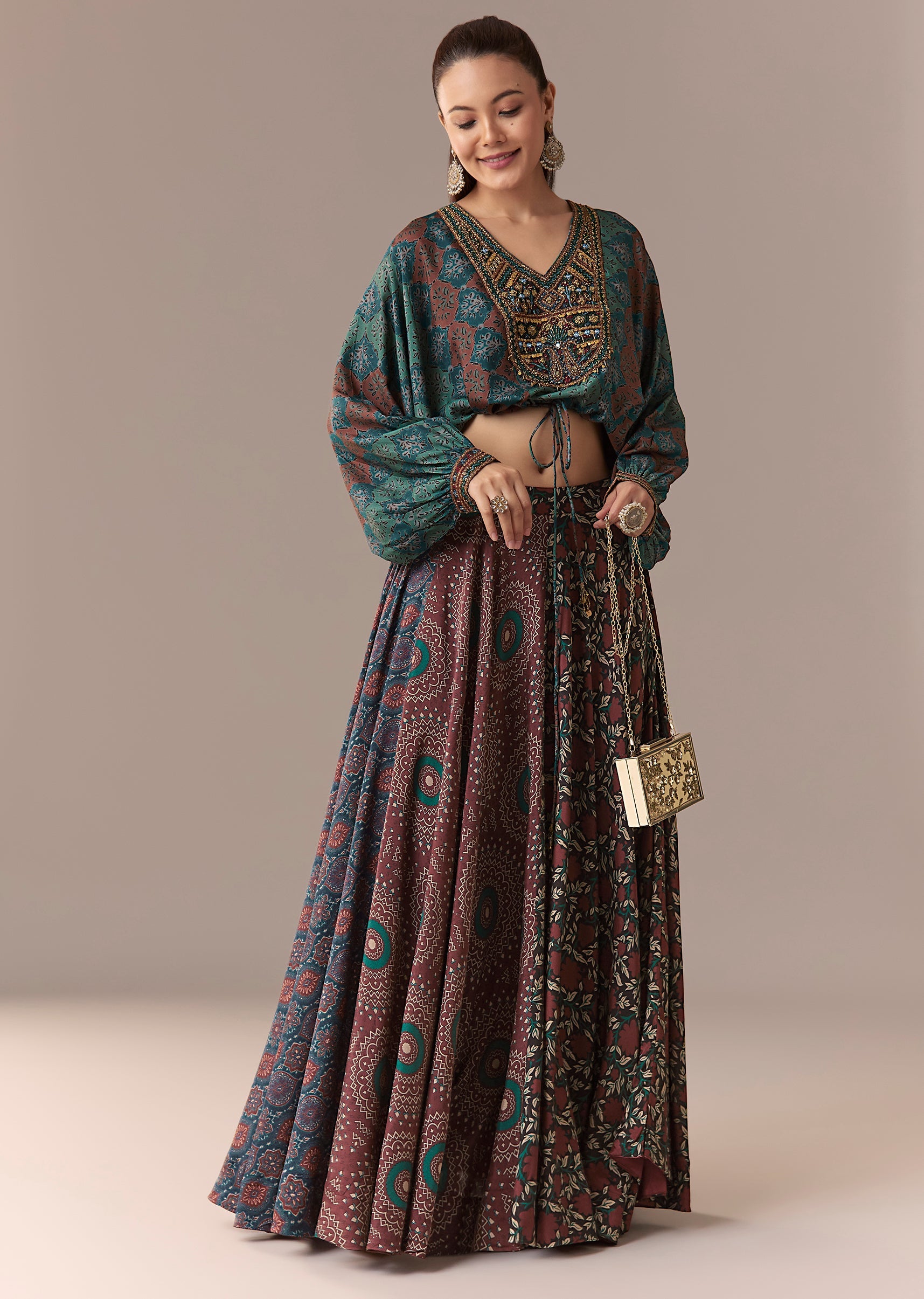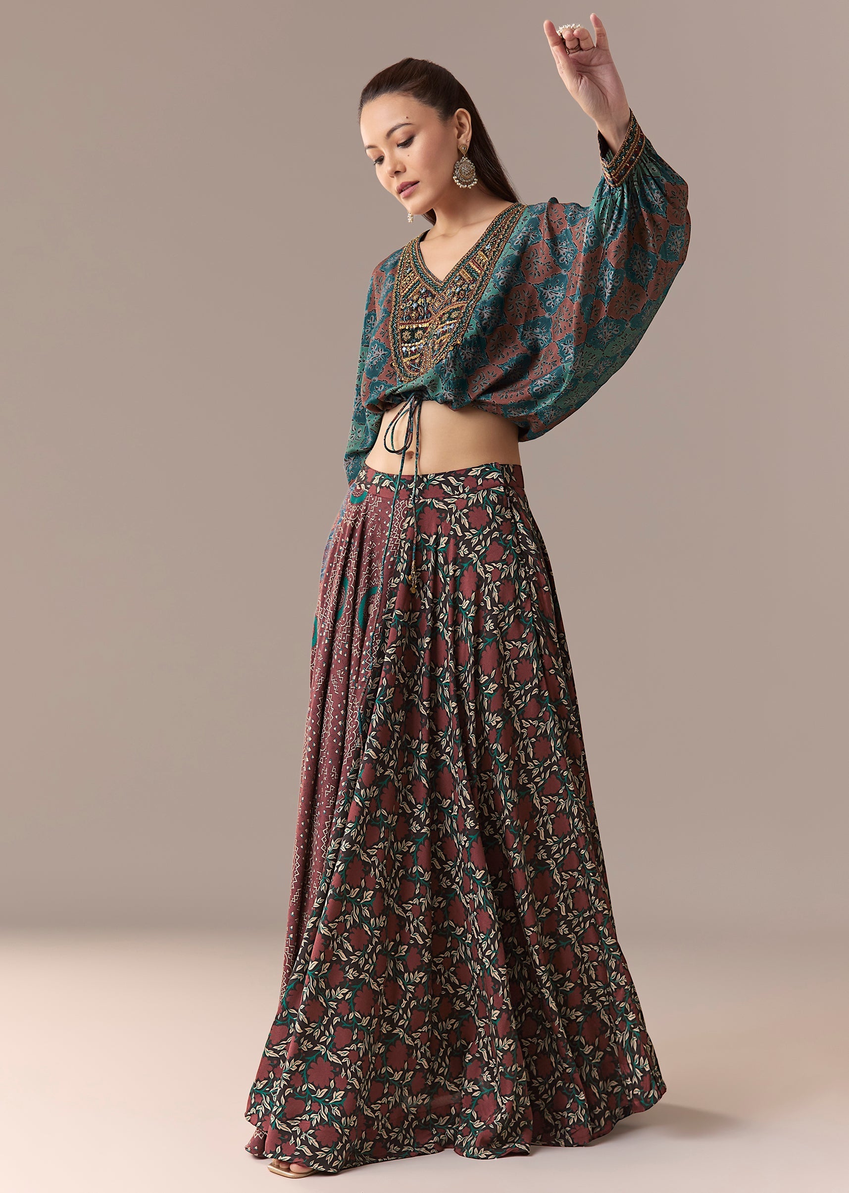 Crafted in muslin, this printed crop top is detailed with sequin and thread work and paired with a flared skirt. Styled with a V-neckline and full sleeves, it’s a contemporary... More Product Details