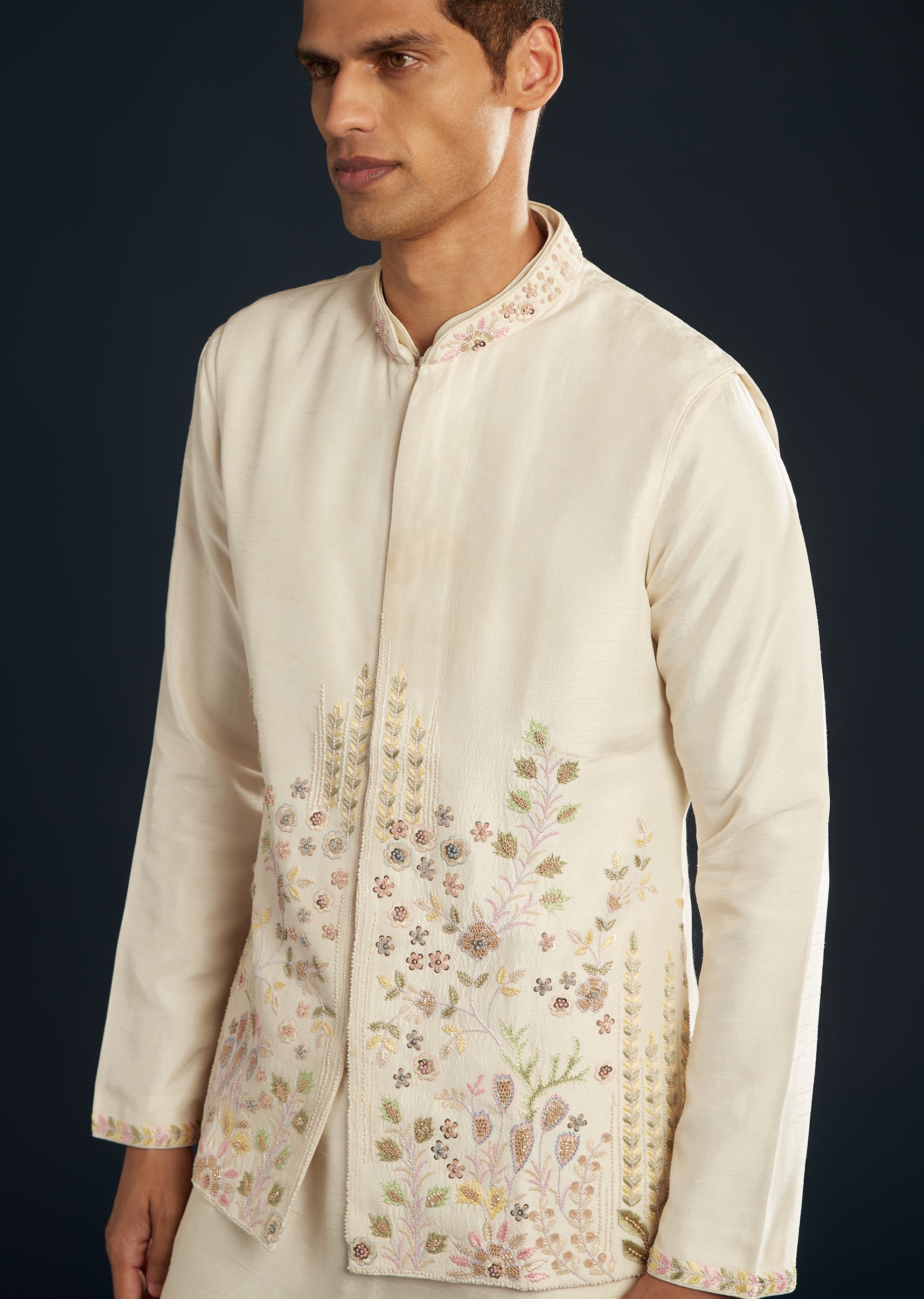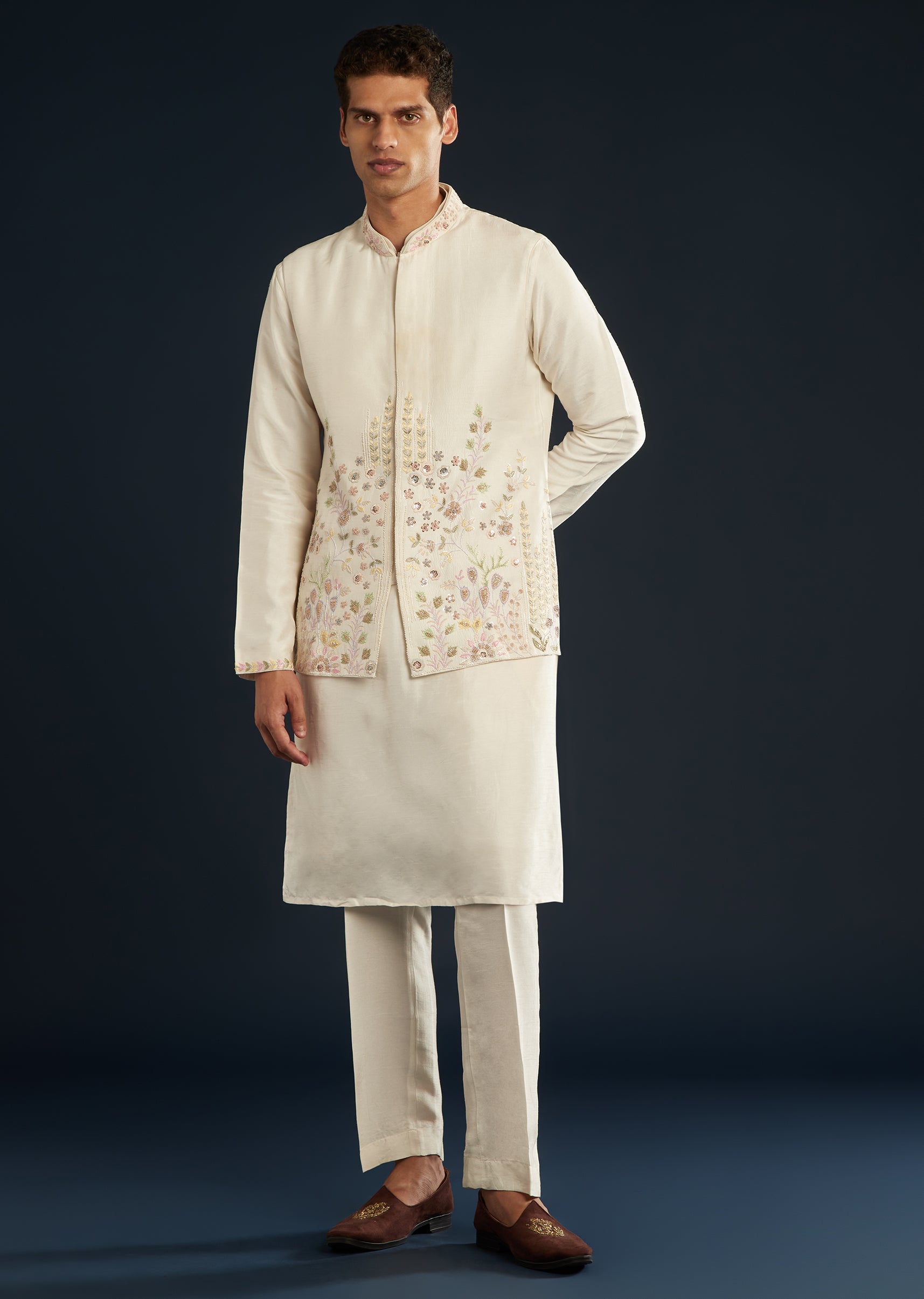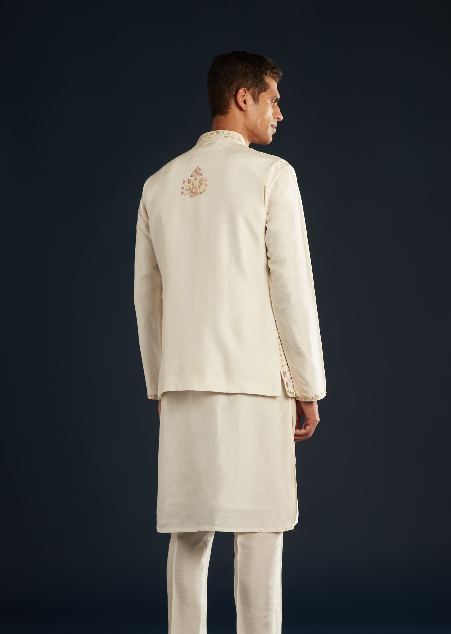 Fit Tips:The jacket skims the torso with defined shoulders, and the men’s kurta beneath falls straight and breathable for easy motion.