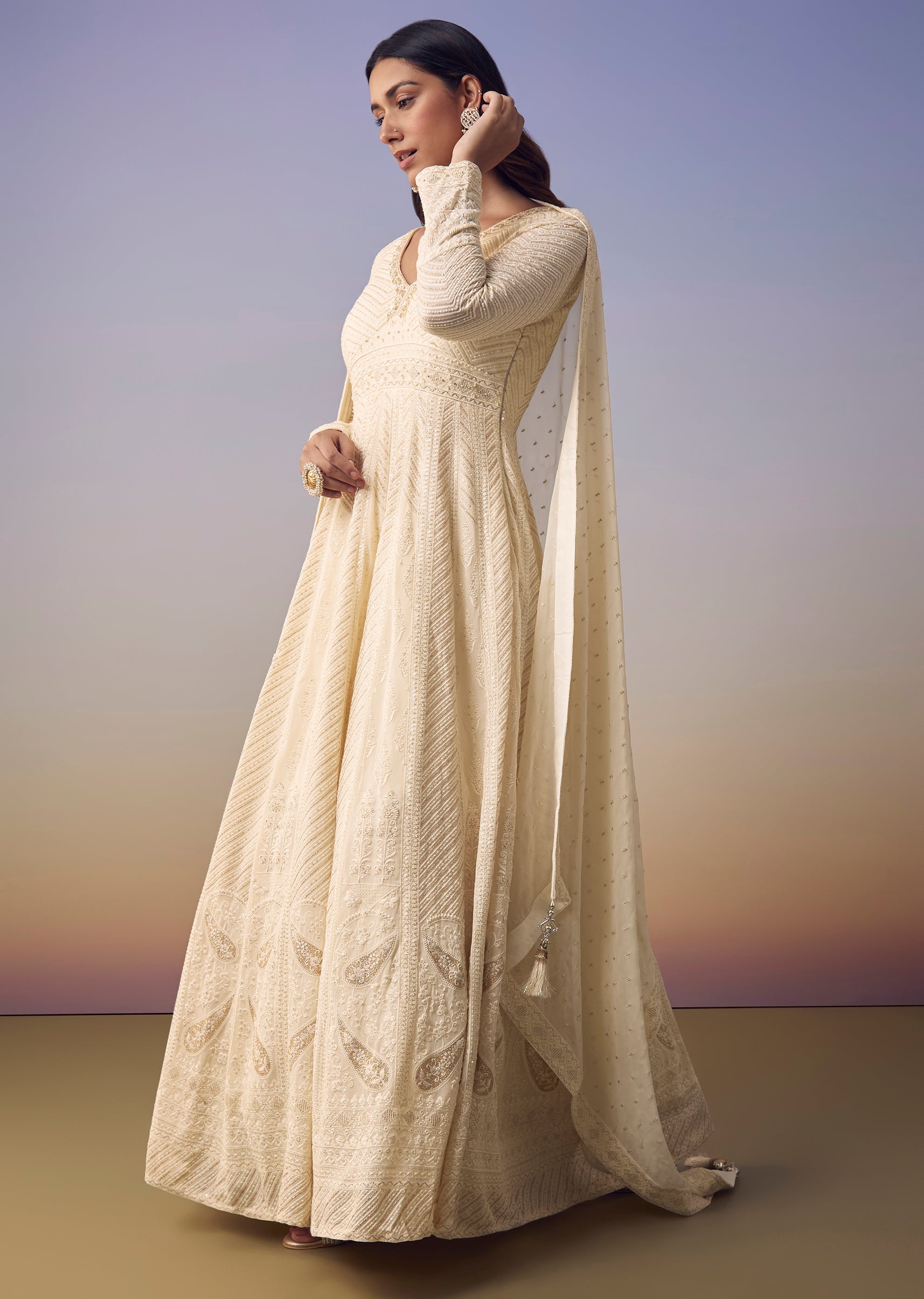 Step into graceful elegance with this ivory floor length Lucknowi work anarkali crafted in soft georgette and adorned with delicate chikankari inspired detailing. The full sleeve design paired with a... More Product Details