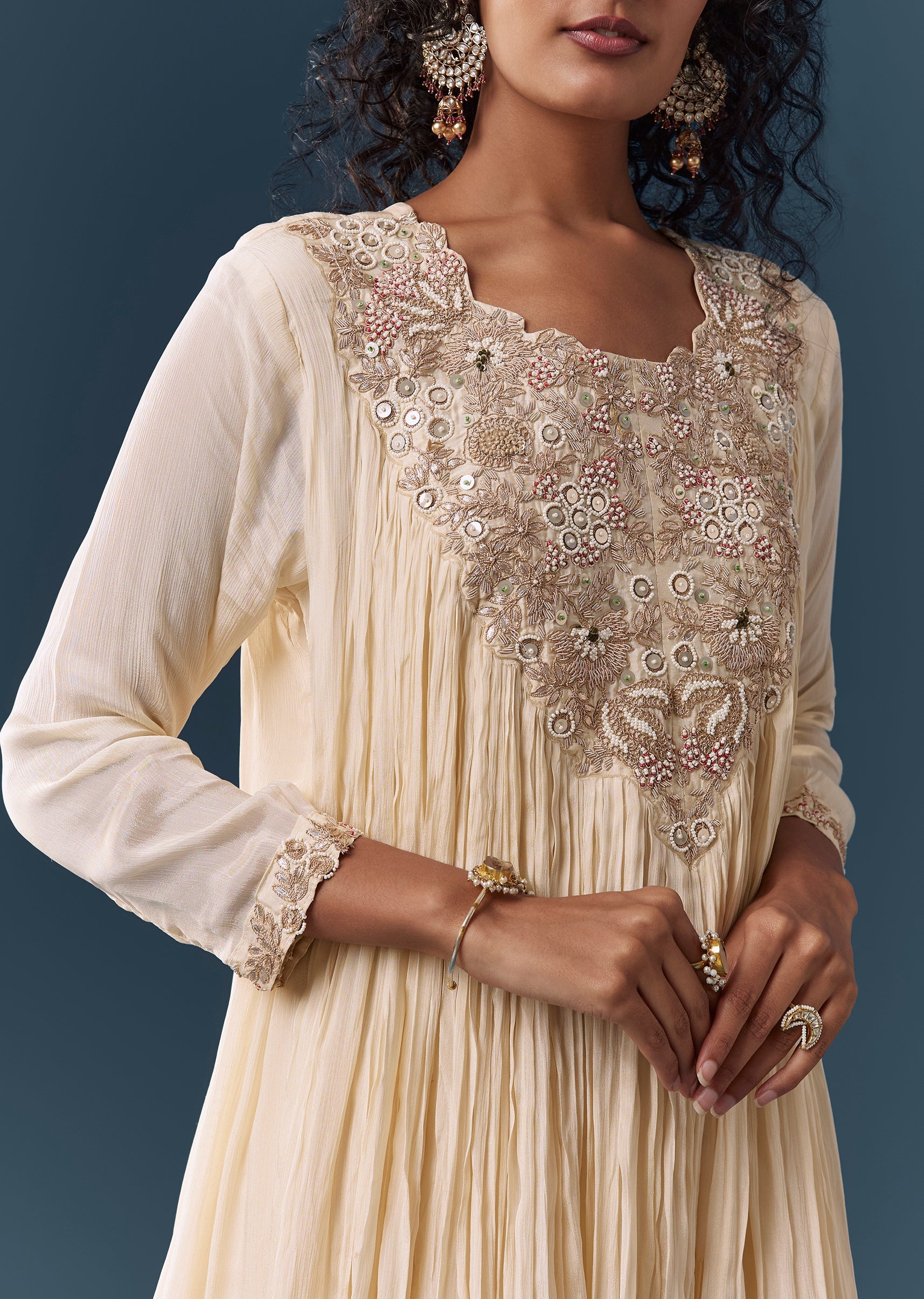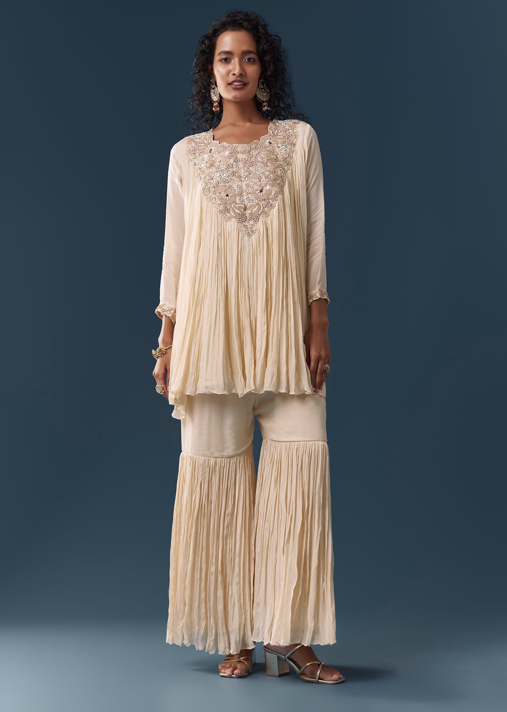 This ivory cape-style sharara set is crafted in chinon and finished with delicate zardosi and moti embellishments for understated glamour. Featuring a round neckline and 3/4th sleeves, the A-line top... More Product Details