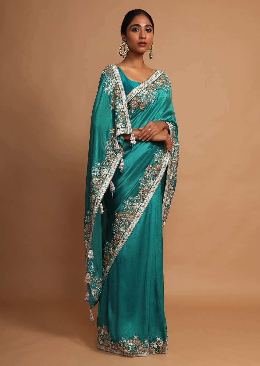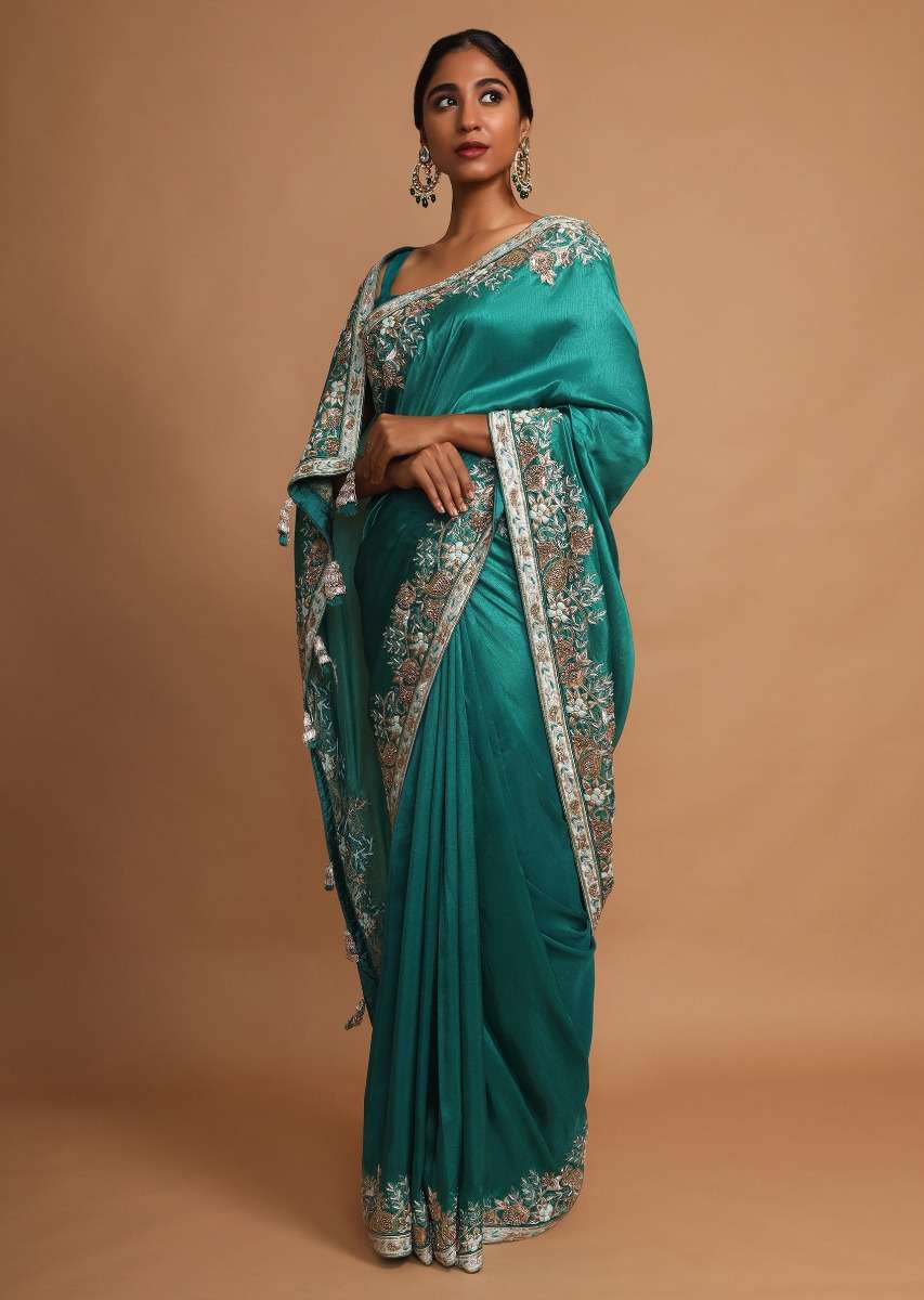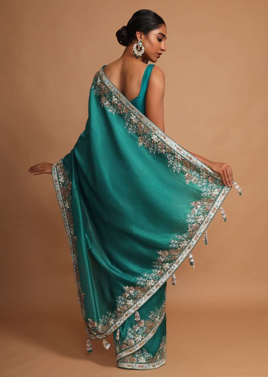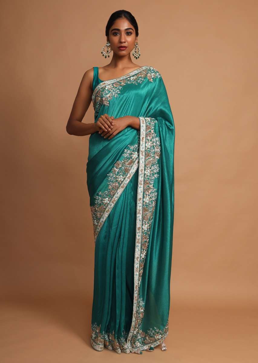 Jade Green Saree In Dupion Silk With Thread And Zardozi Embroidered Floral Border Online - Kalki Fashion