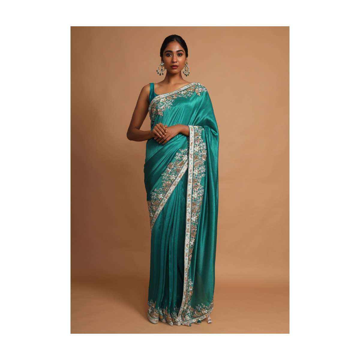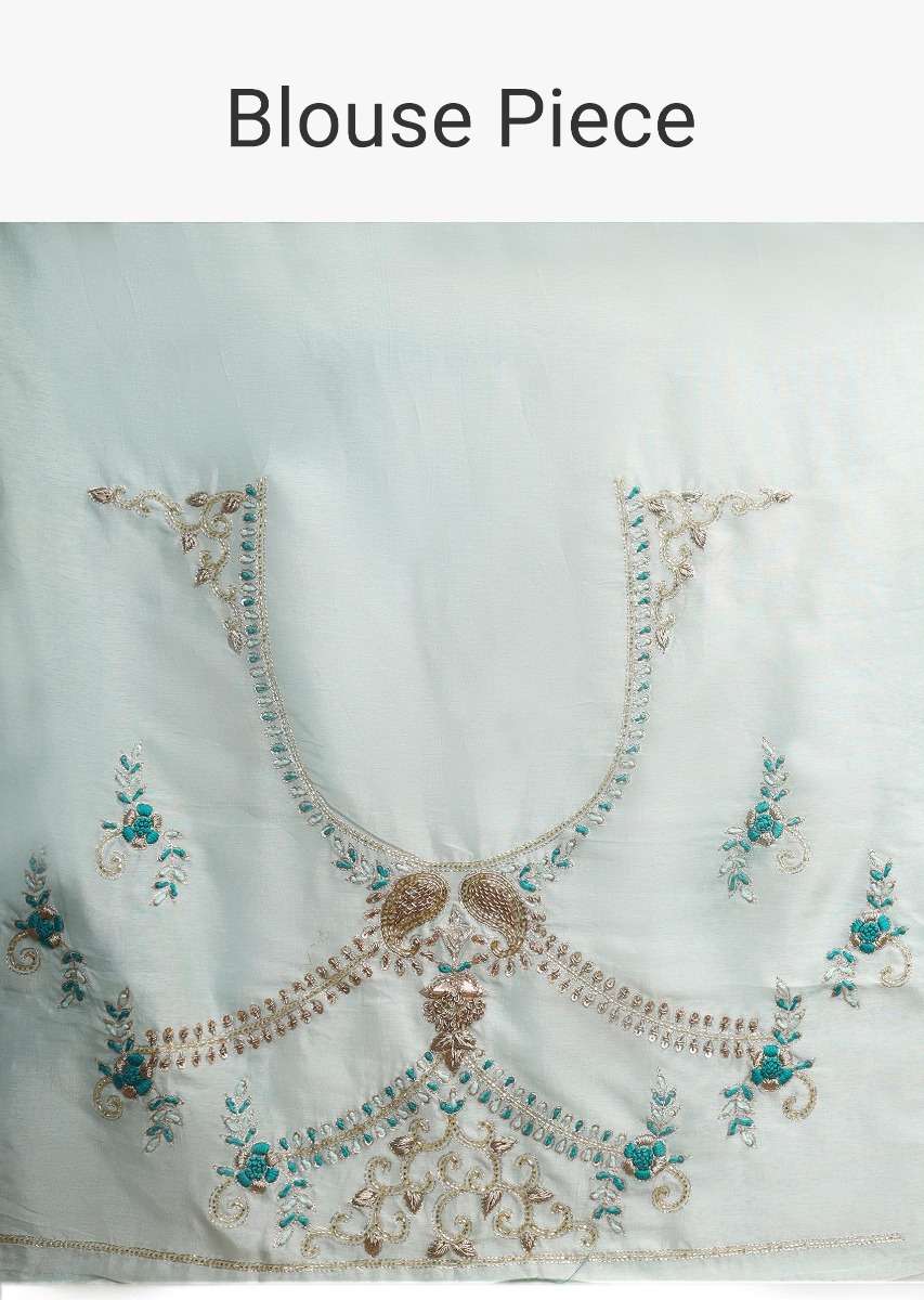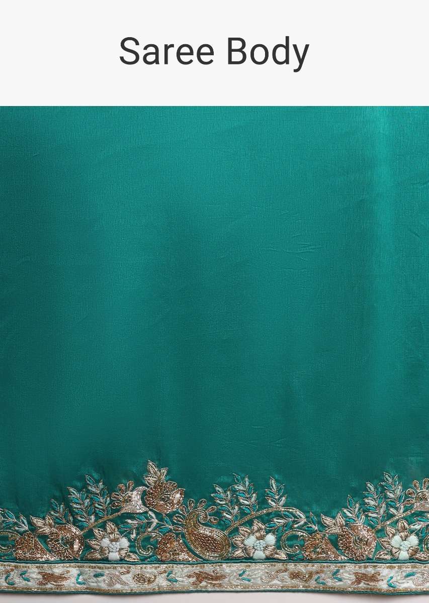 Jade Green Saree In Dupion Silk With Thread And Zardozi Embroidered Floral Border Online - Kalki Fashion