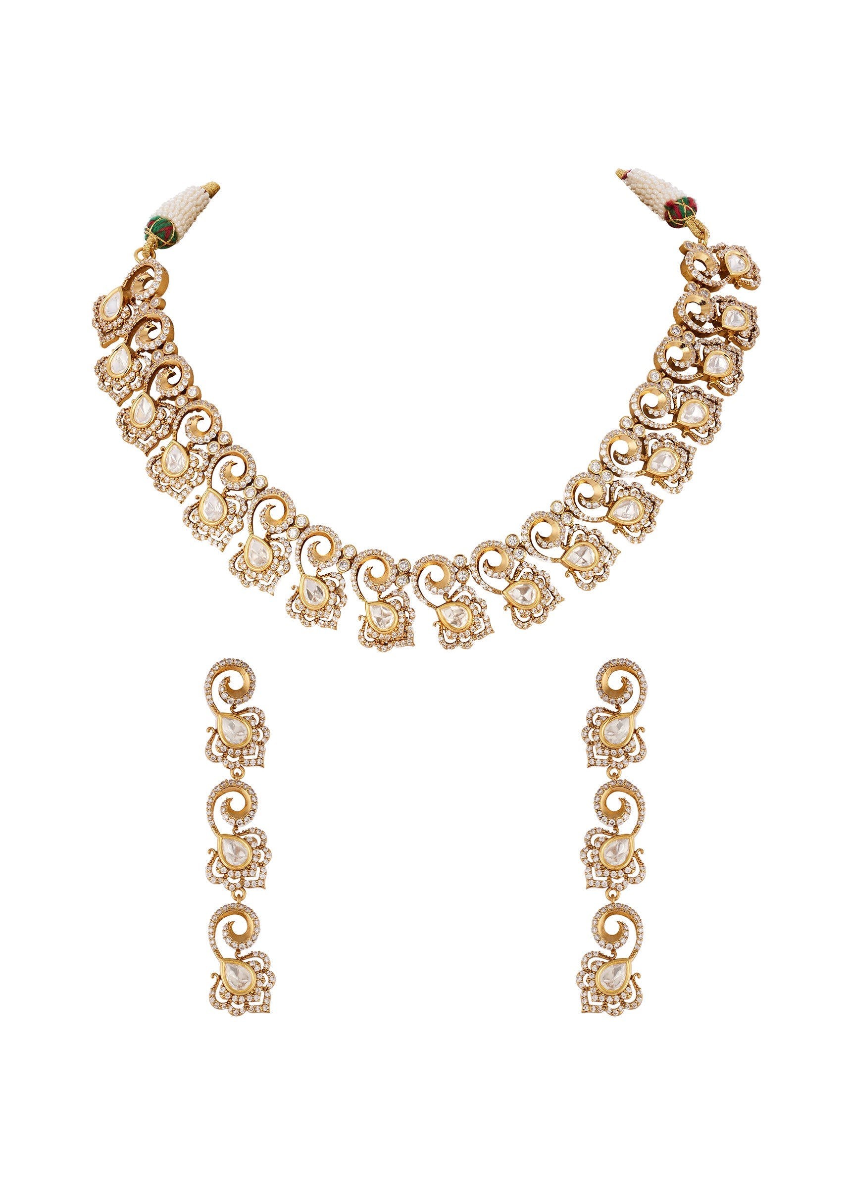 A handcrafted gold white jewellery set created using the traditional Kundan Jadau technique. It features Polki uncut diamonds and semi precious stones with delicate drops reflecting exquisite craftsmanship and classic... More Product Details