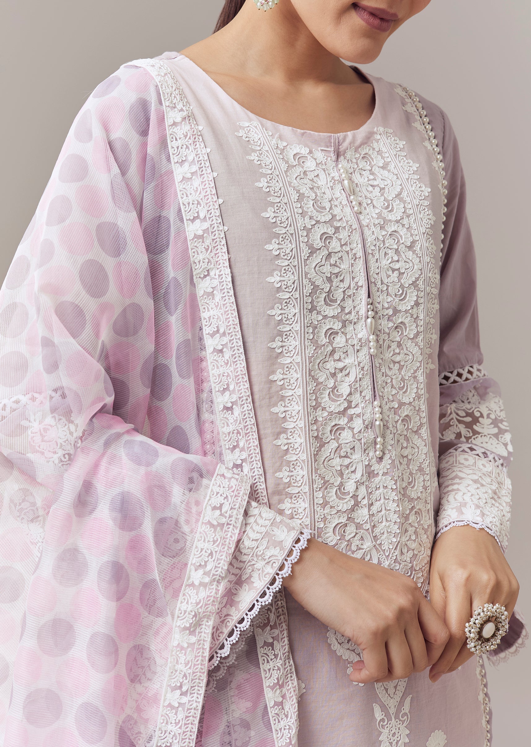 Soft and elegant, this lavender kurta set is inspired by refined Pakistani aesthetics. Crafted in breathable cotton fabric, the kurta is enhanced with delicate thread work that adds subtle texture... More Product Details