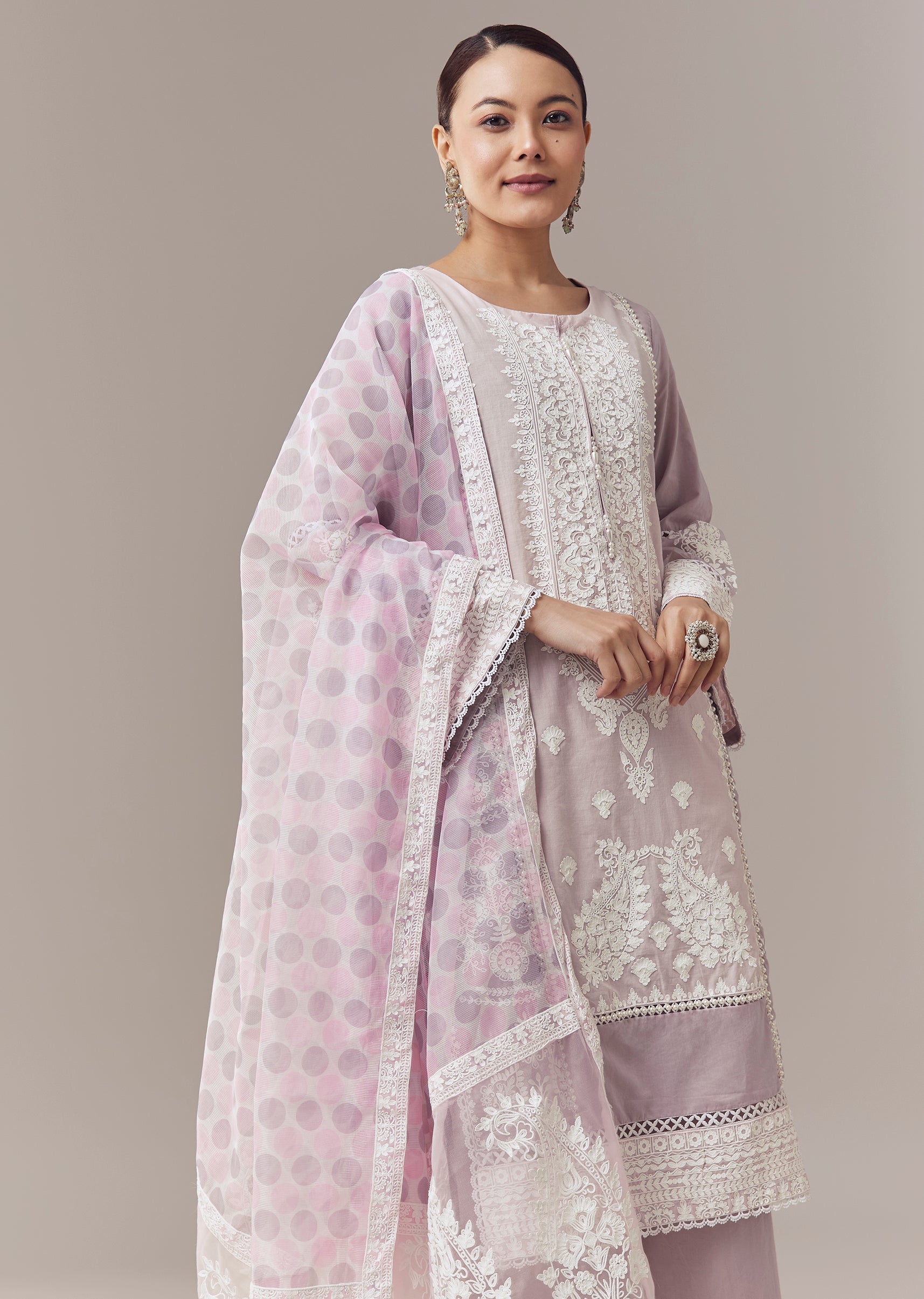 Lavender Pakistani Style Kurta Set With Thread Work And Dupatta