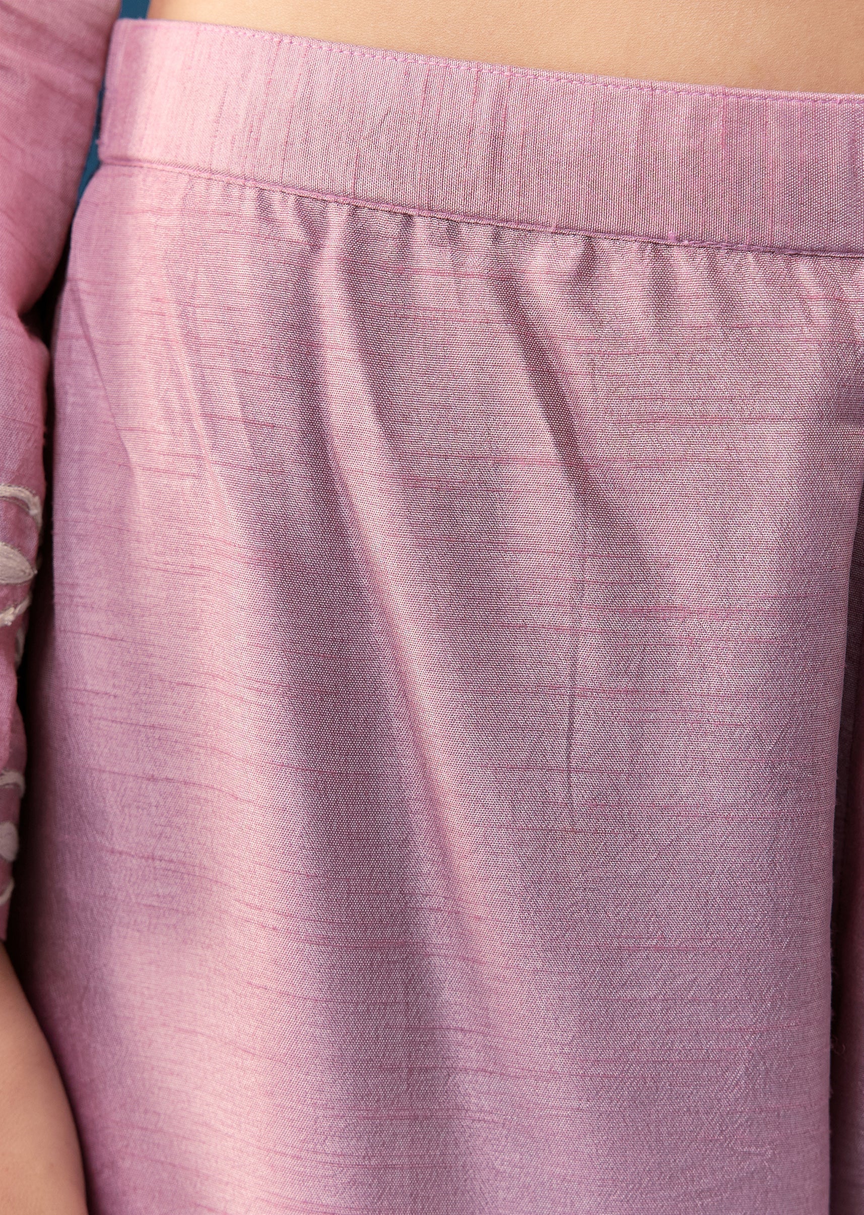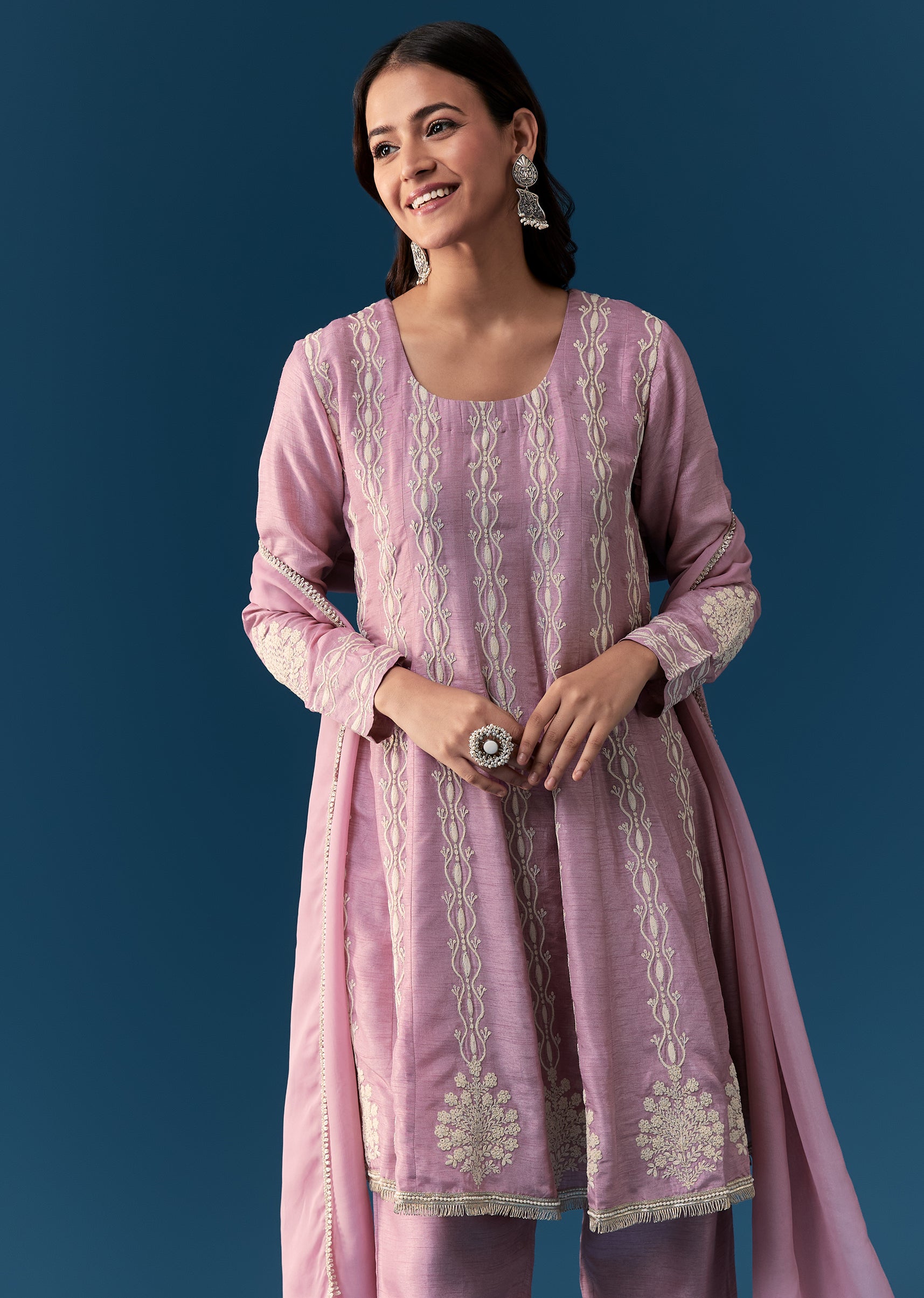 This lavender pastel anarkali suit is crafted in luxurious silk with exquisite thread work embroidery. The suit features full sleeves and a classic round neckline for a timeless look. Designed... More Product Details