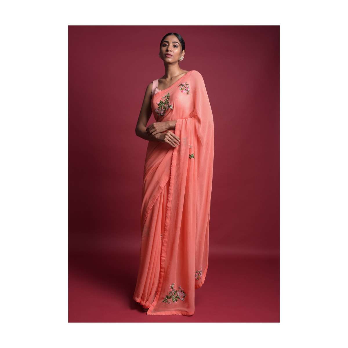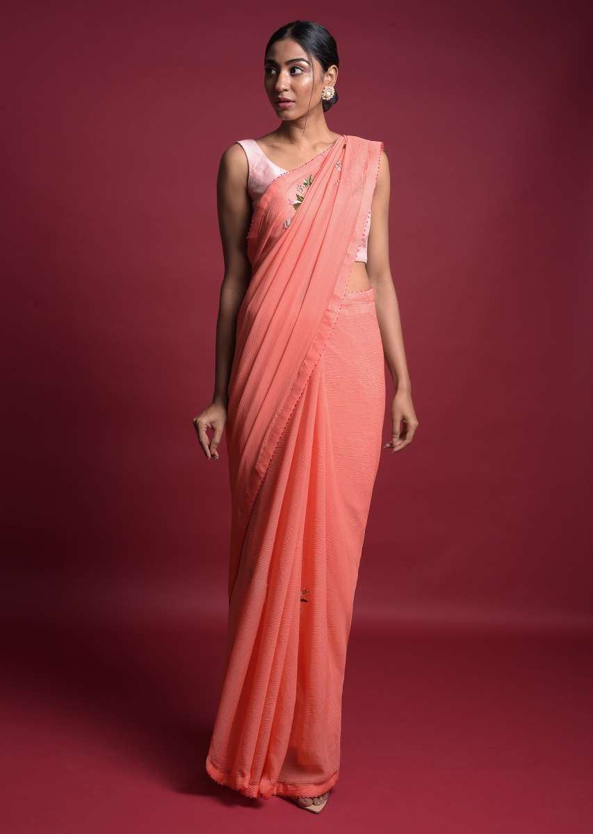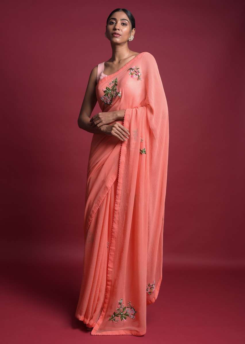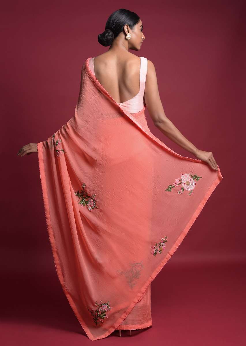 Lei Flower Peach Saree In Chiffon With Thread And Beads Embroidered Floral Motifs Online - Kalki Fashion