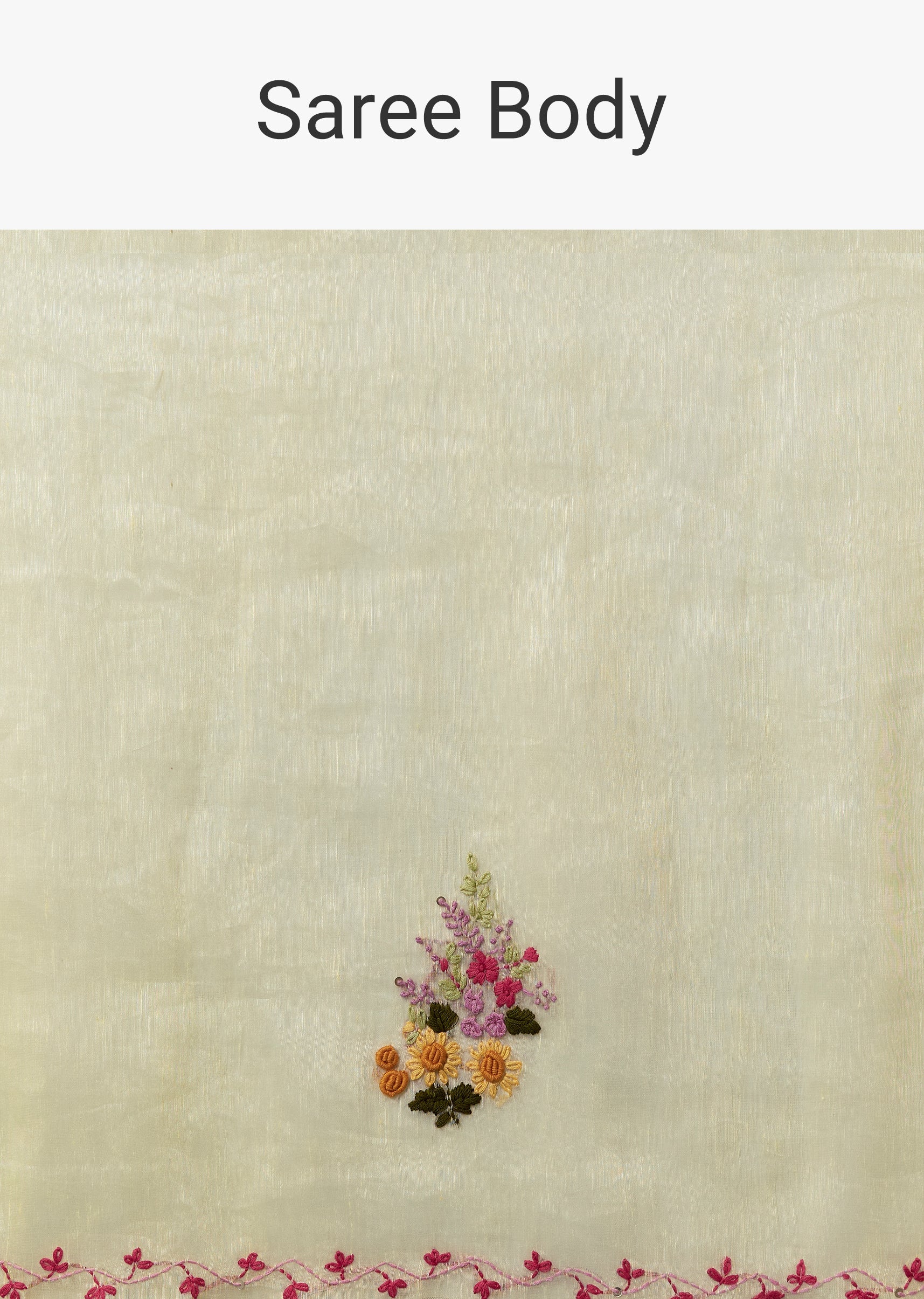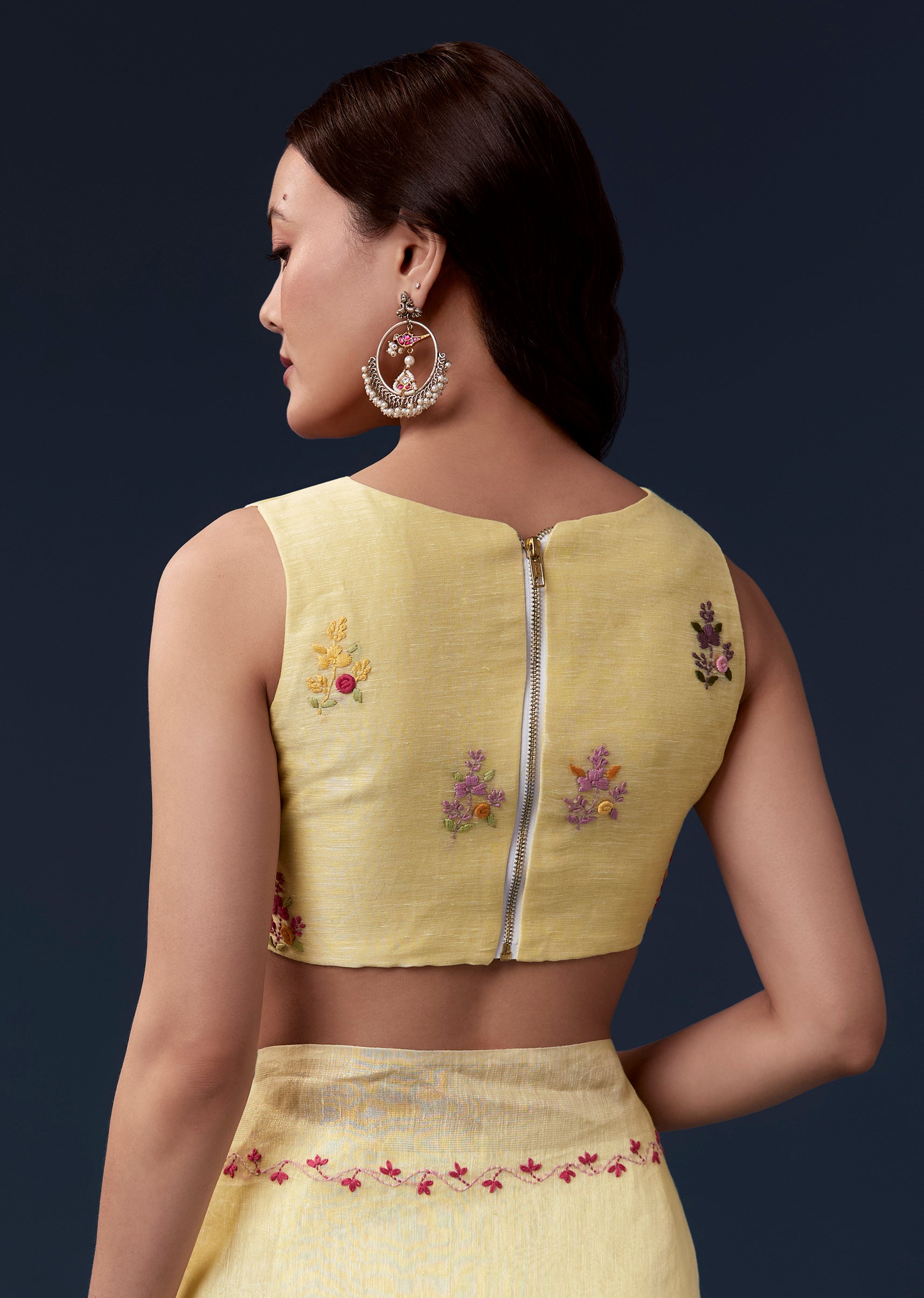 Lemon Yellow Linen Saree With Resham Thread Floral Embroidery