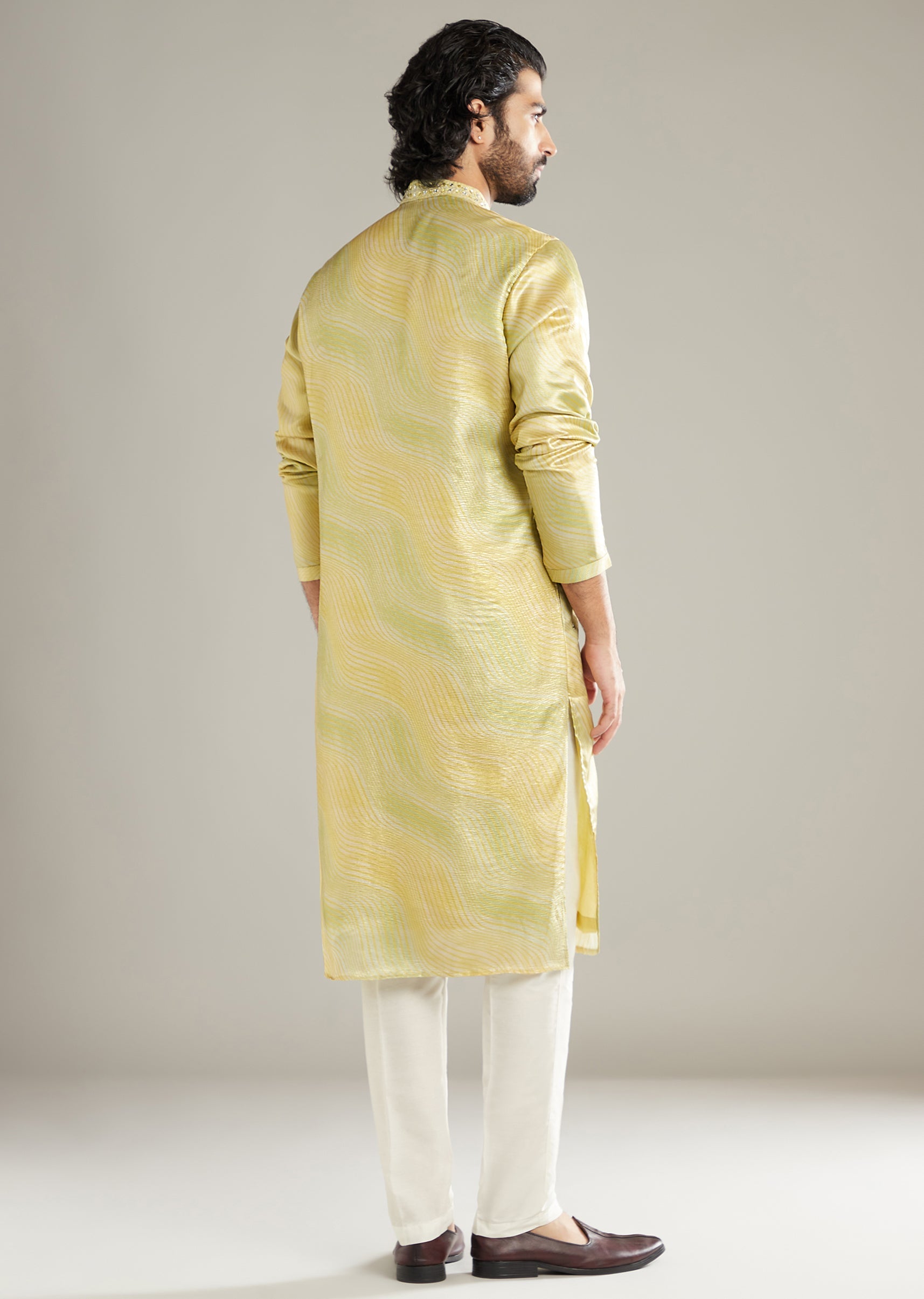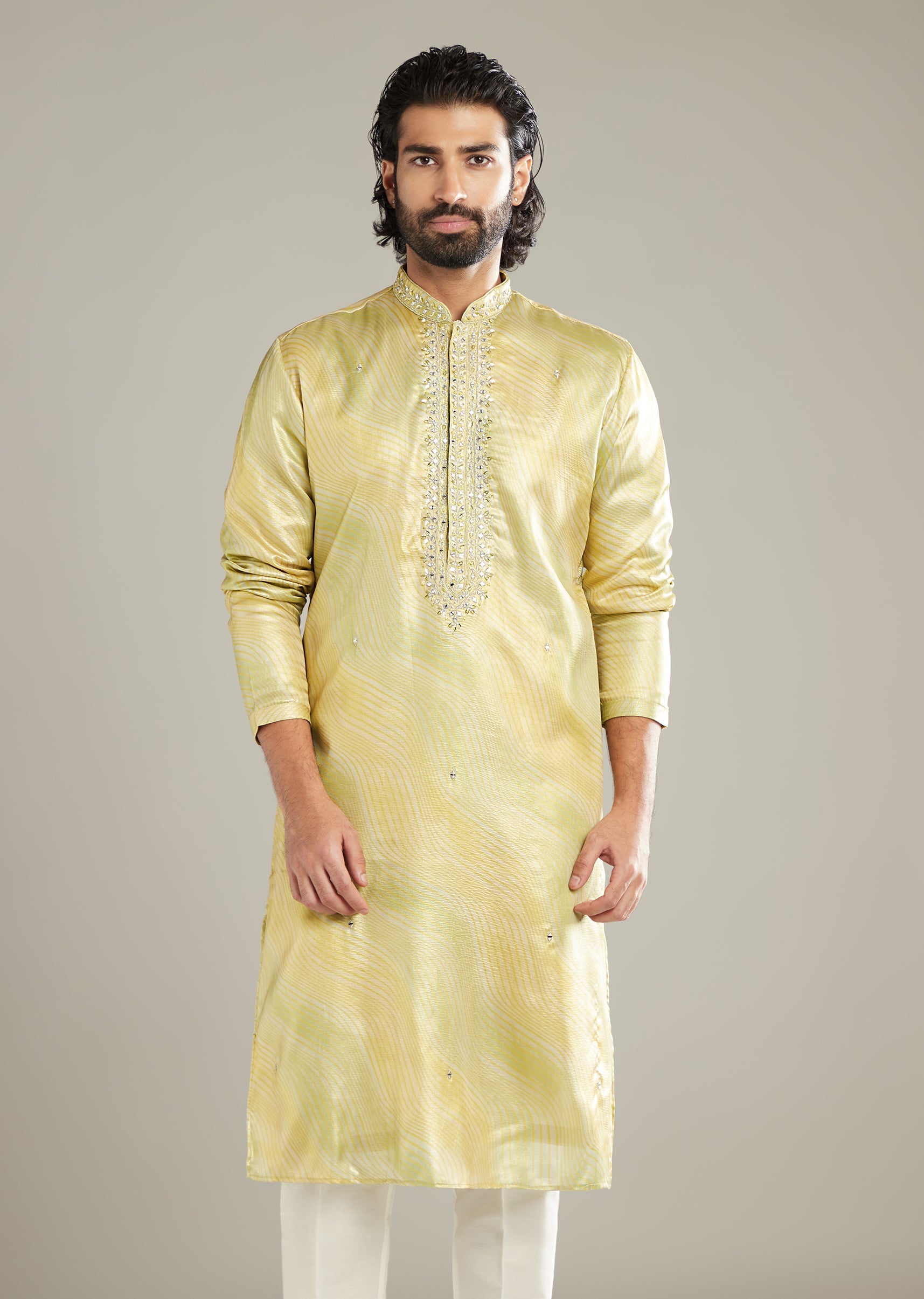 Sunny and precise, this lemon yellow art silk men’s kurta set pairs a fine all-over print with mirror accents along the placket for a clean glint. The pastel base stays... More Product Details