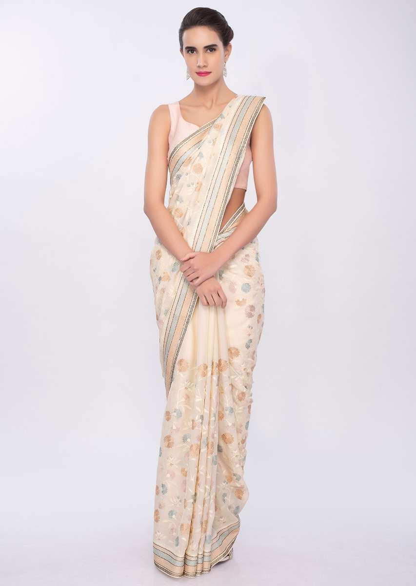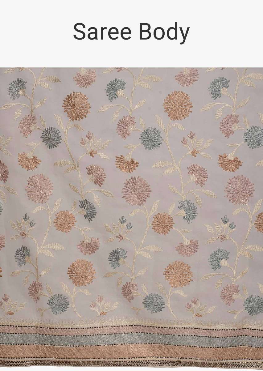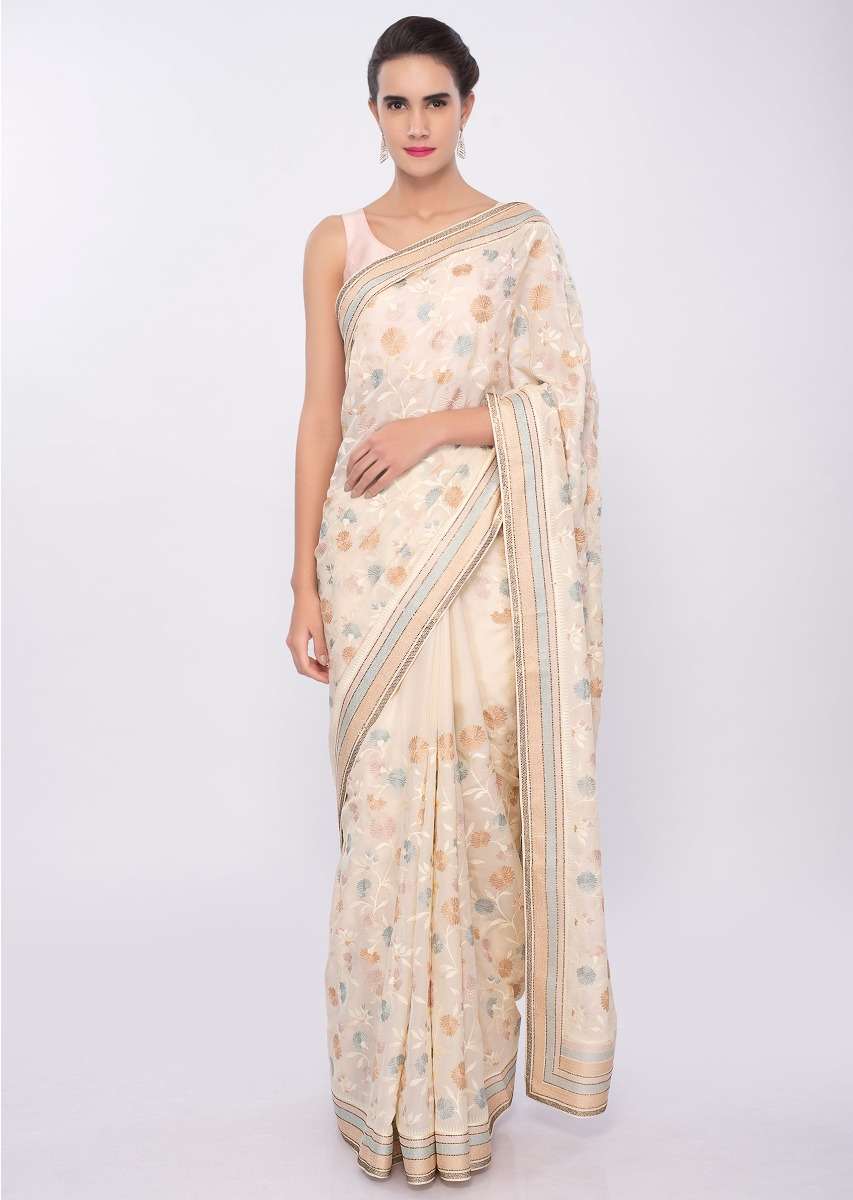 Light Cream satin silk saree in multi color floral thread embroidered jaal work only on Kalki