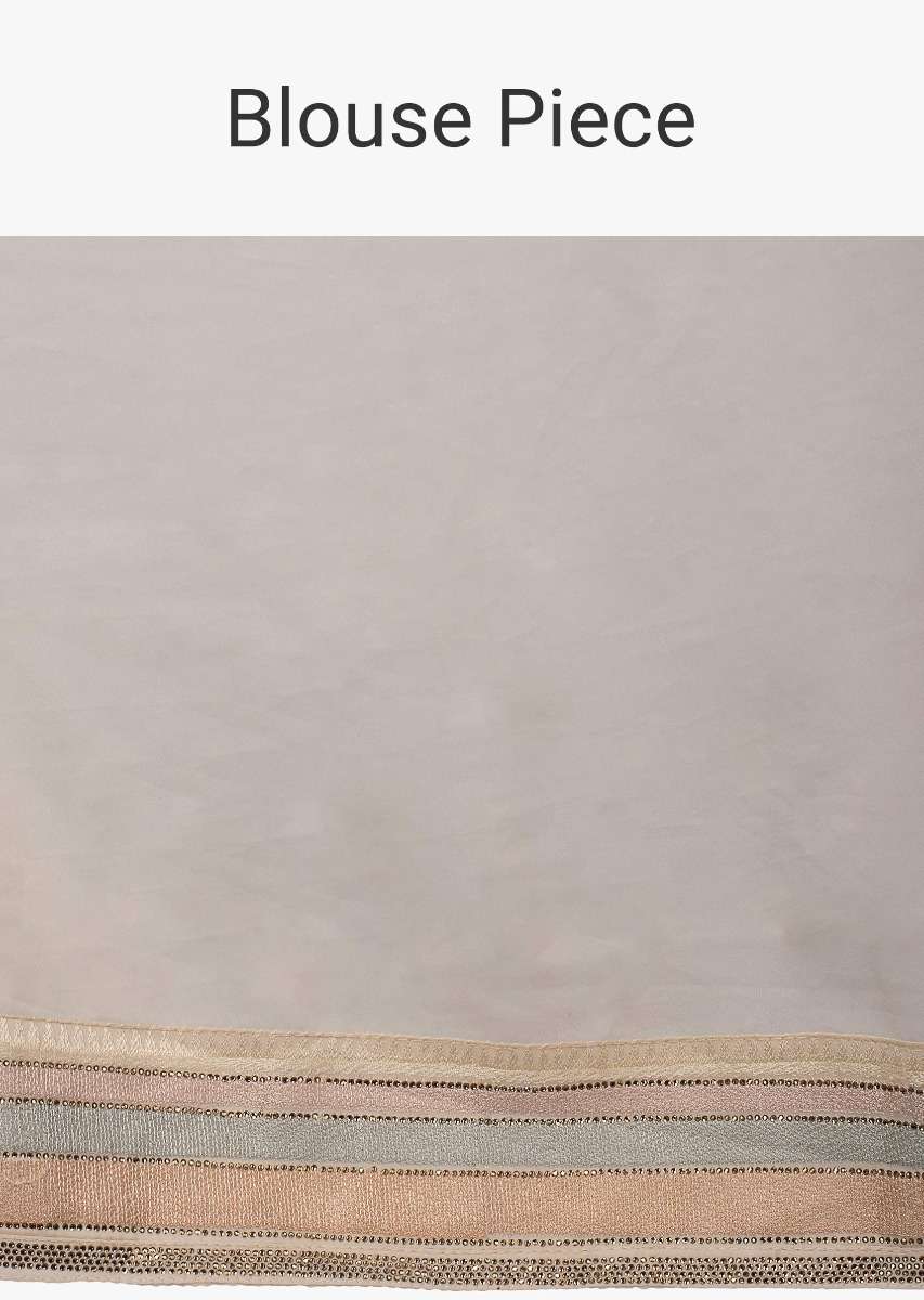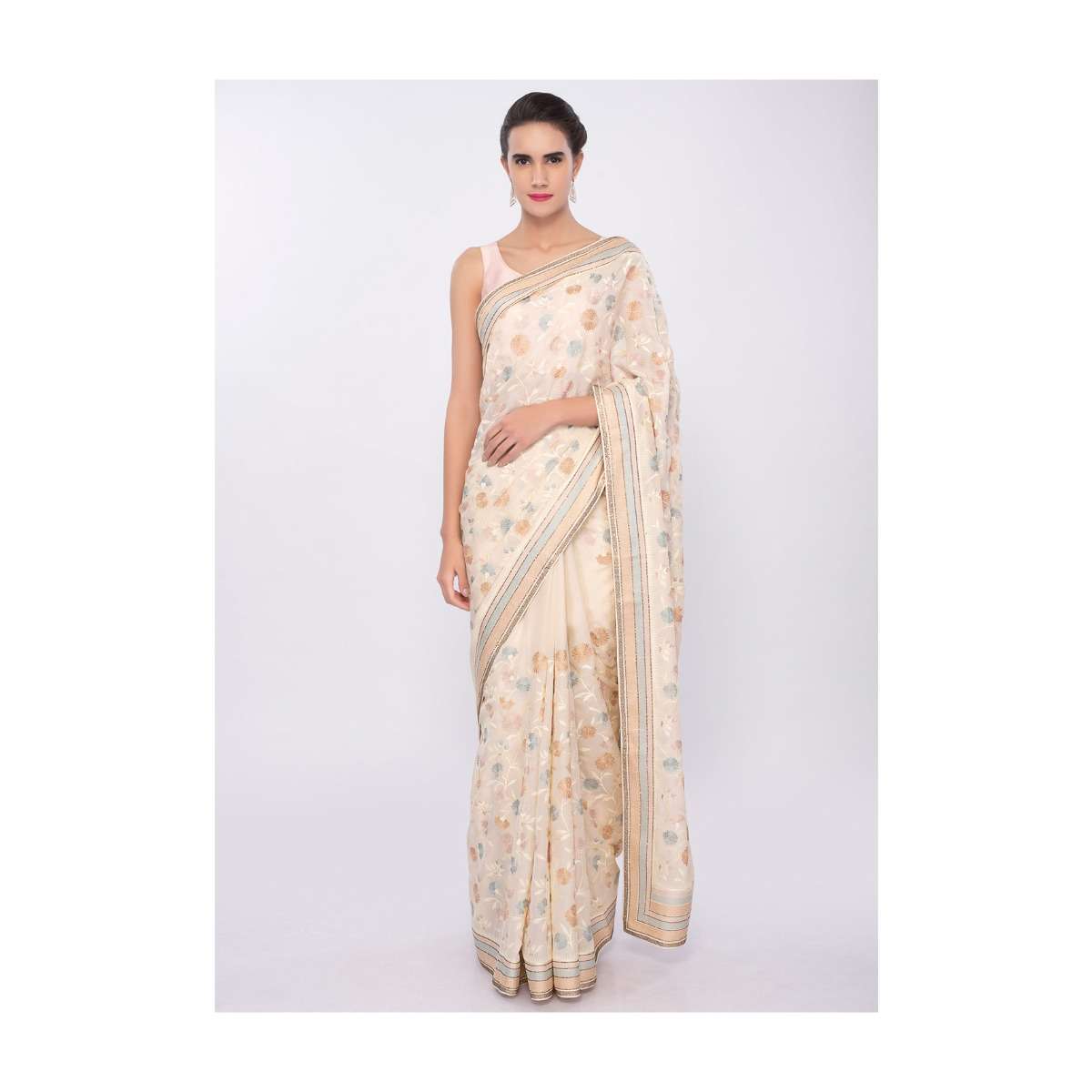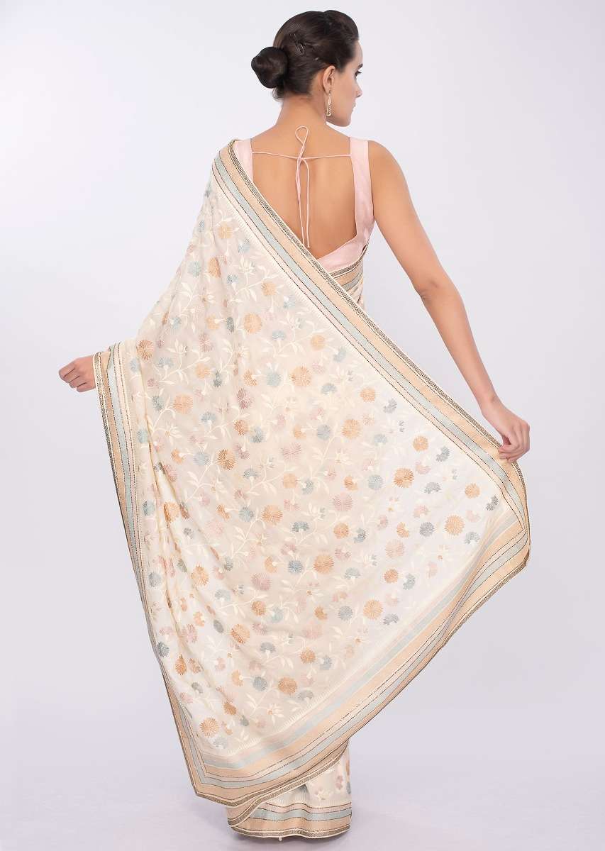 Light Cream satin silk saree in multi color floral thread embroidered jaal work only on Kalki