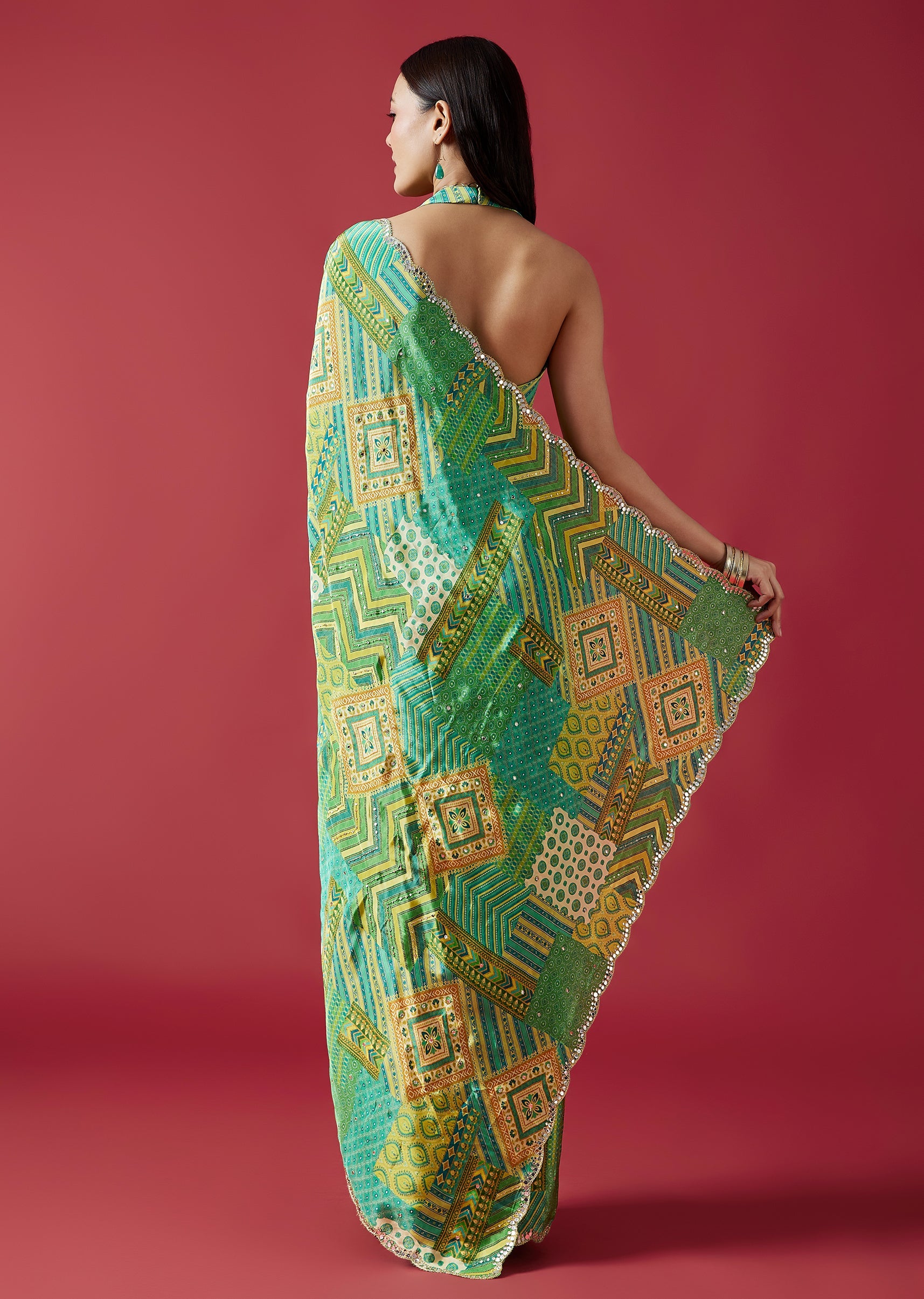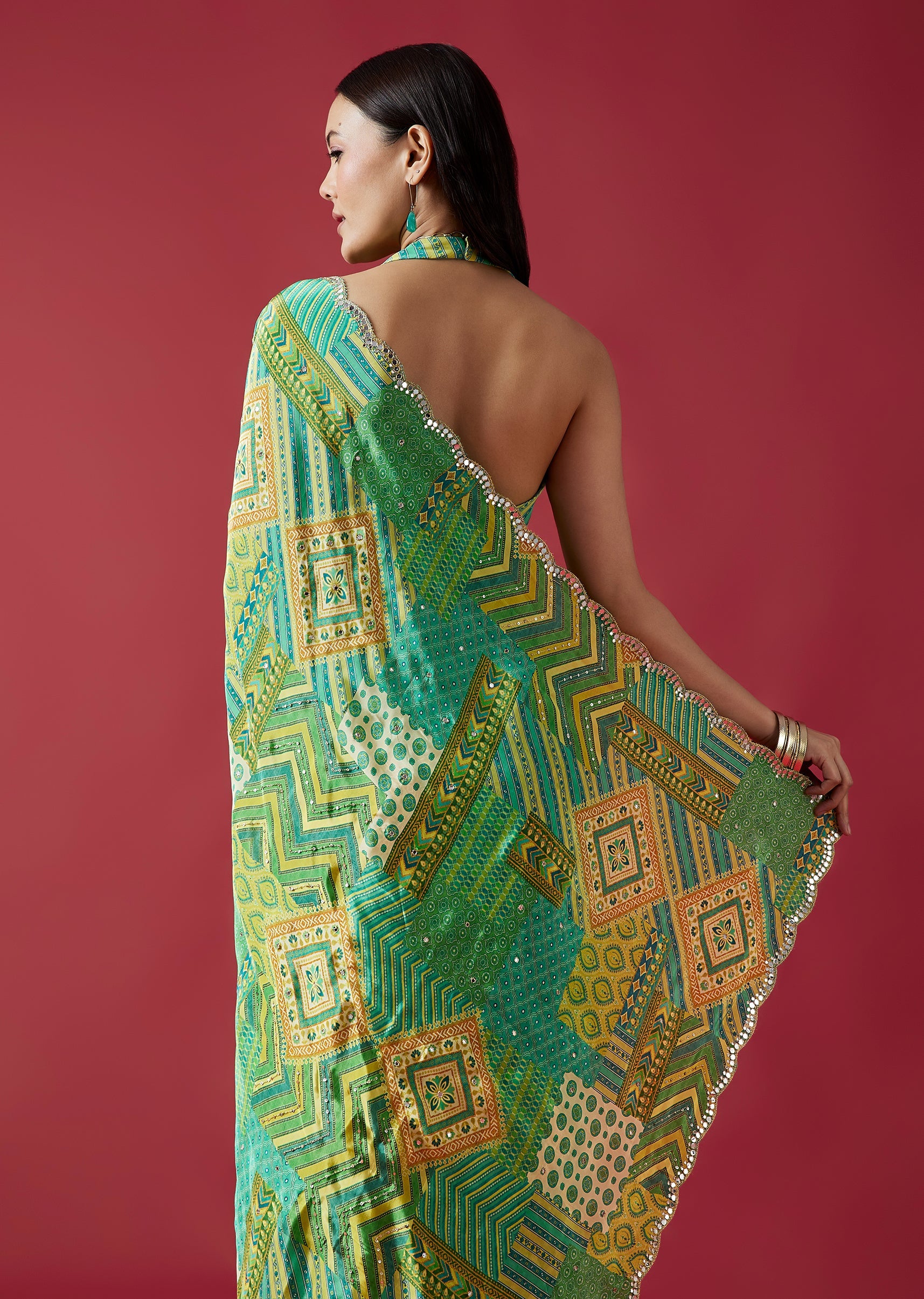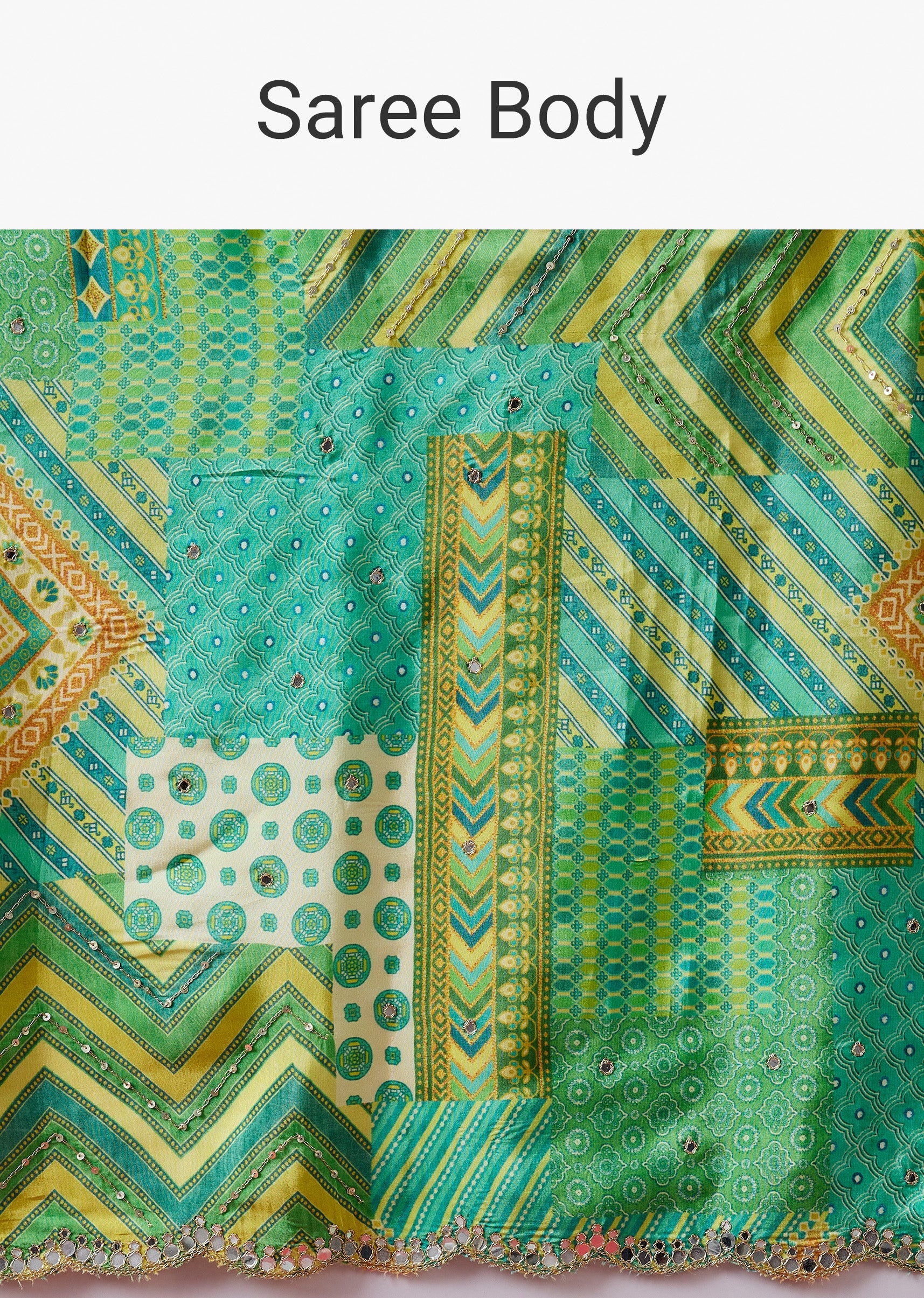 A refreshing light green crepe silk saree featuring multi-shade prints and a scalloped border embellished with mirror embroidery. Paired with a striped printed blouse fabric, this saree blends modern patterns with festive charm. Awarded as the Most Trusted Brand, we're delivering styles you love, just as promised.