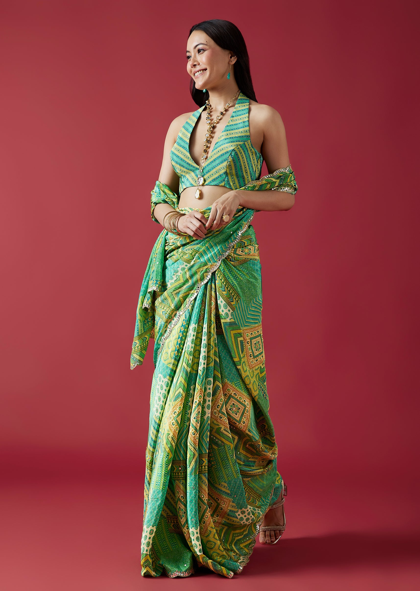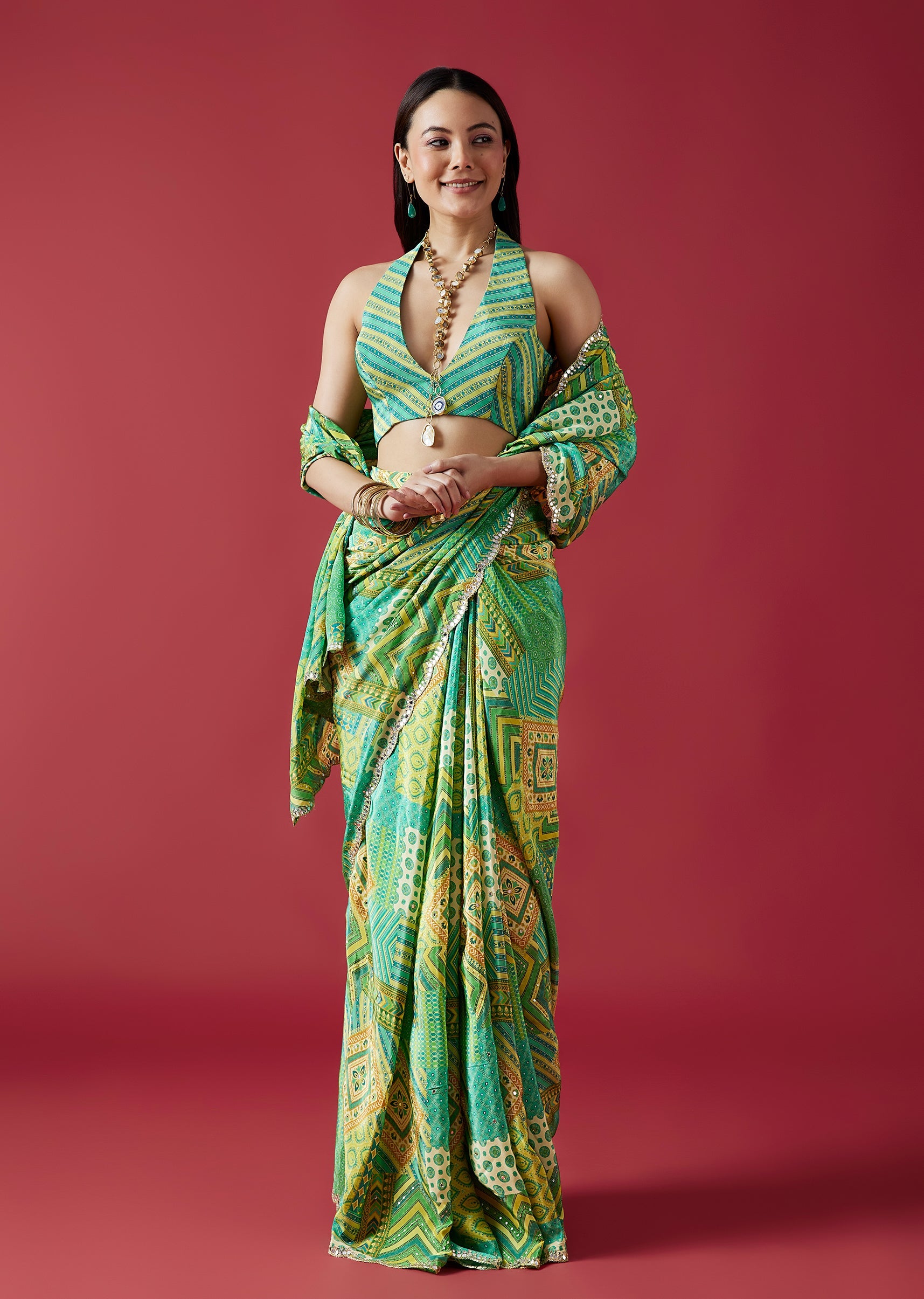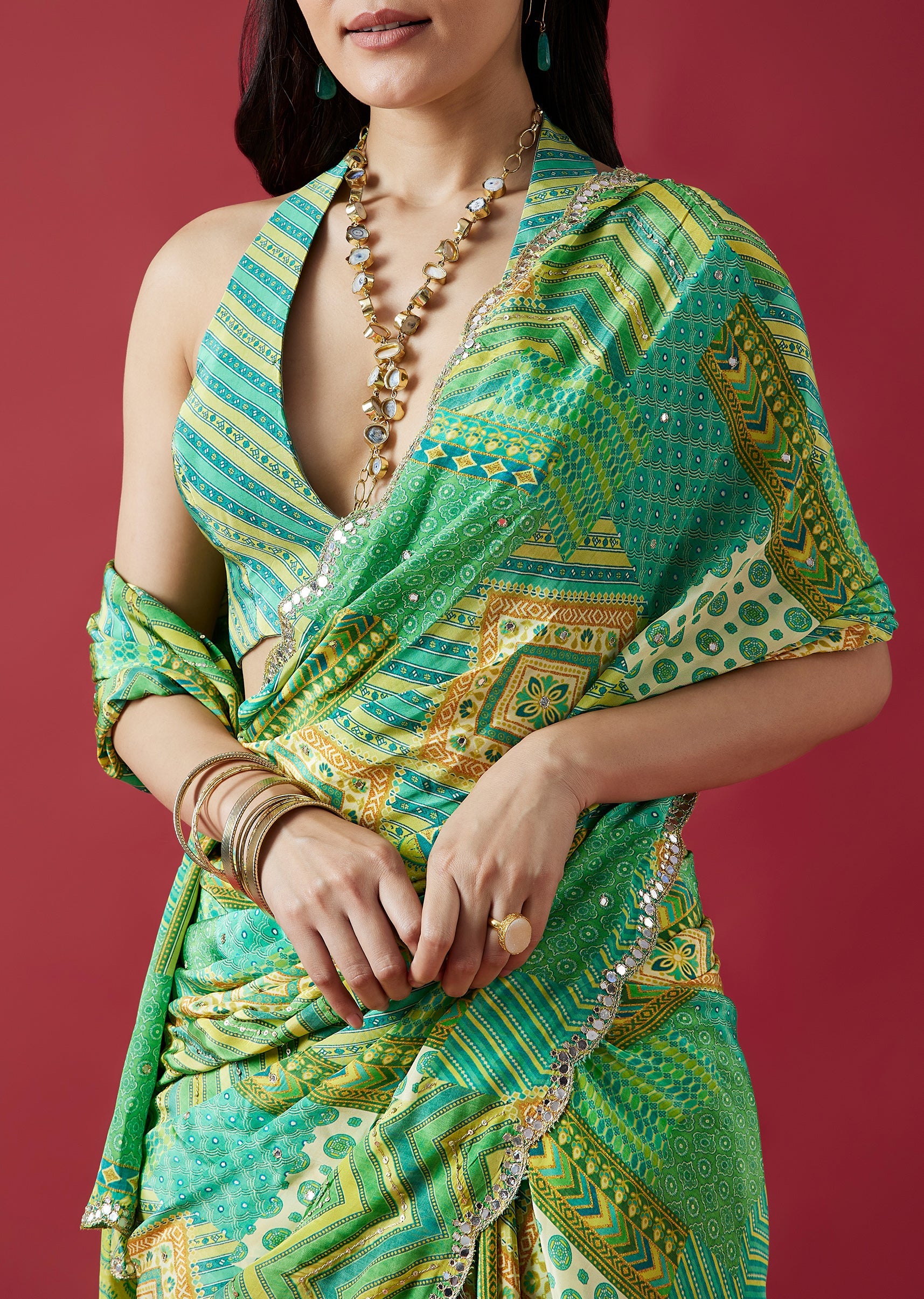 A refreshing light green crepe silk saree featuring multi-shade prints and a scalloped border embellished with mirror embroidery. Paired with a striped printed blouse fabric, this saree blends modern patterns with festive charm. Awarded as the Most Trusted Brand, we're delivering styles you love, just as promised.