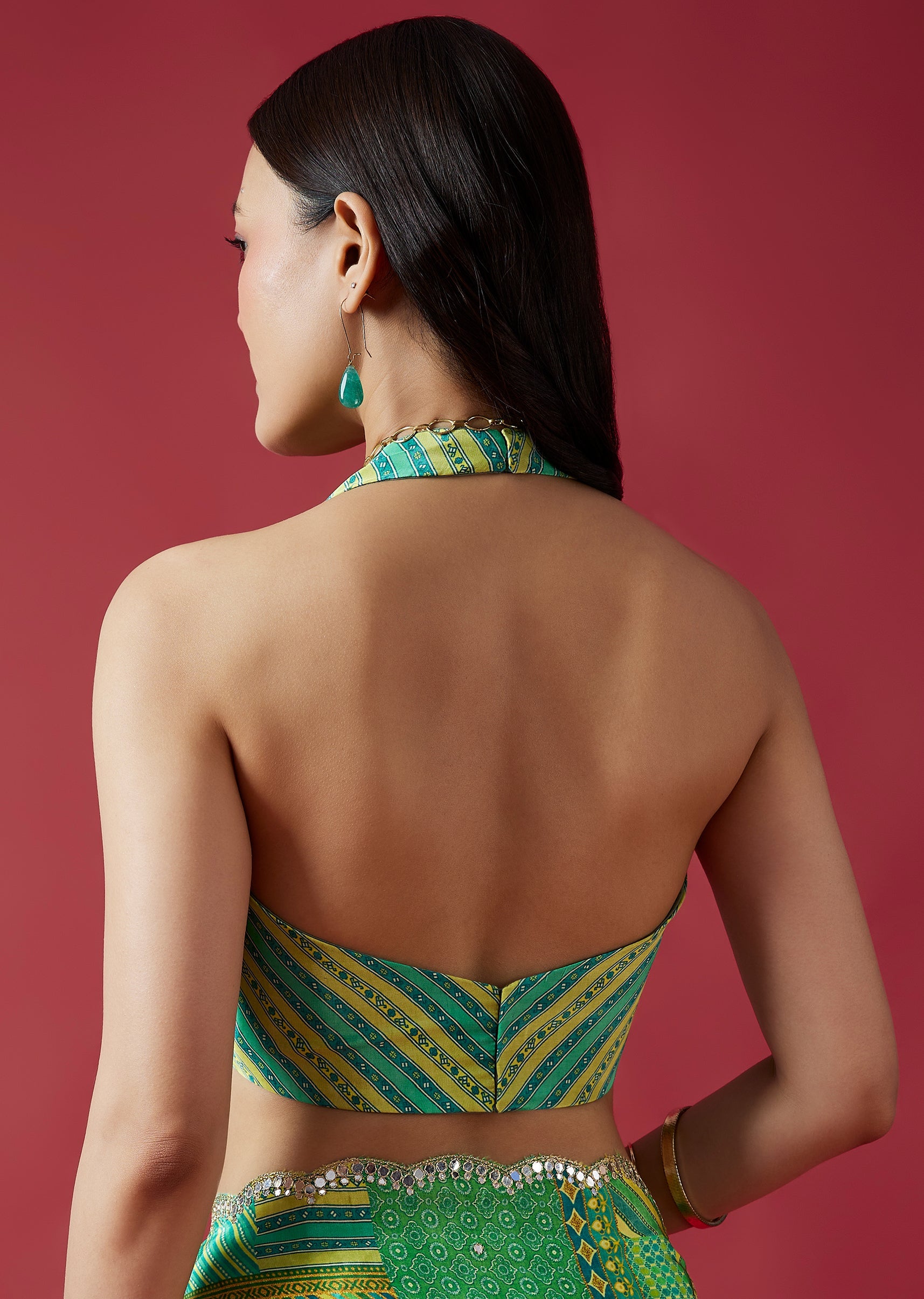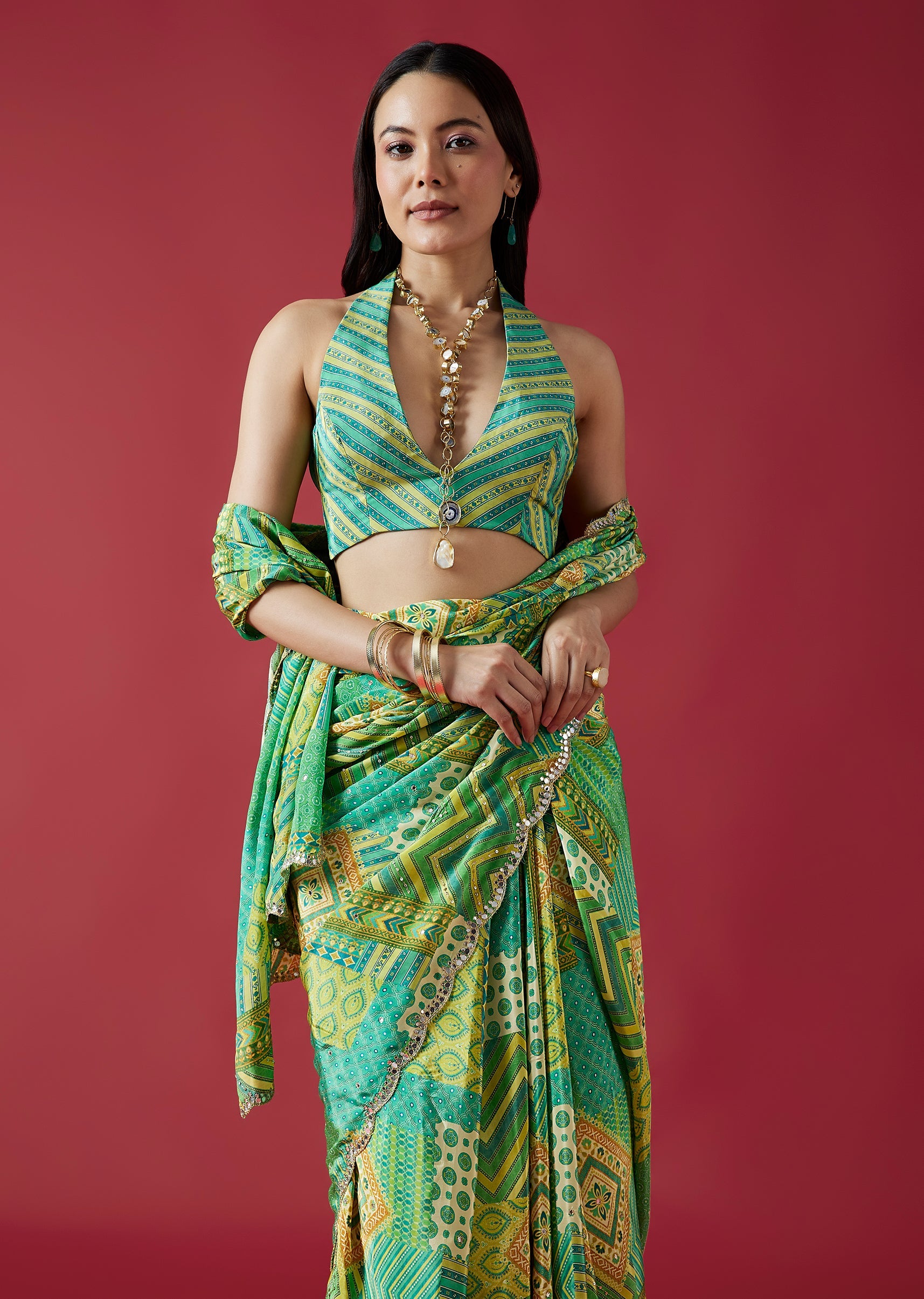 A refreshing light green crepe silk saree featuring multi-shade prints and a scalloped border embellished with mirror embroidery. Paired with a striped printed blouse fabric, this saree blends modern patterns... More Product Details