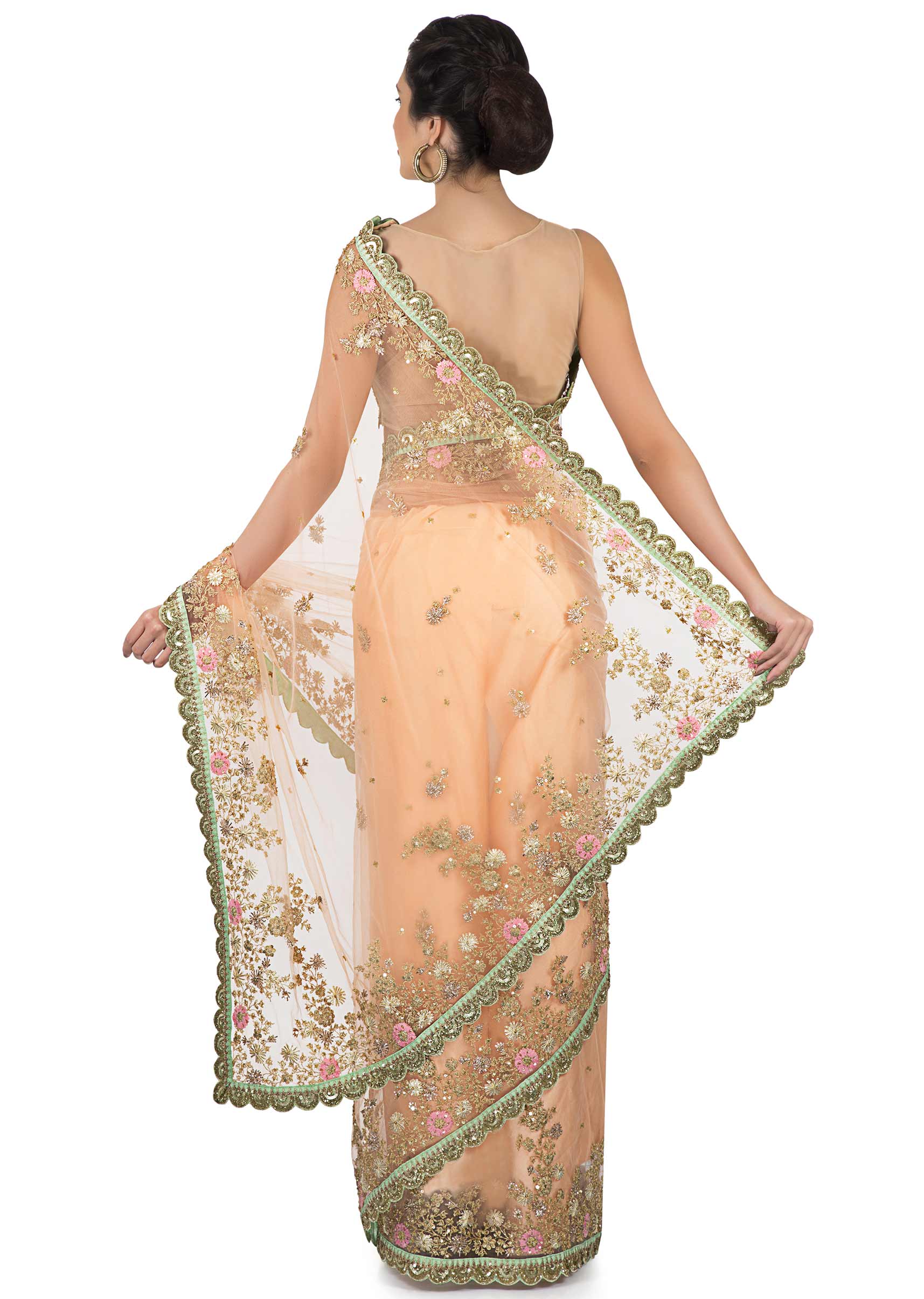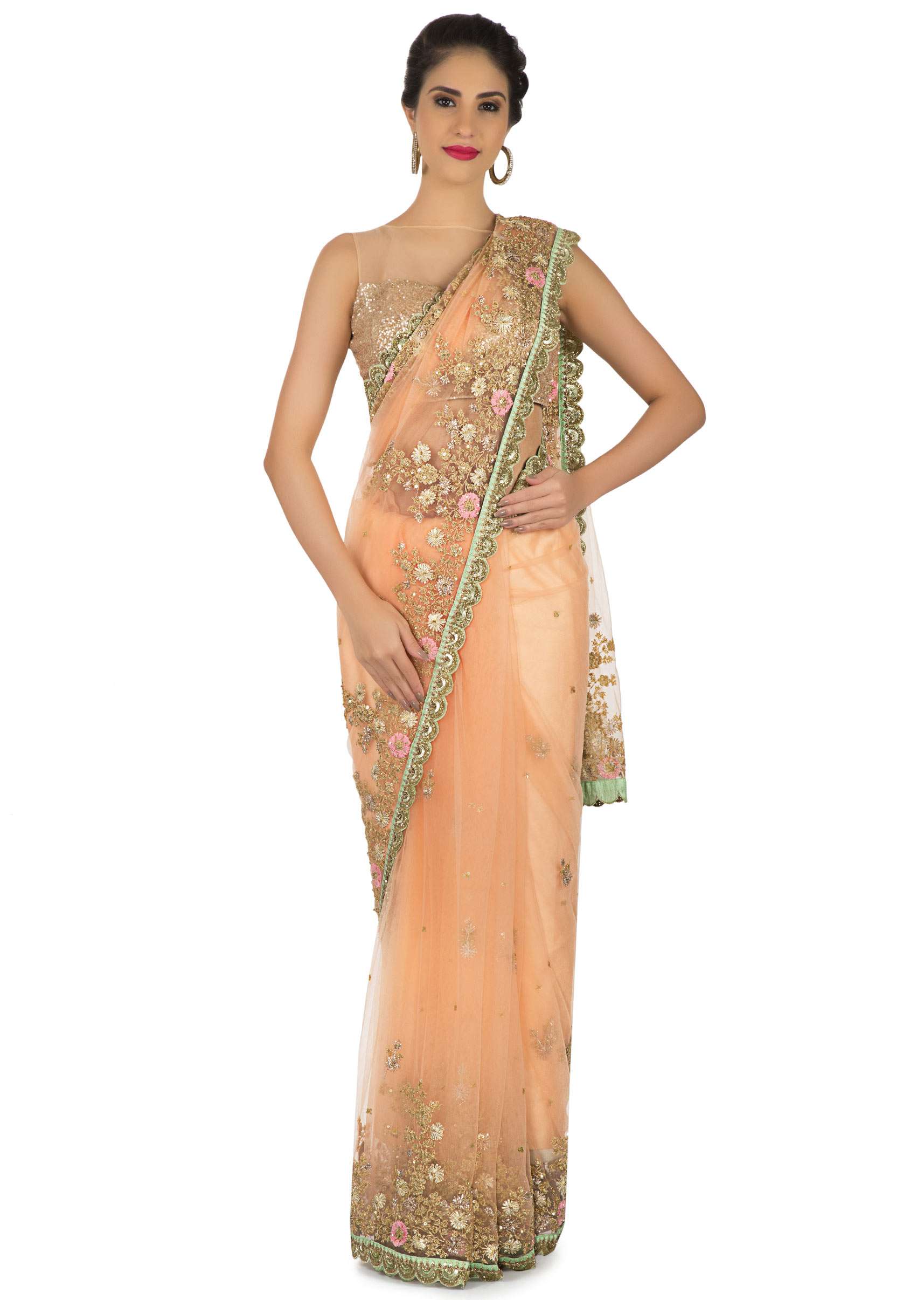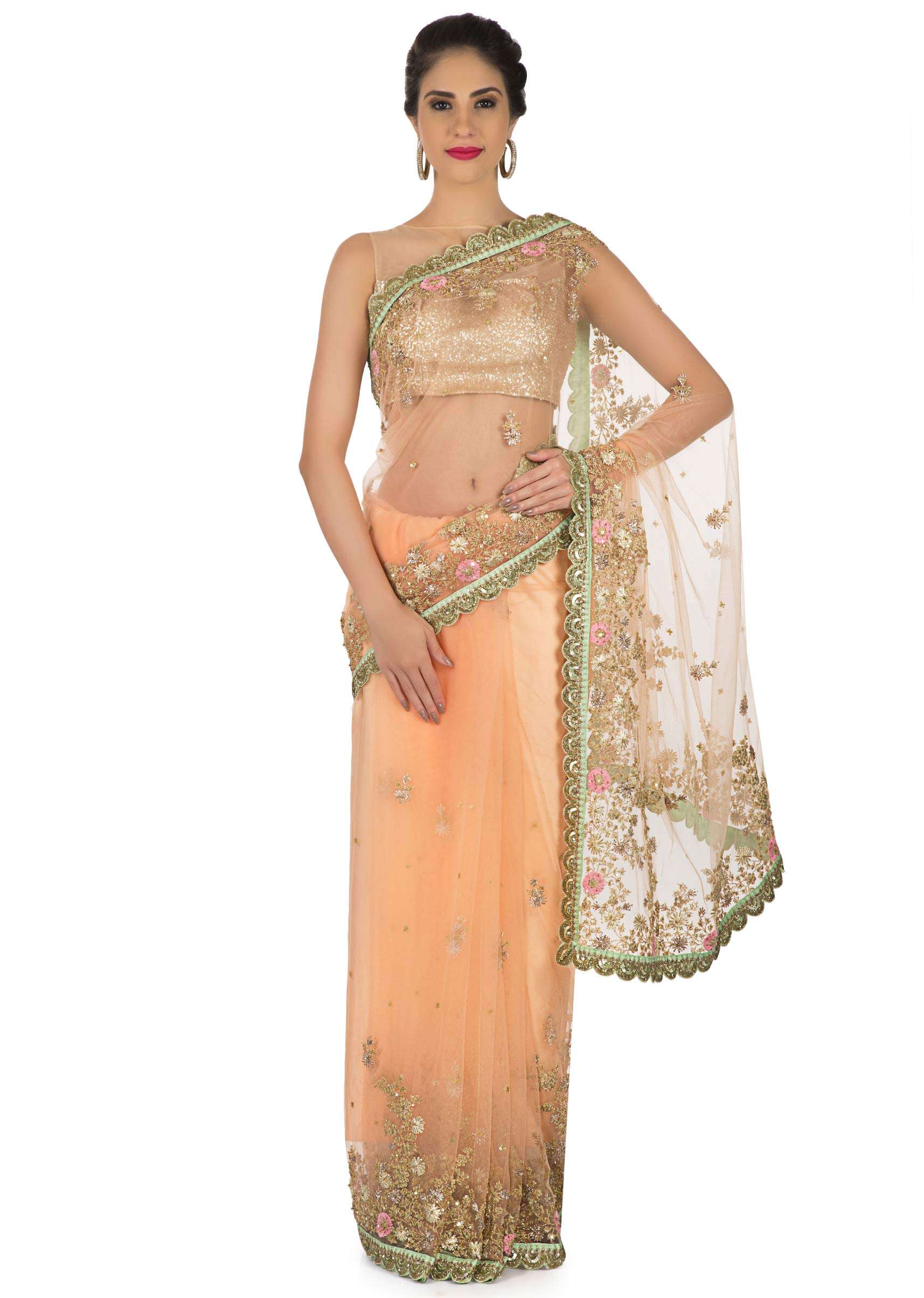 Light Peach Saree In Resham And Gotta Lace Work Online - Kalki Fashion