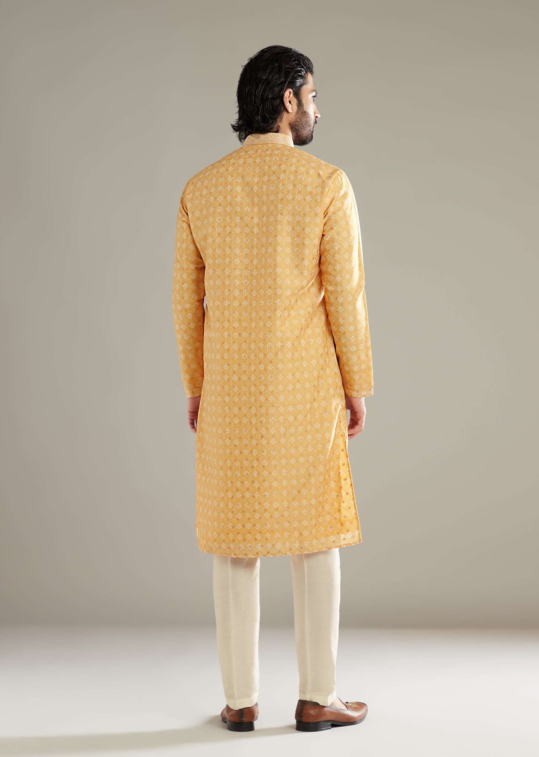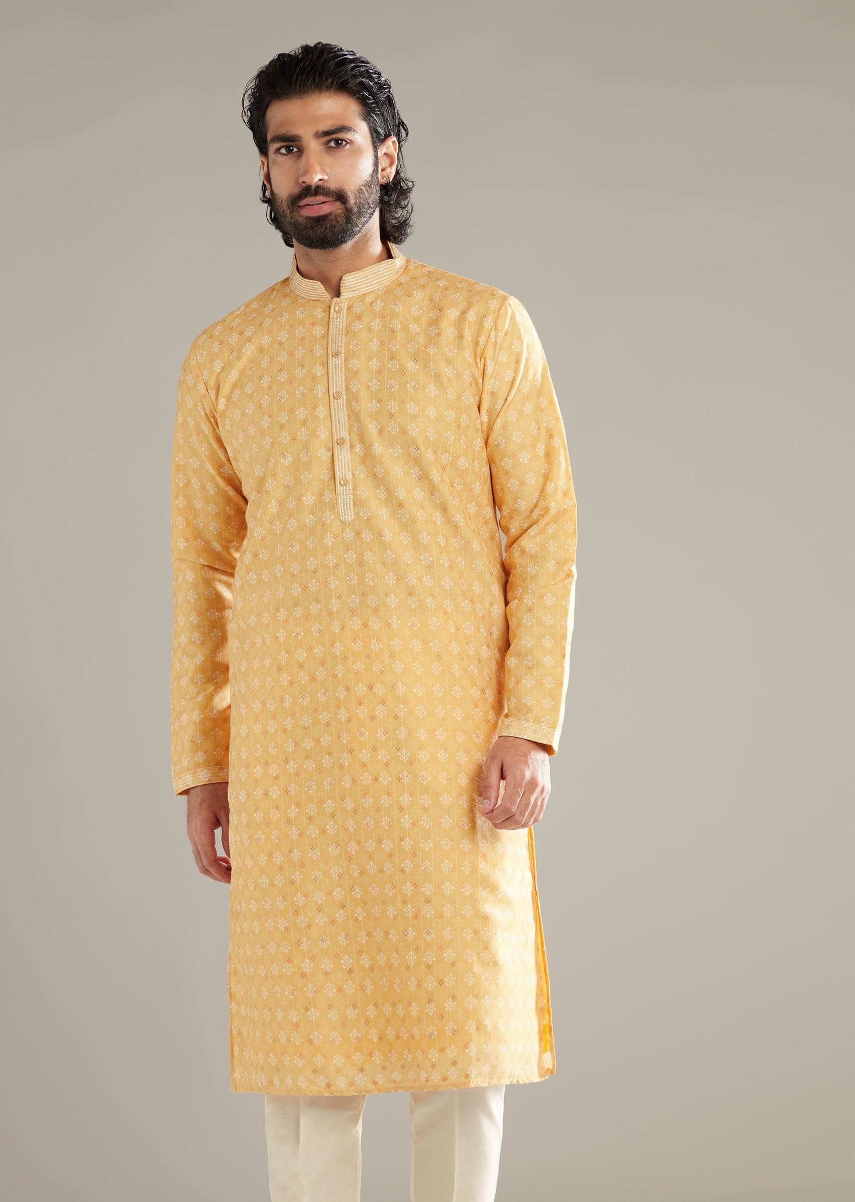 Light Yellow Silk Kurta Set For Men With Printed Motifs