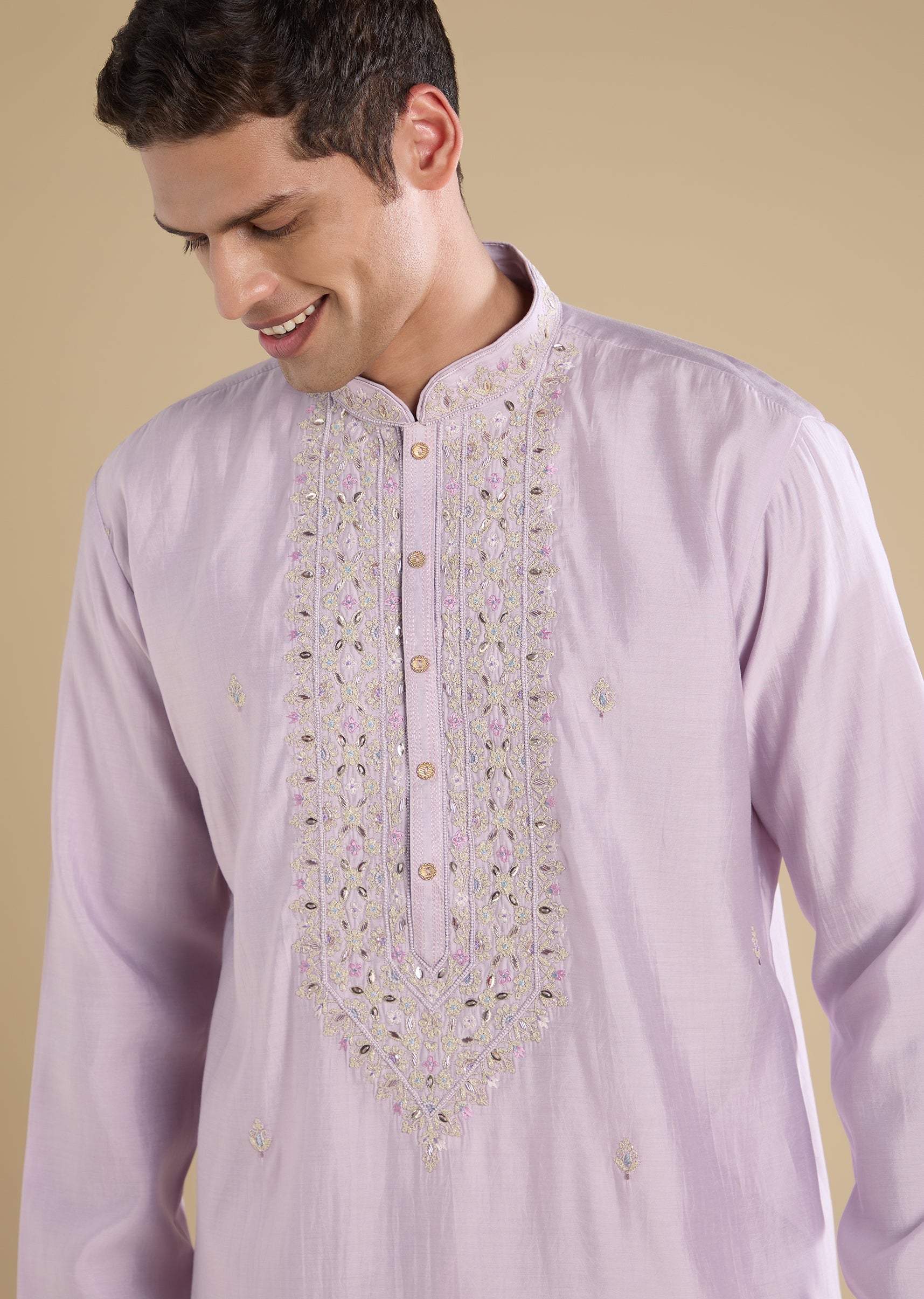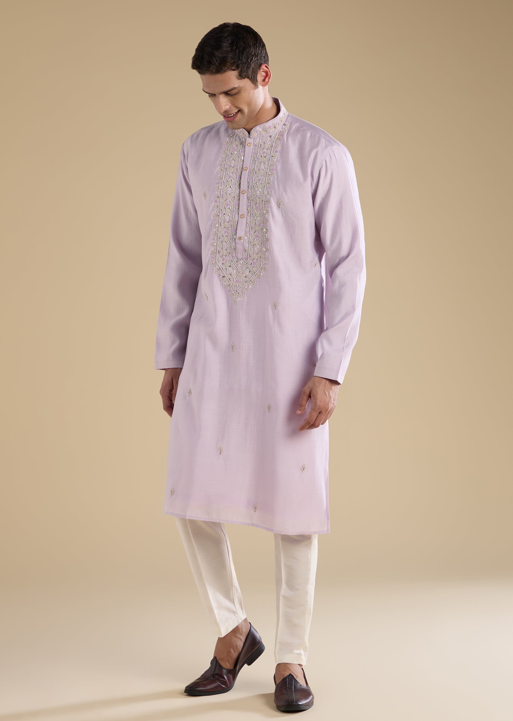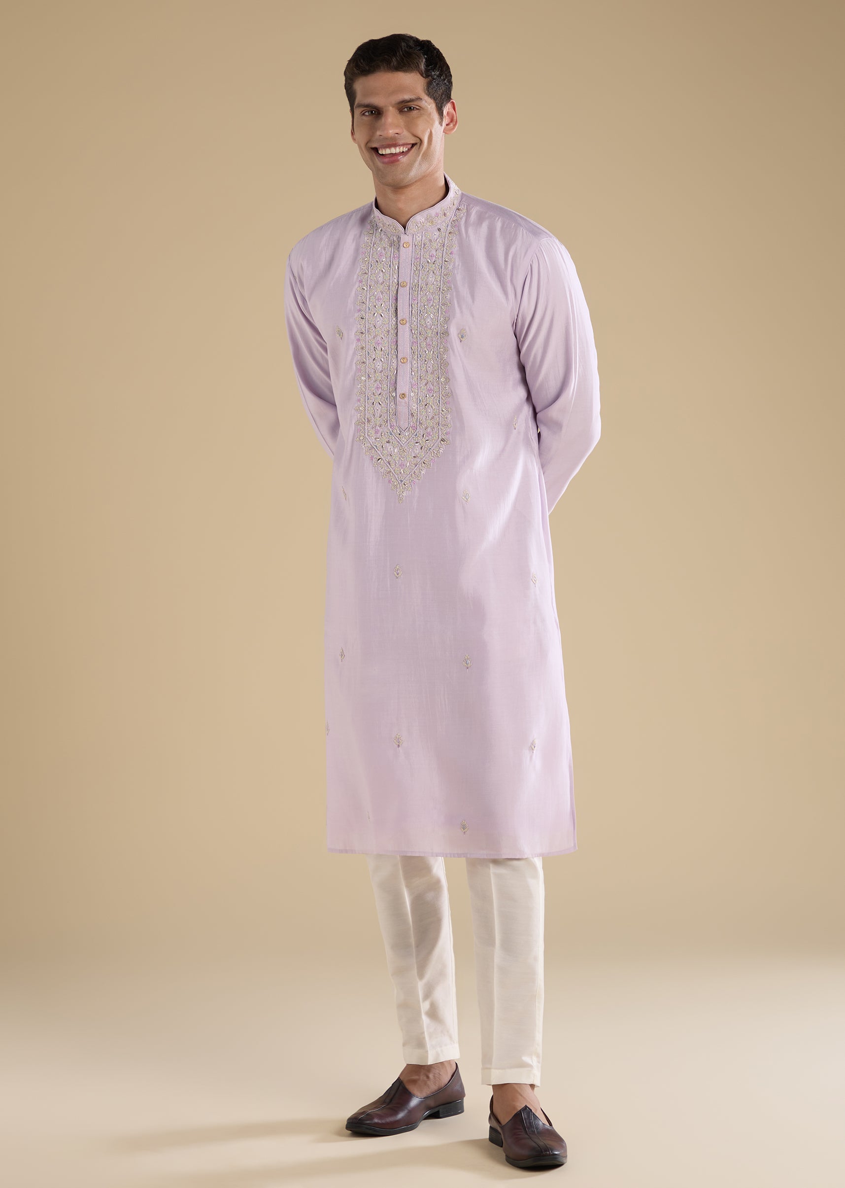 Crafted in art silk, this lilac kurta set features subtle thread embroidery. Designed with a mandarin collar, full sleeves and front button with hook-eye closure, it is paired with straight-fit... More Product Details