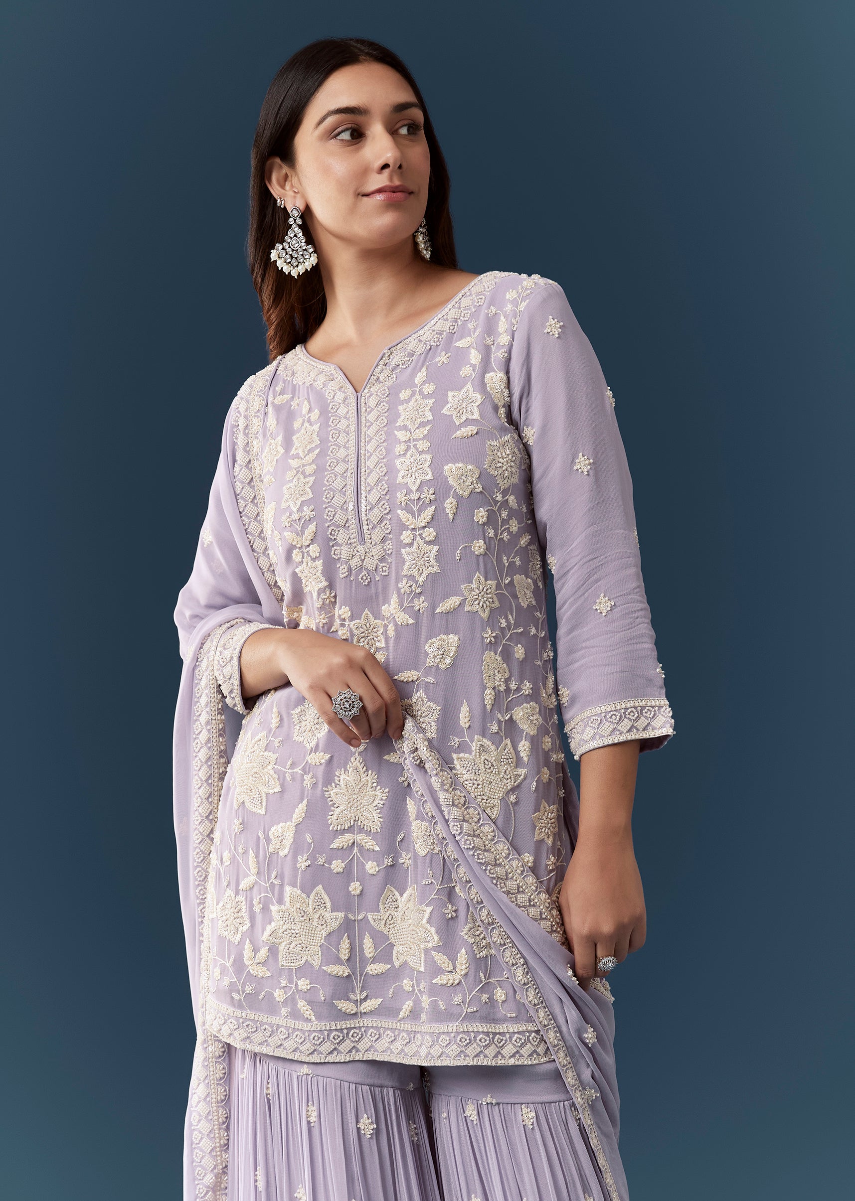 A gentle touch of elegance defines this lilac georgette kurta set, beautifully embellished with delicate bead accents and resham embroidery that add a subtle festive sheen. The three fourth sleeve... More Product Details
