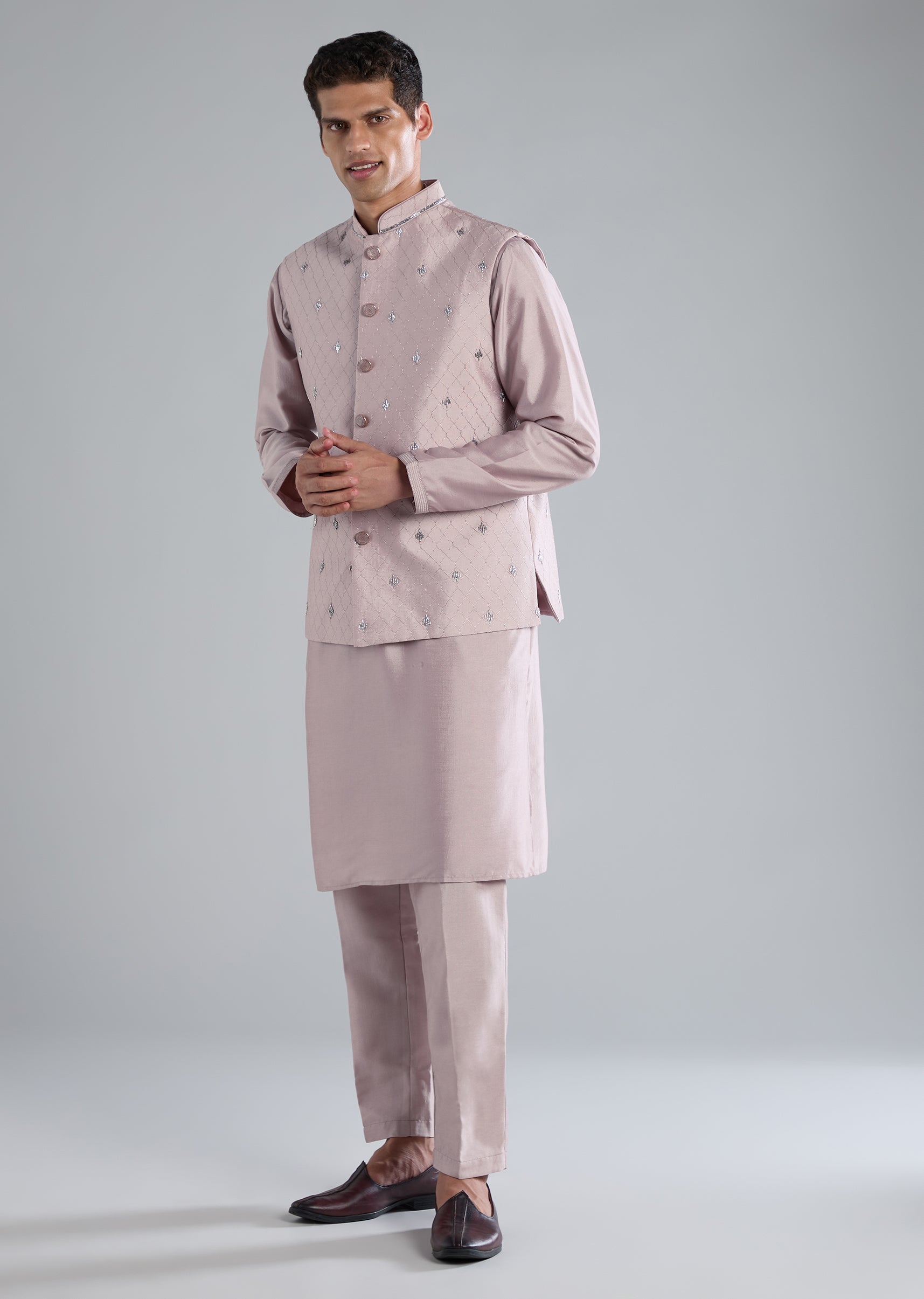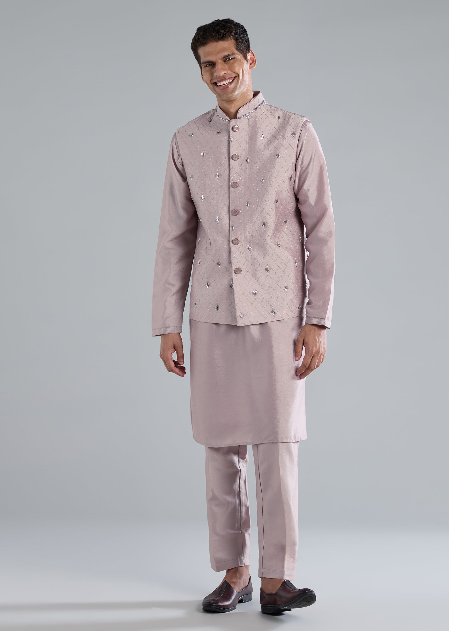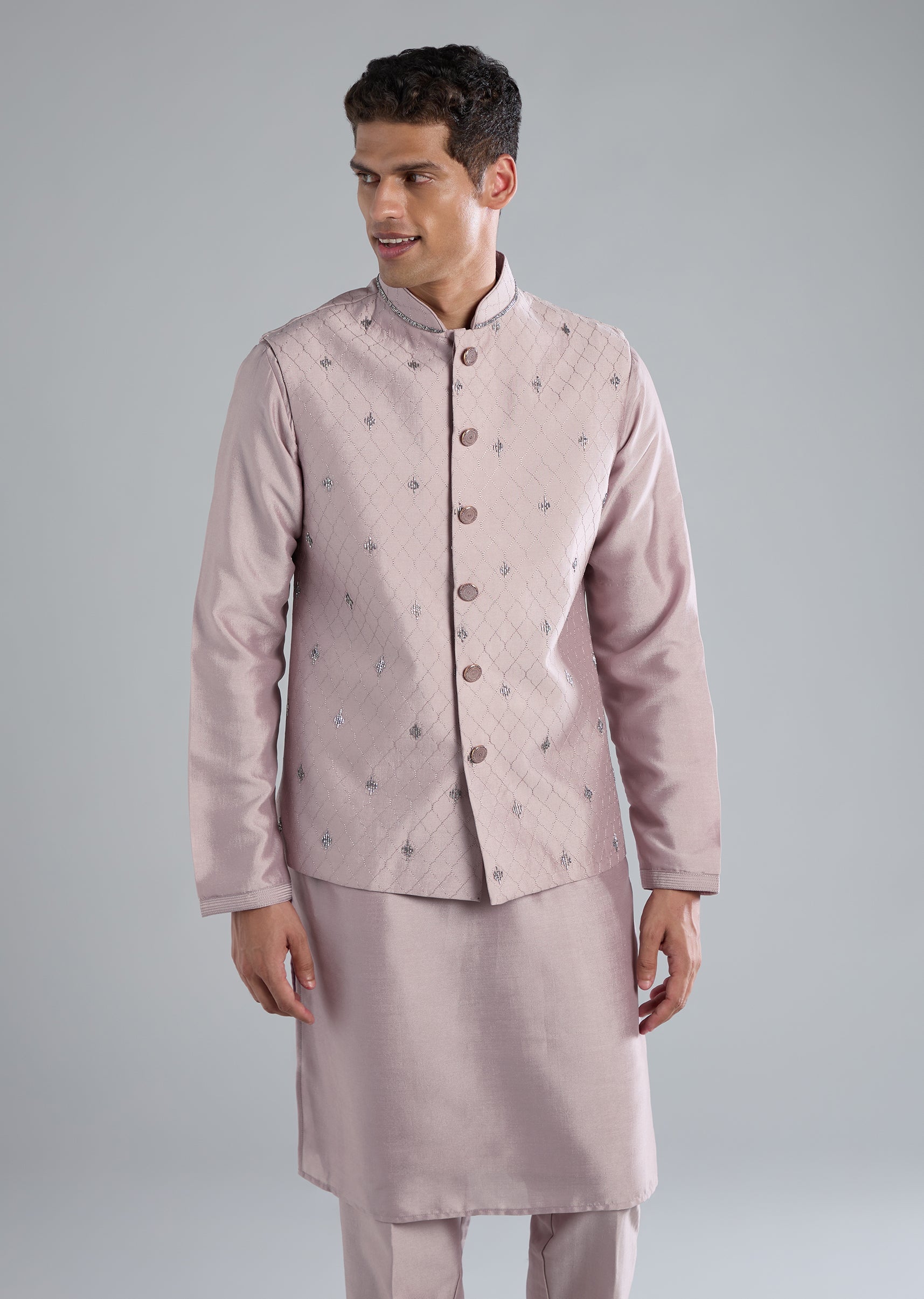 Soft, pastel, and effortlessly elegant, this lilac kurta jacket set is crafted with silk as the primary fabric and art silk as the secondary base for a smooth and refined finish. The jacket features intricate cut dana detailing that adds a hint of shimmer and festive charm. Full sleeves and a mandarin collar give the ensemble a sharp and structured appeal. The kurta comes with front button closure, while the bottoms are finished with a front hook eye fastening for ease and comfort. Perfect for pastel themed events, intimate celebrations, or daytime festivities. Slight variation in color is possible due to photography. Awarded as the Most Trusted Brand, we're delivering styles you love, just as promised.