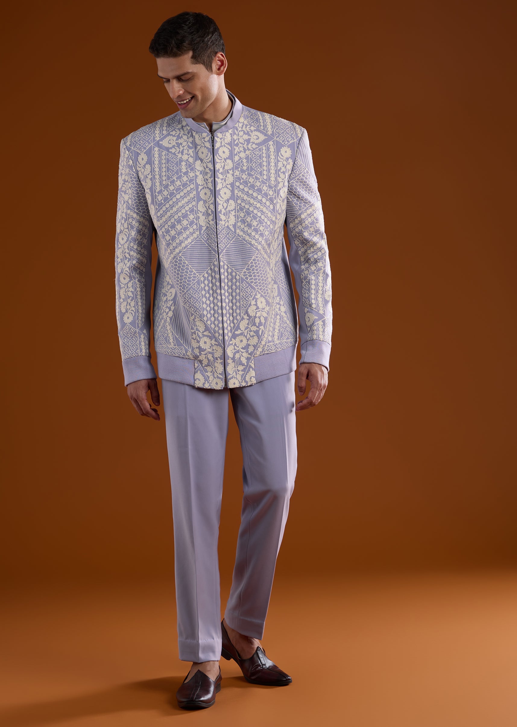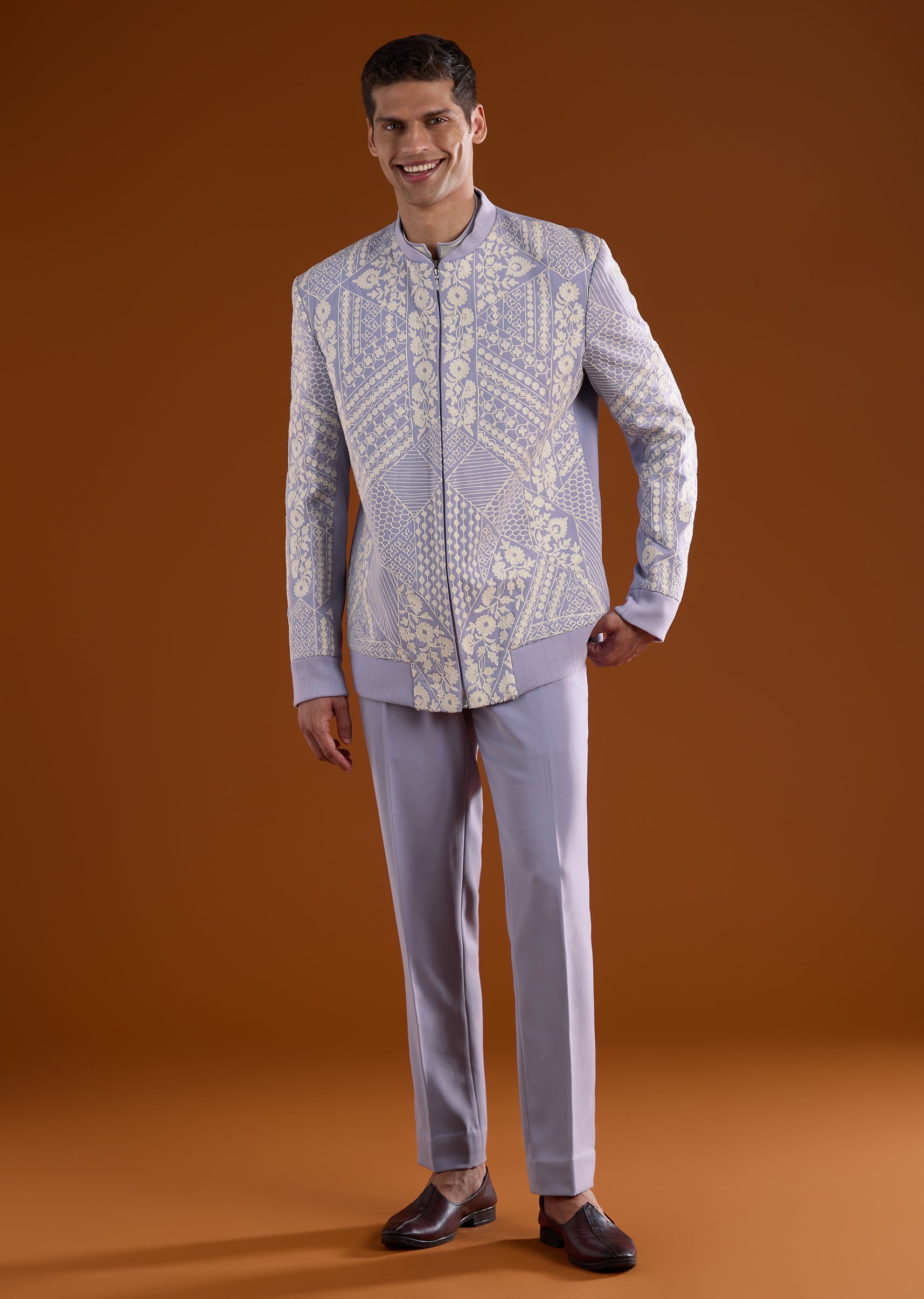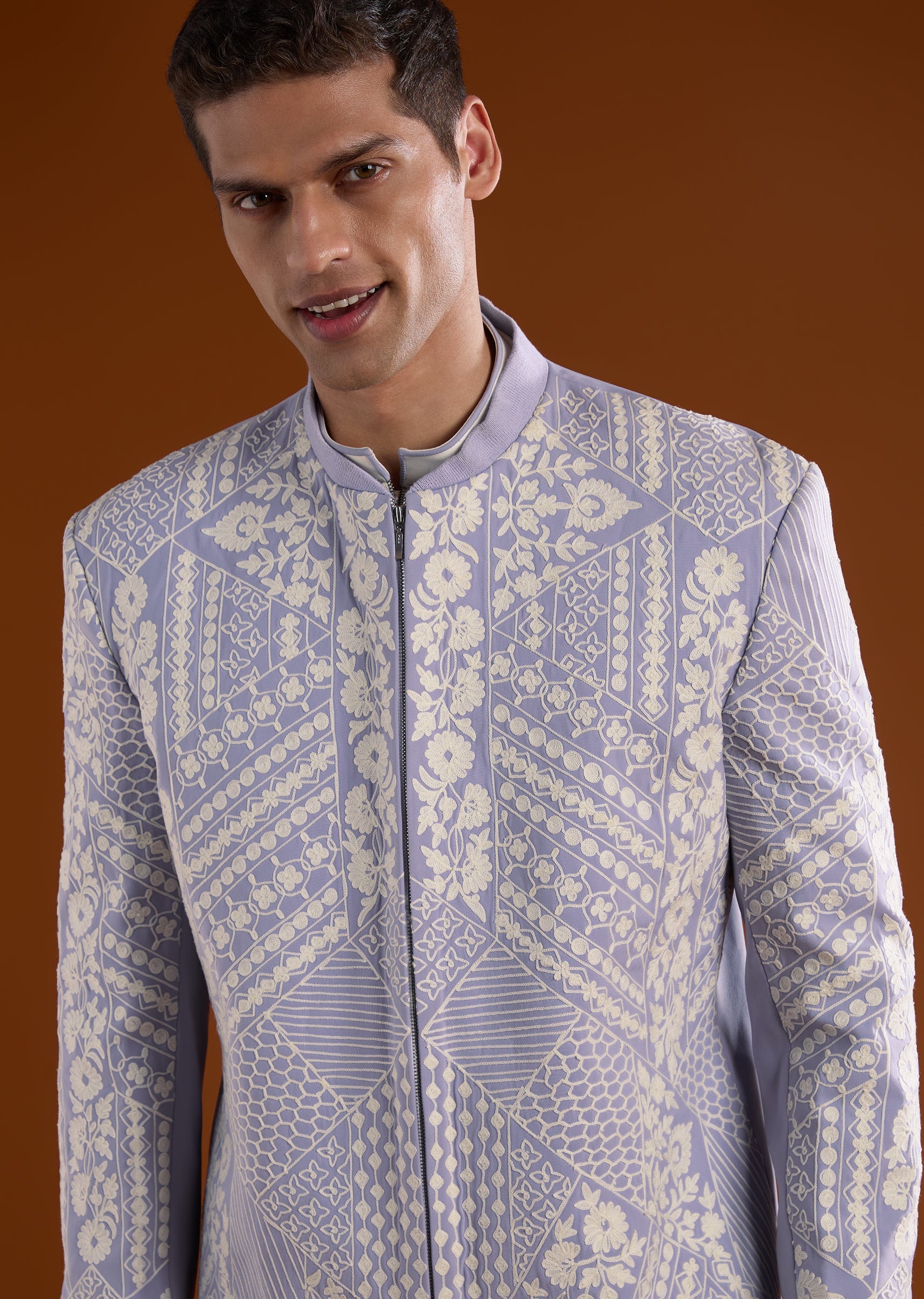 Soft yet celebratory, this lilac kurta jacket set is ideal for engagement, reception, and mehendi functions. Highlighted with delicate thread detail work, it delivers a graceful festive appeal. The full sleeves and mandarin collar give the ensemble a refined silhouette, perfect for groomsmen seeking a subtle standout look. Awarded as the Most Trusted Brand, we're delivering styles you love, just as promised.