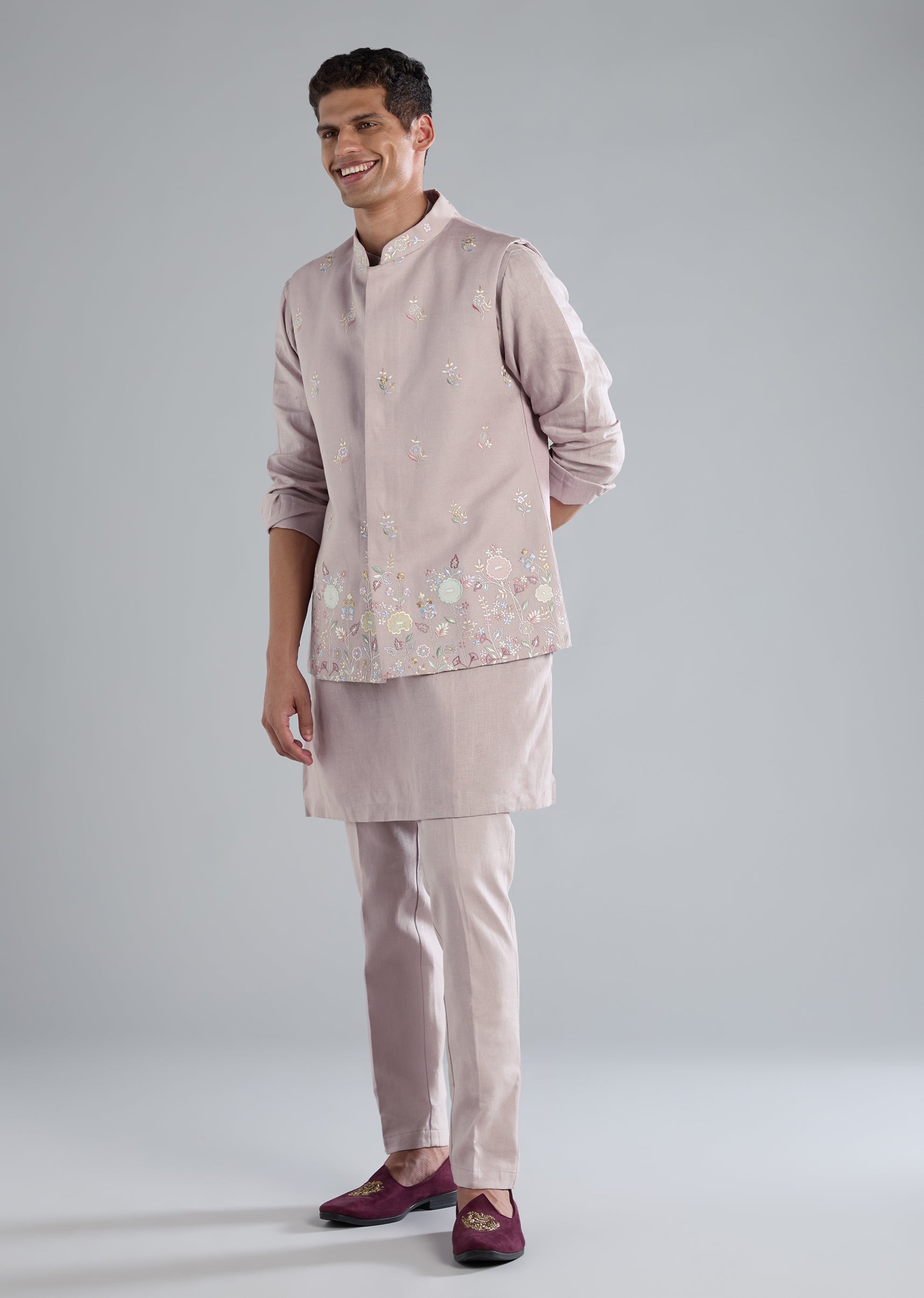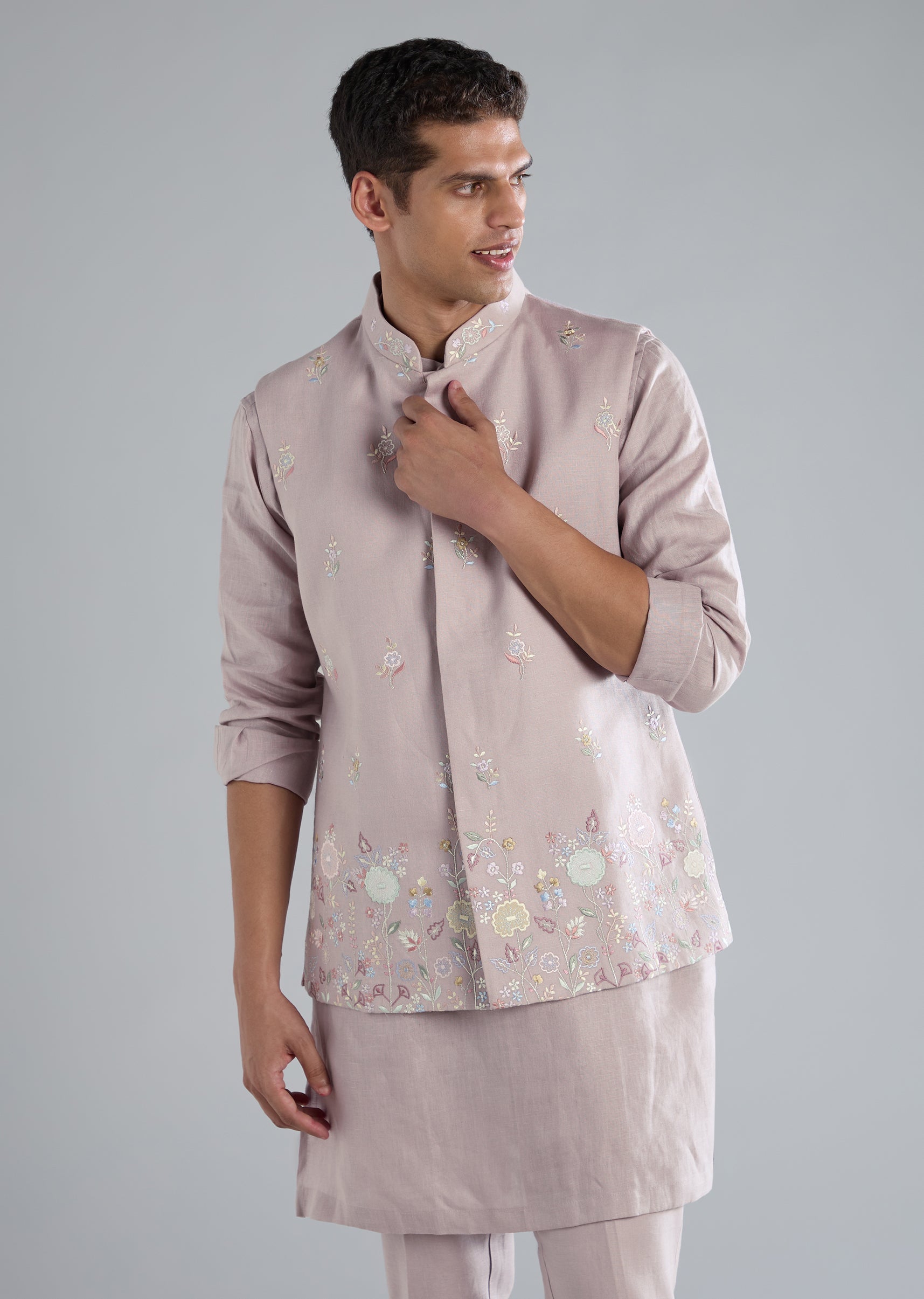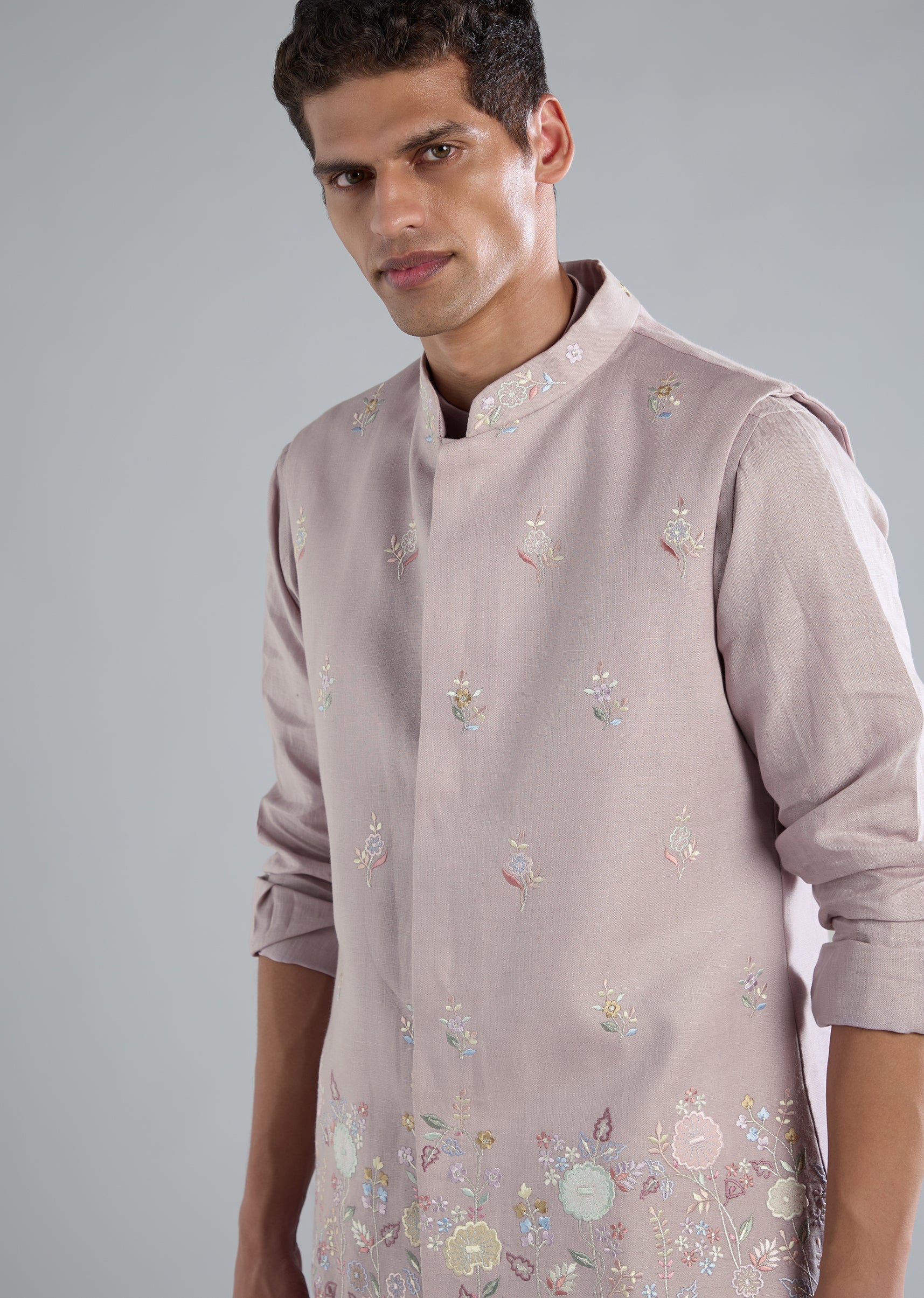 Lilac Linen Kurta Jacket Set With Thread Resham Work