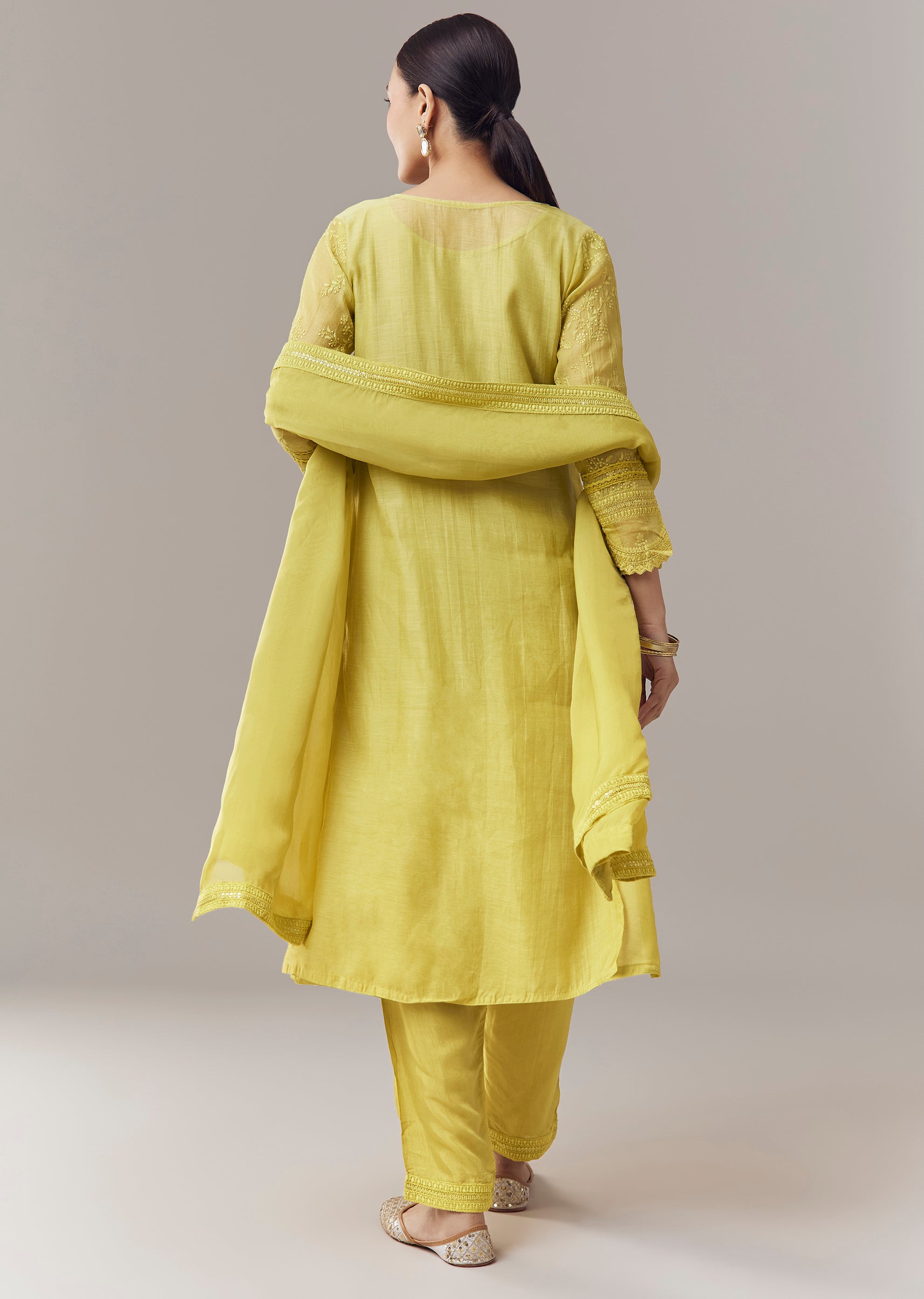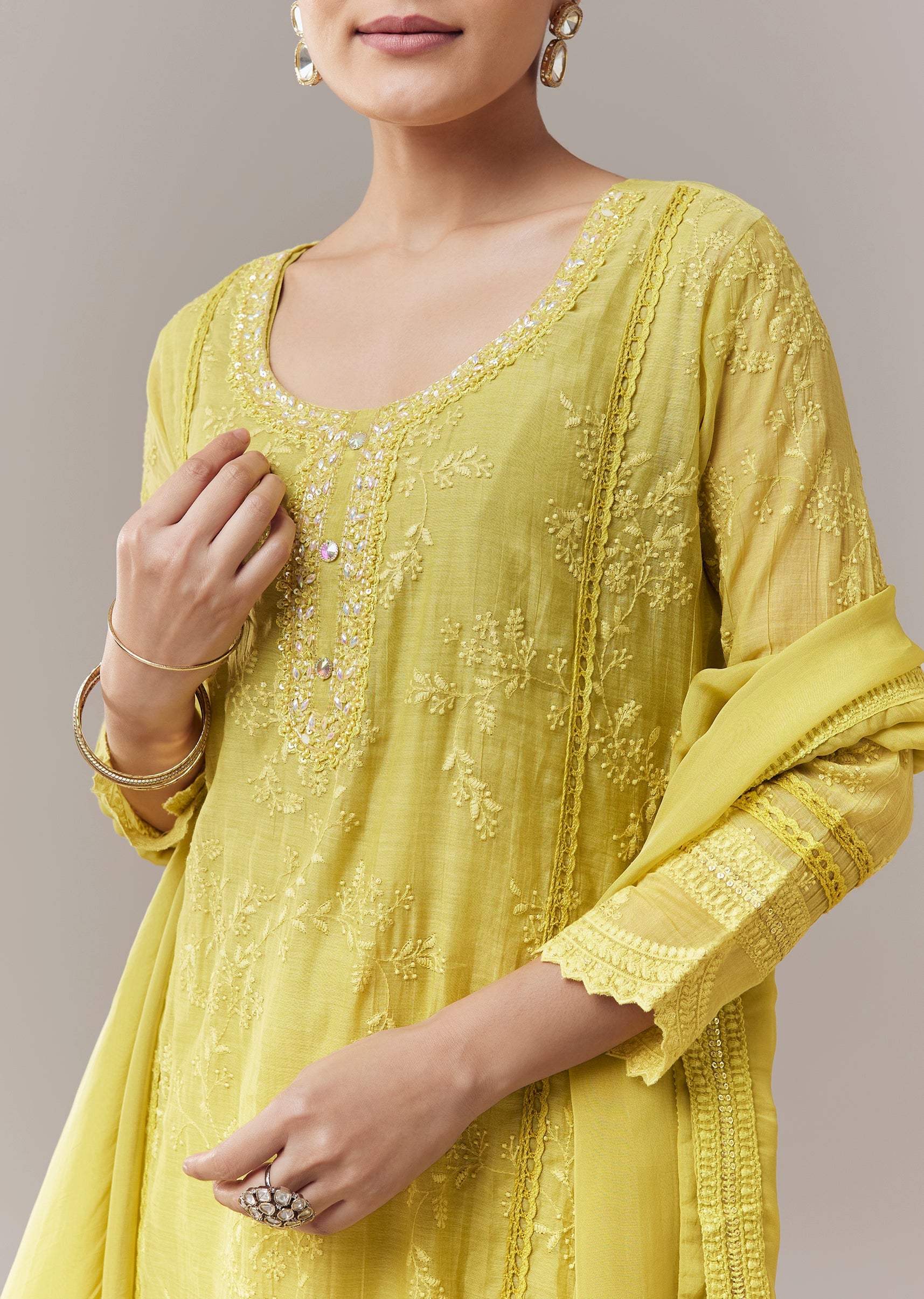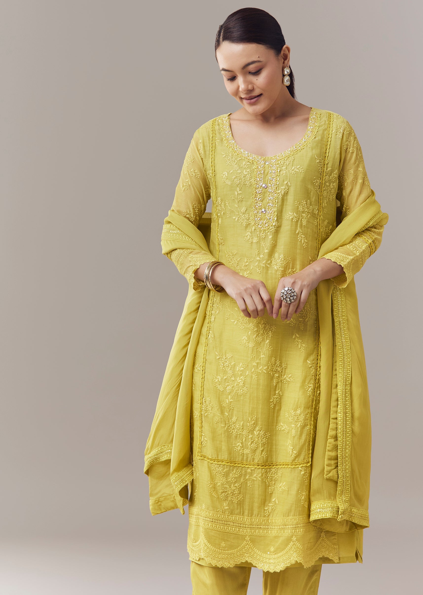 Lime Green Pakistani Style Kurta Set With Embroidery And Dupatta