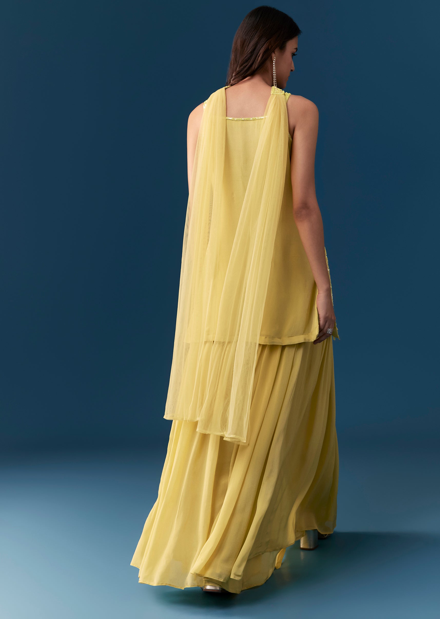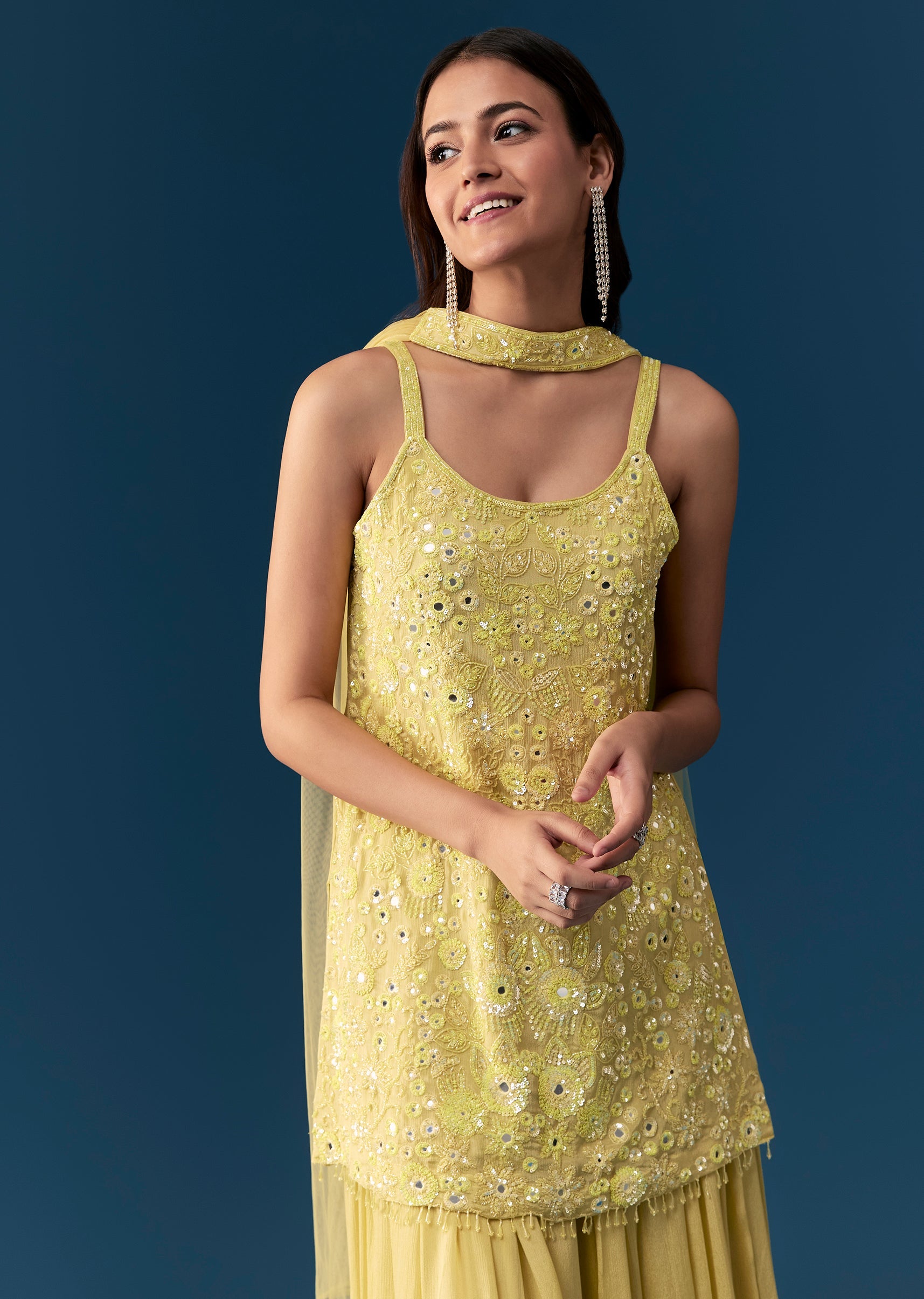 Make a vibrant statement with this pastel lime green palazzo set, perfect for bridesmaids at haldi, engagement, or reception functions. Crafted from soft chinon fabric, the kurta features intricate mirror,... More Product Details