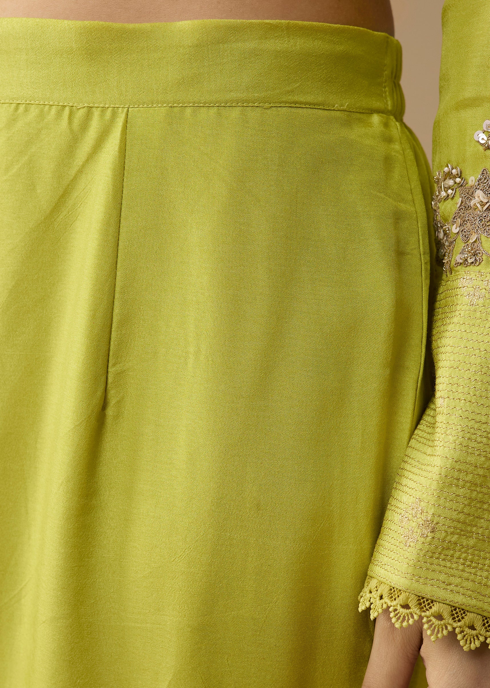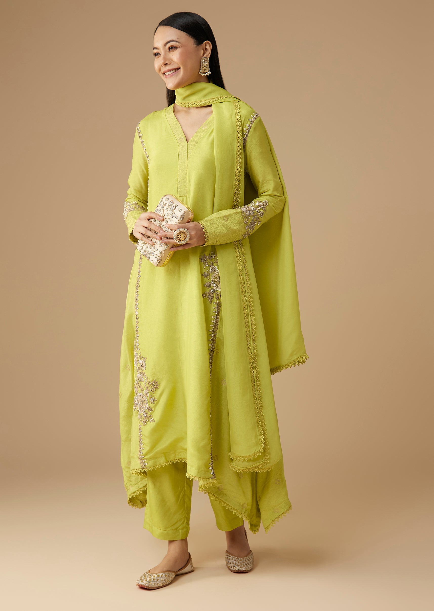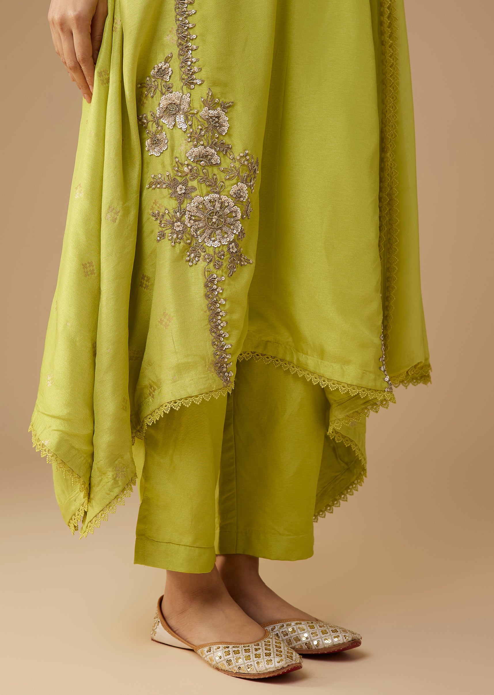 Illuminate any celebration with this lime green silk anarkali set, featuring exquisite zardosi and sequin work that adds depth and a festive glow. The rich silk fabric enhances the outfit... More Product Details
